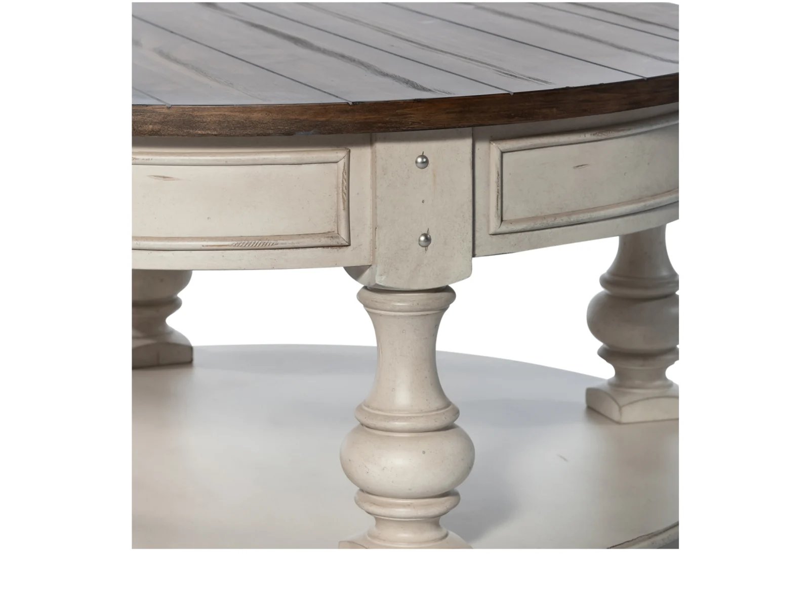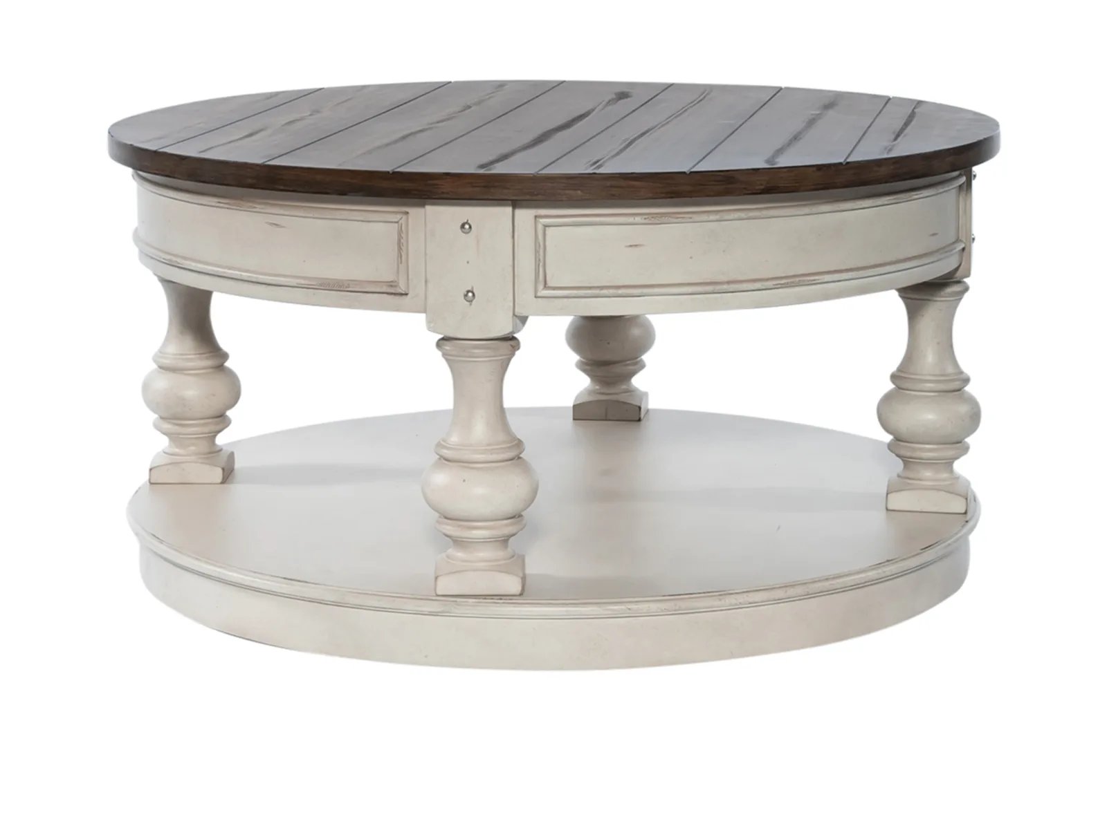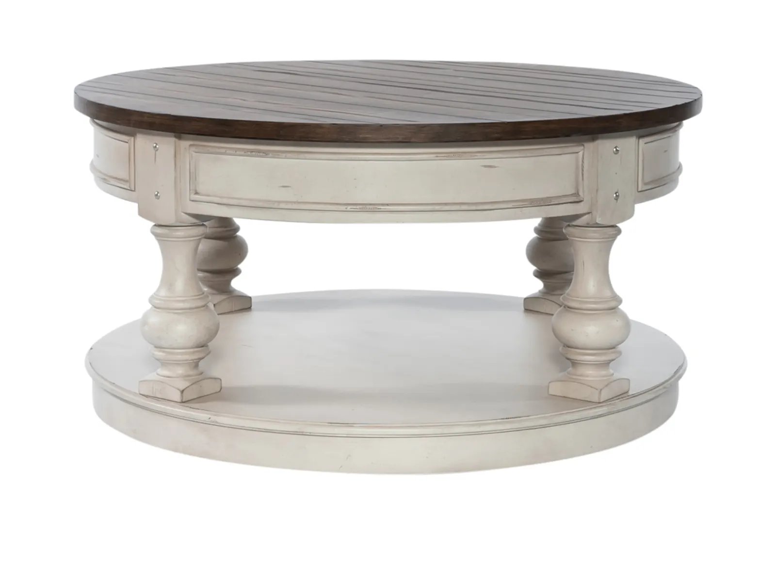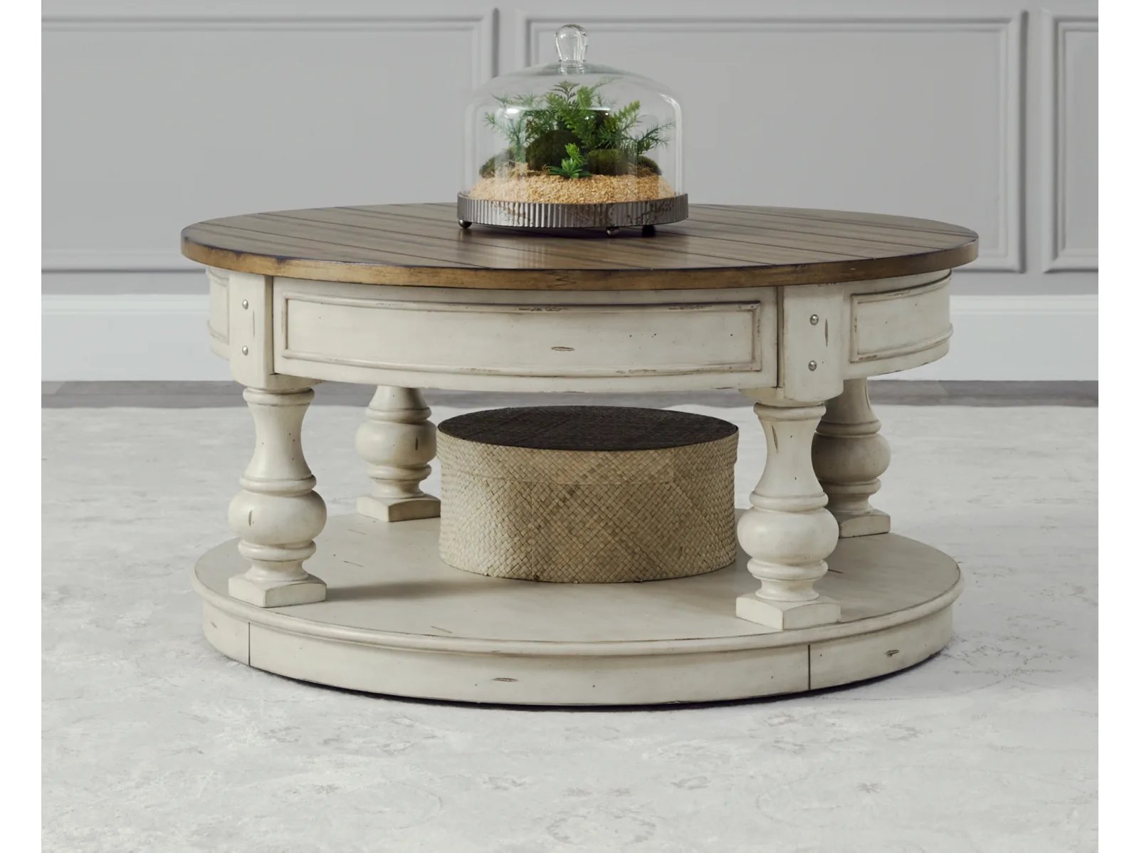 & Free ShippingEnjoy a game night with friends around the Middleton Round Coffee Table. Crafted of poplar solids with pine and birch veneers, this piece features an antique white finish with spatter and watermark accents with a wire brushed tobacco planked top, appealing pewter nail head corner accents, a bottom shelf for additional storage, casters for easy movability, anchored by round turned legs. This warm and luxurious cocktail table would make a great addition to any traditional home.
