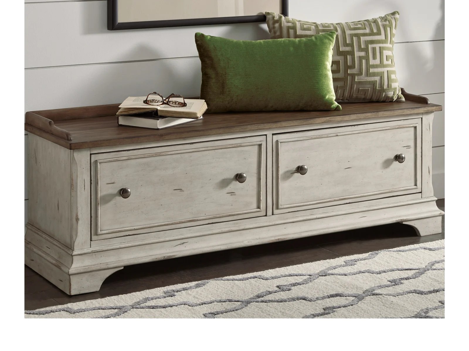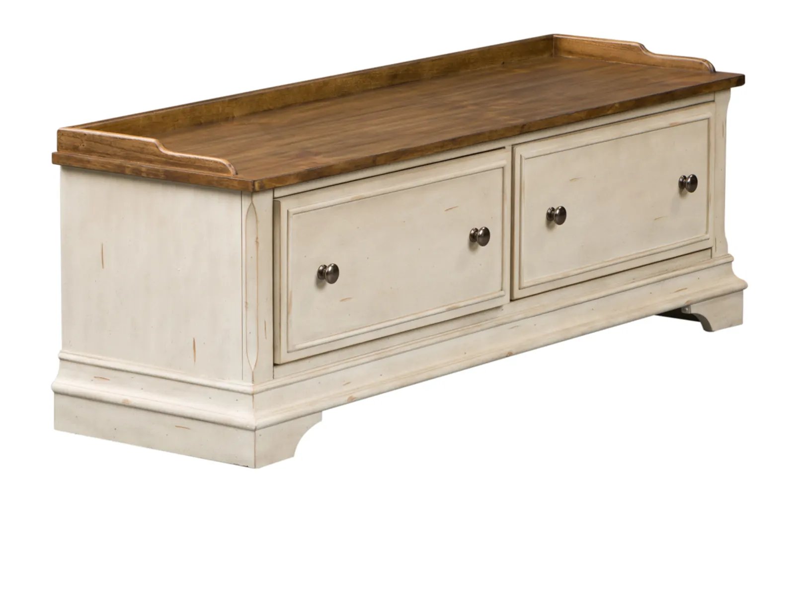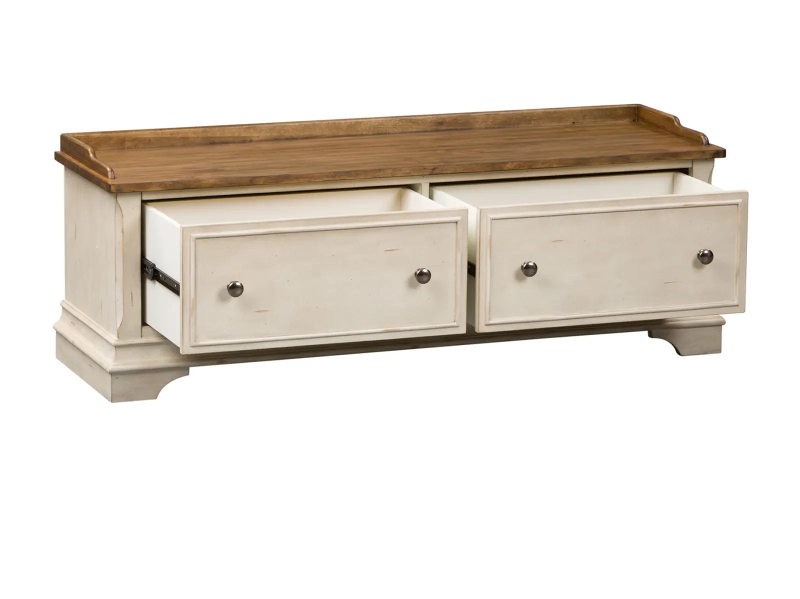 Middletown storage hall bench is a warm welcome to an entry hall, mud room or family room. Two spacious full extension drawers provide concealed storage while keeping your room tidy. Crafted of poplar solids with pine and birch veneers. Added design elements with bead molding on the drawer and gallery rail runs along the side and back of the top. Features an antique white finish with a wire brushed tobacco top.