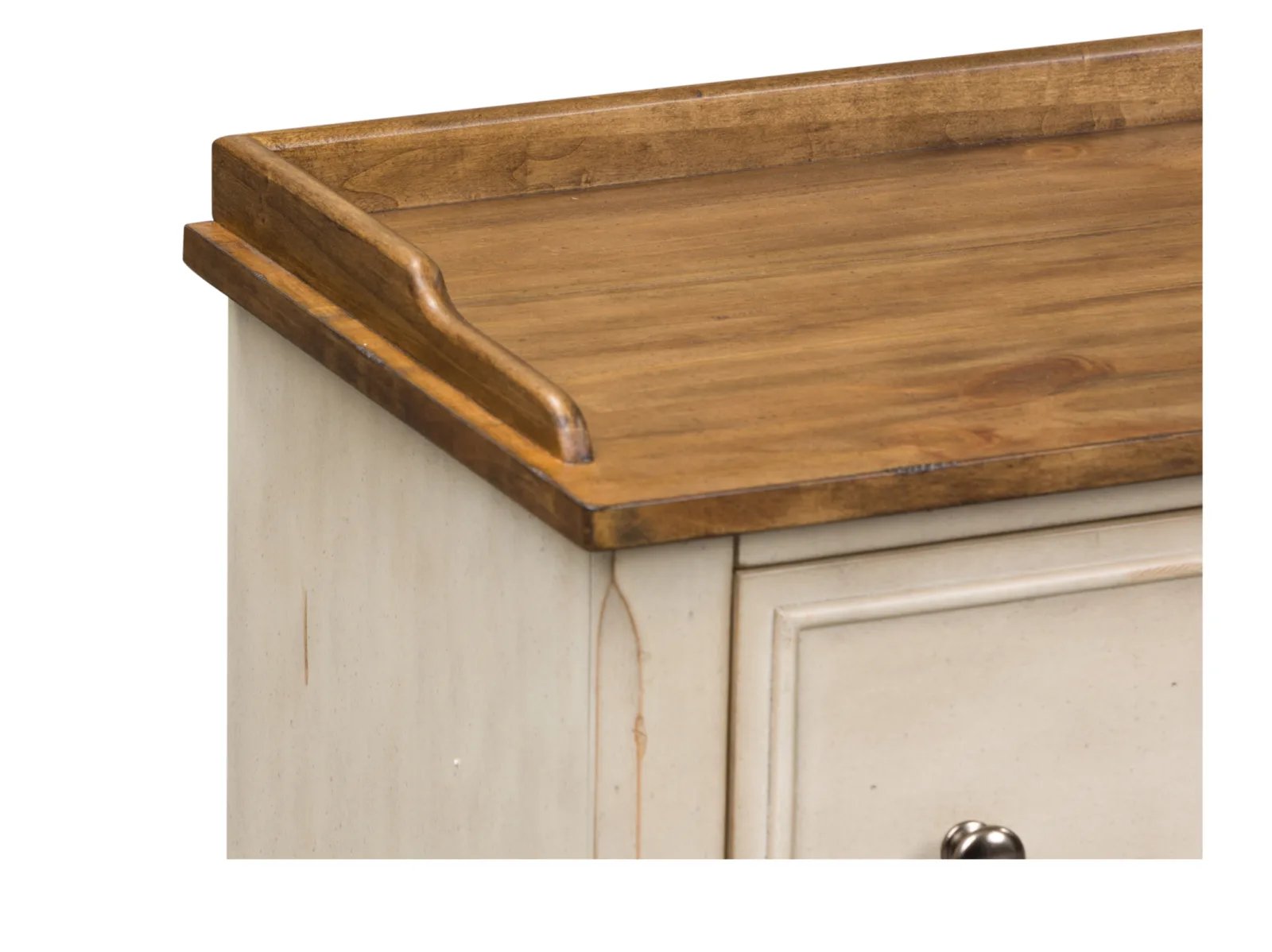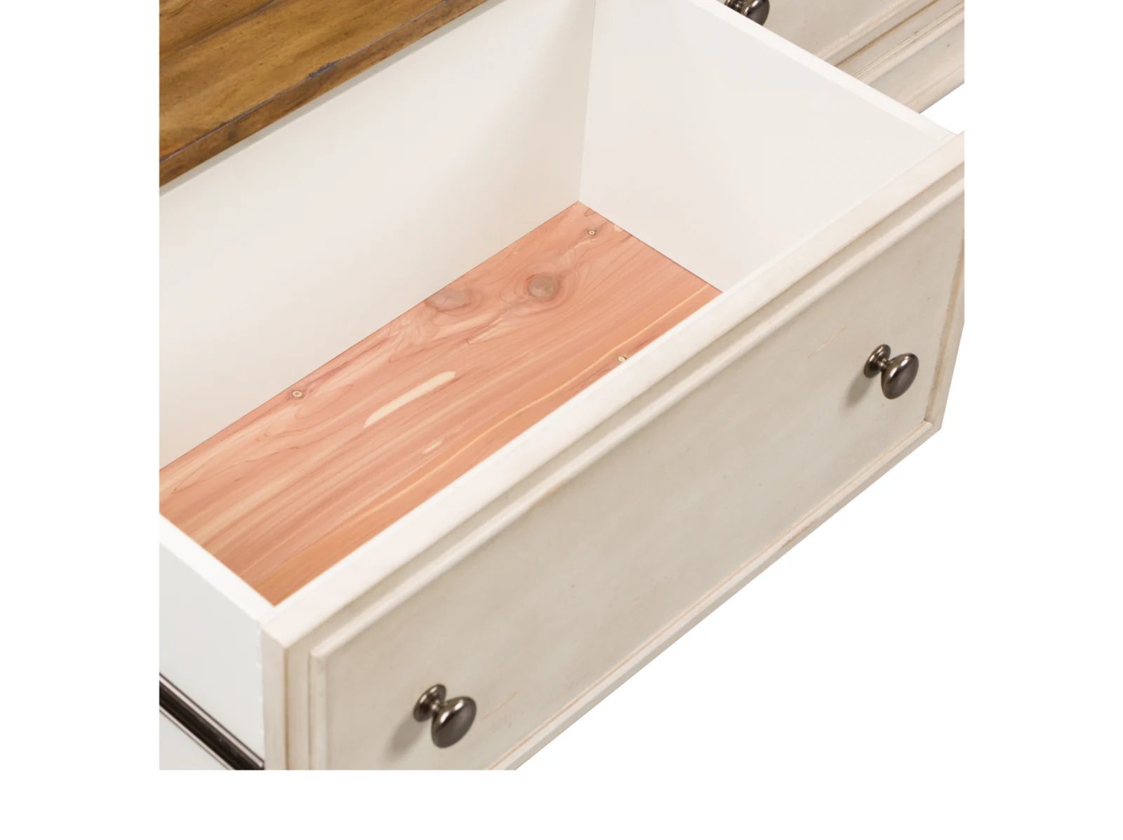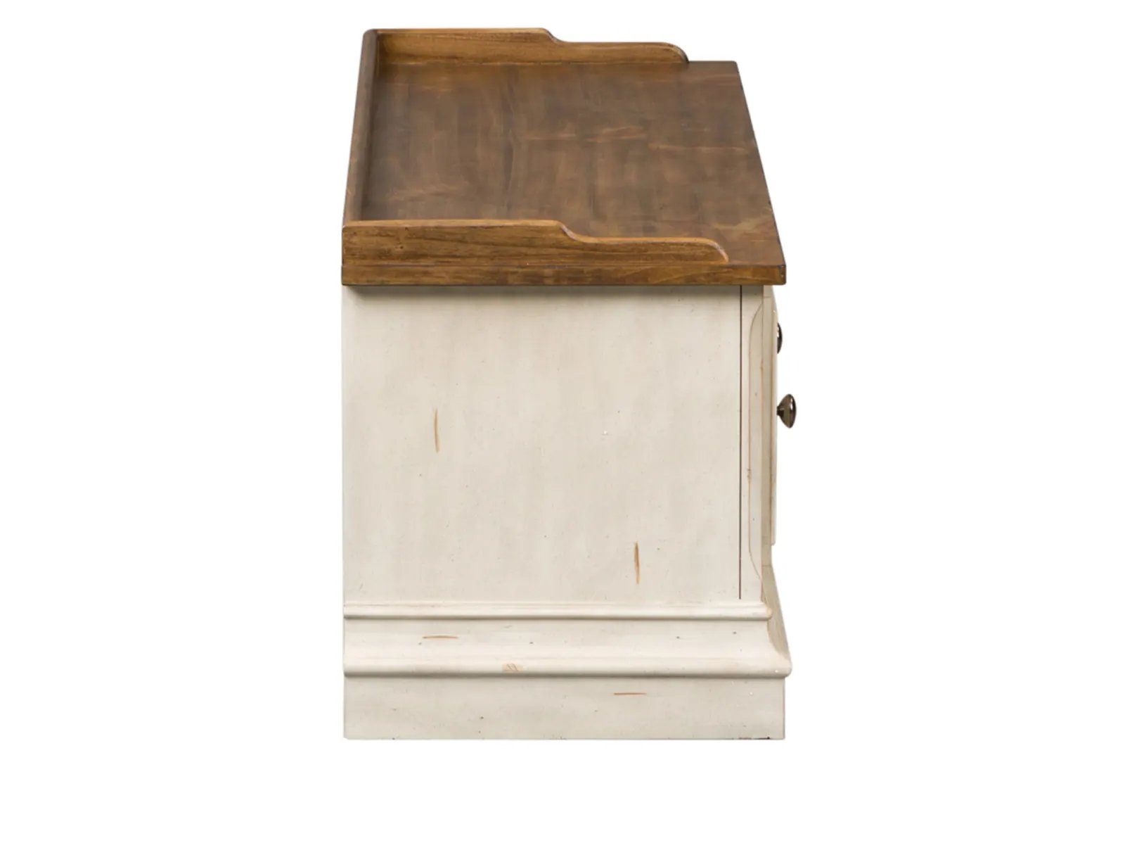 Middletown storage hall bench is a warm welcome to an entry hall, mud room or family room. Two spacious full extension drawers provide concealed storage while keeping your room tidy. Crafted of poplar solids with pine and birch veneers. Added design elements with bead molding on the drawer and gallery rail runs along the side and back of the top. Features an antique white finish with a wire brushed tobacco top.