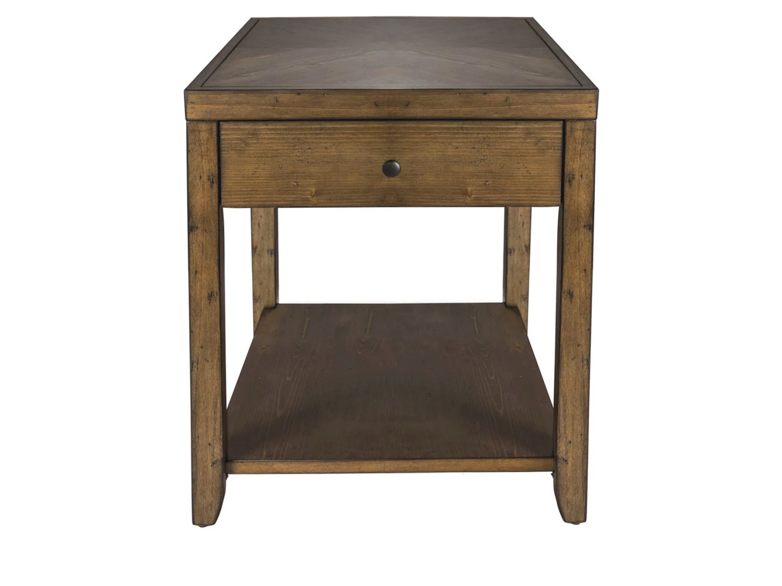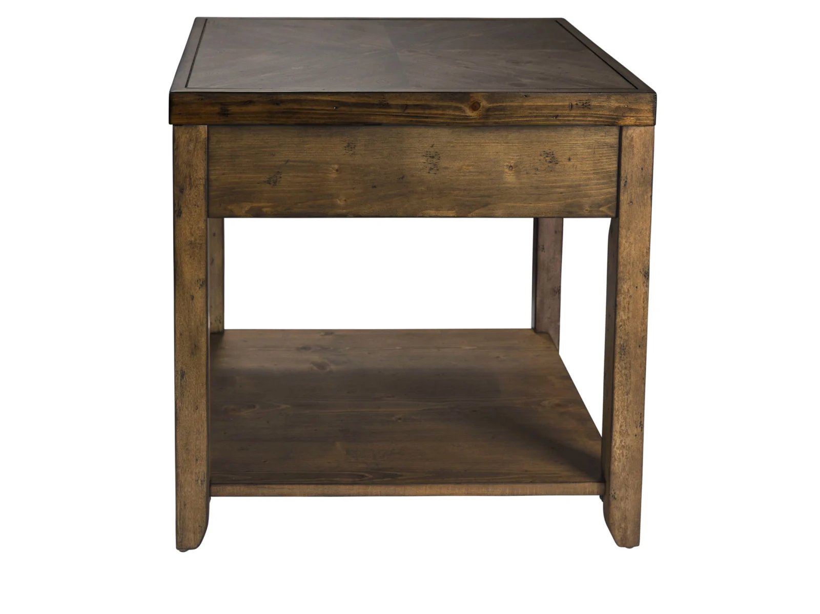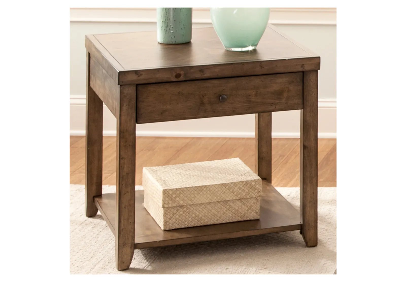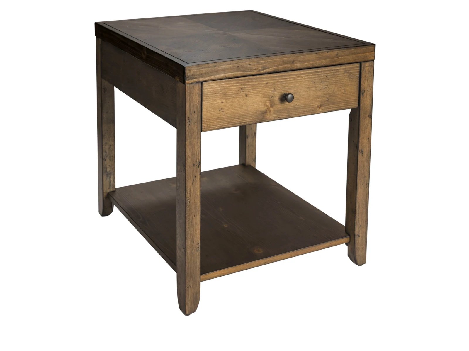 & Free ShippingAccent your space with the Motley End Table. Crafted of poplar solids and cedar veneers, this piece features a nutmeg finish, four-way fancy face veneer top, one fully stained drawer accented with appealing antique brass knob hardware, and one bottom shelf for additional storage, anchored by block tapered legs. This simple yet sophisticated end table will make a great addition to your home.