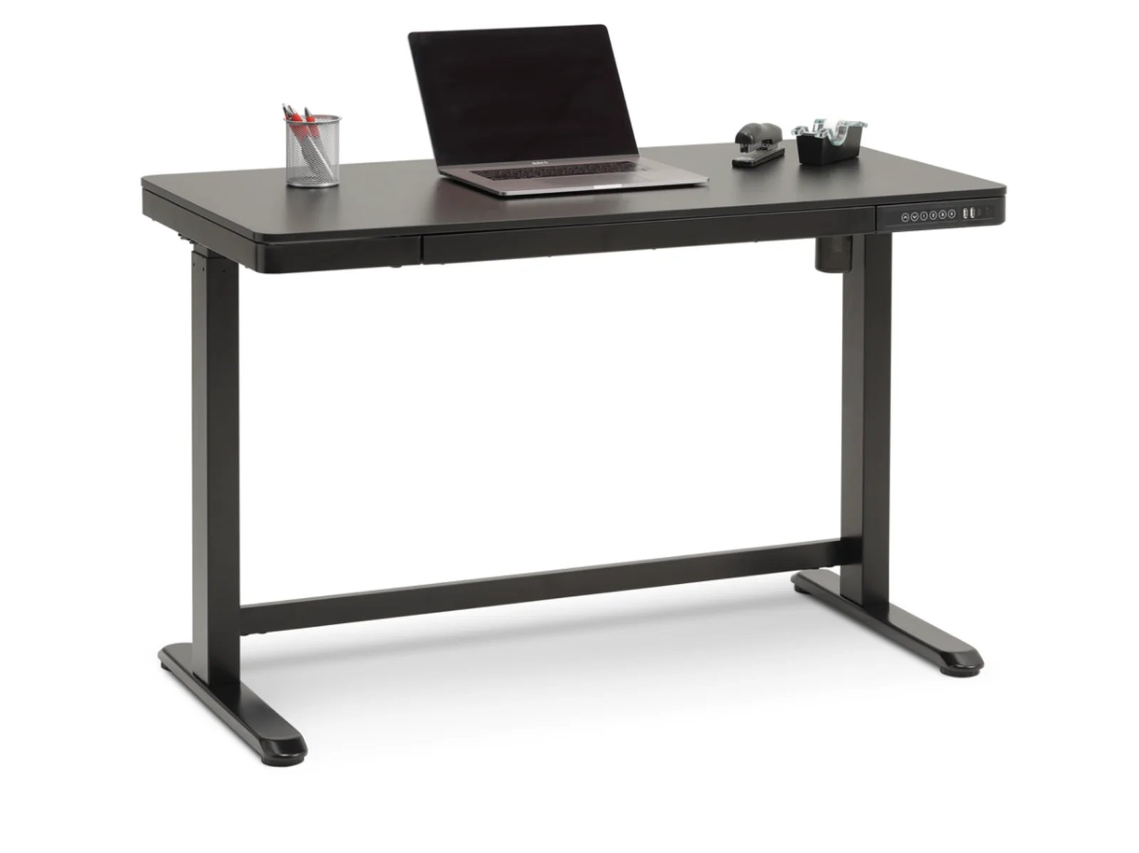 The Mountain View Sit and Stand Desk is a great example of innovative design and modern functionality. This stylish motorized desk offers the flexibility of working while sitting or standing, effortlessly adjusting between 29″ to 49″ at the touch of a button. Constructed with a sturdy metal frame, the Mountain View desk features a sleek engineered wood that delivers a contemporary aesthetic with its modern black finish. With the control system conveniently within reach, the Mountain View Sit and Stand Desk makes it easy to enhance your workspace and embrace a healthier, more dynamic lifestyle.