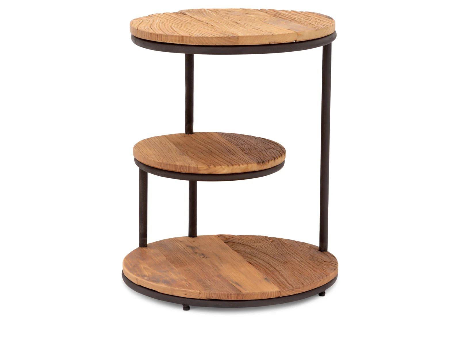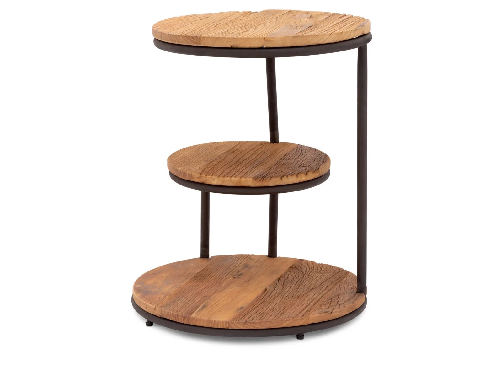 & Free ShippingRecycled elm tabletops and recycled metal unite to create the Multiple Shelf End Table. This handy accent piece is made for your sofa, chair, or bedside and features multi-tiered shelves to display a lamp, collectibles, reading materials, and more. Crafty and industrial, this end table has endless uses!