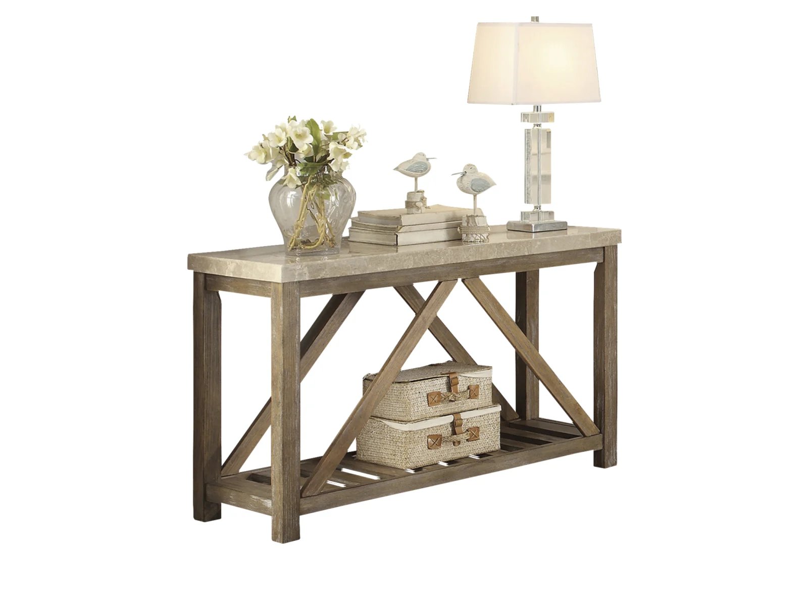 & Free ShippingIndustrial styling is softened by the blending of natural elements to create a stylish look in the Myla Collection. A creamy white stone marble top of the sofa table is supported by the weathered wood finished base of each table – comprised of wood framing that includes display shelving with slat construction and angled supports.