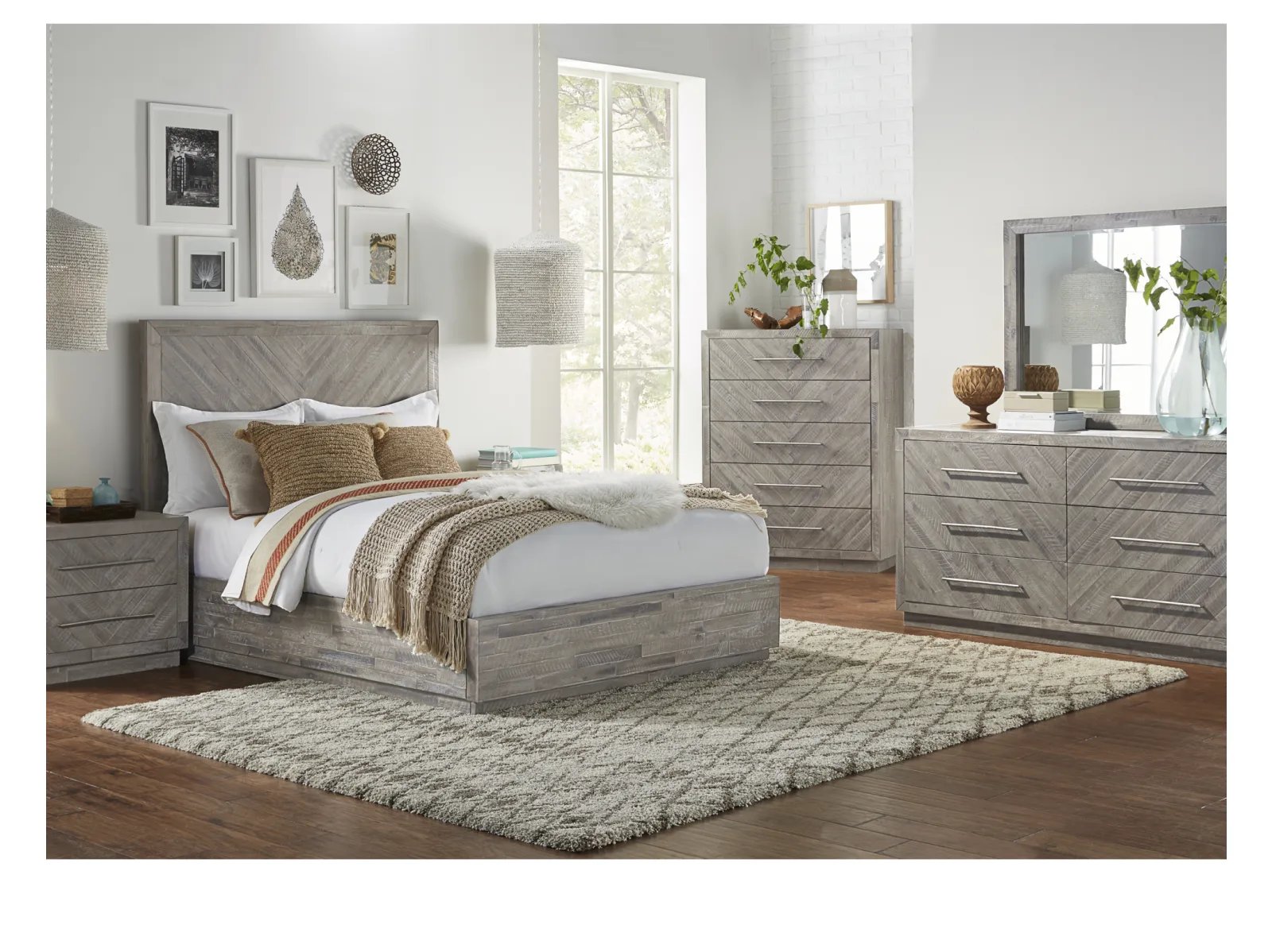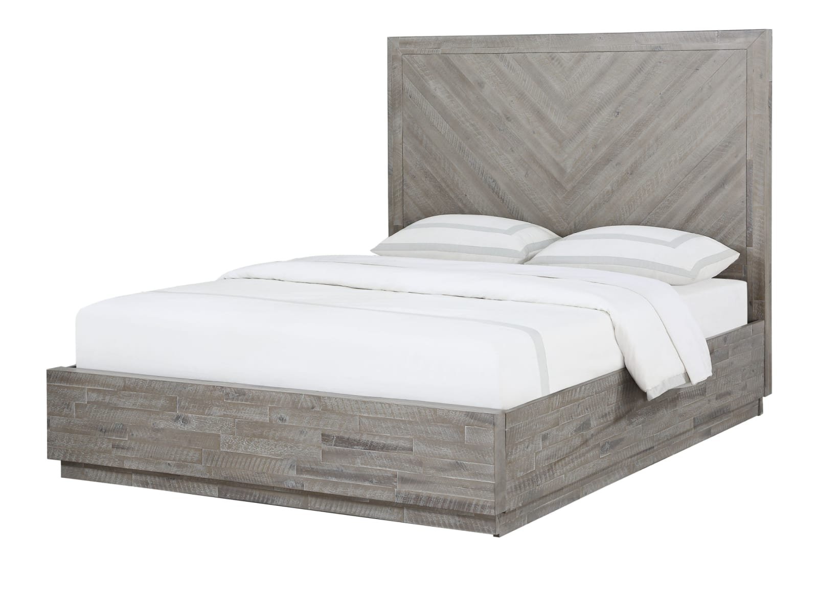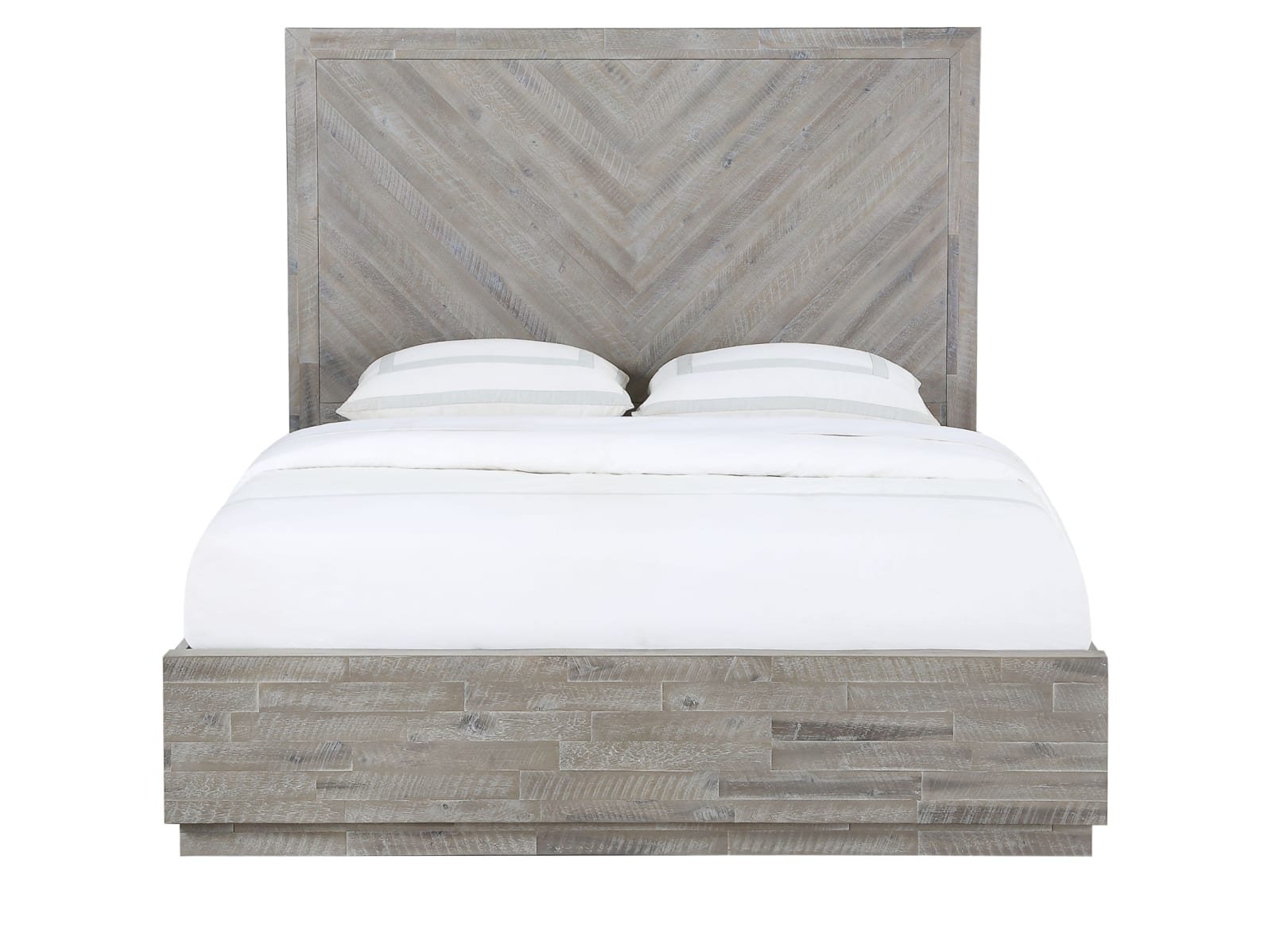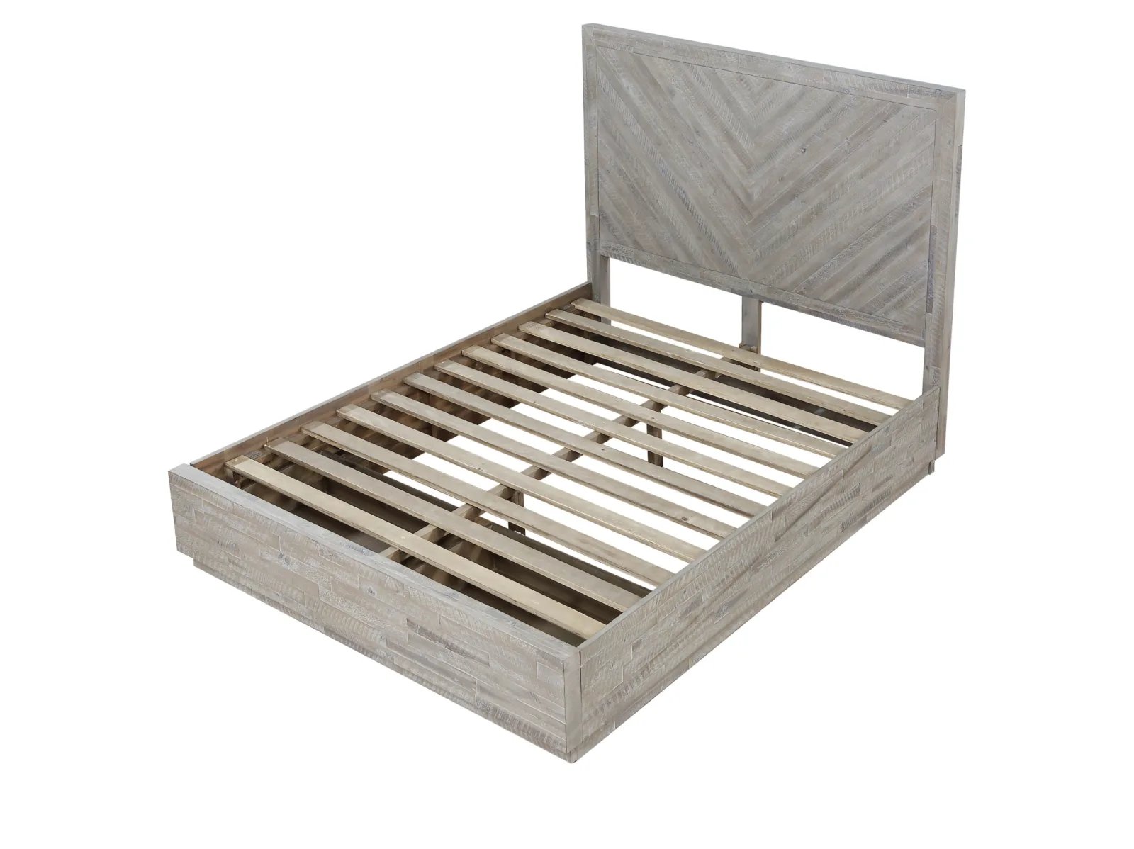 With a sophisticated look full of contemporary neutral tones and rustic wooden textures, the Mystic Storage Bed is sure to leave a lasting impression. To perfect its distinctive rustic-contemporary look, the Mystic’s headboard features hand-selected planks of rough-hewn acacia which are first carefully sanded, stained, and whitewashed with a “Rustic Latte” finish before being inlaid over its engineered wood frame in a handsome V-shaped herringbone pattern. If that wasn’t enough, the Mystic’s headboard is framed with mitered corners, it rests atop a stylish plinth platform base, and it features two full-extension English dovetail drawers with modern pull handles in a silver-colored finish. You’re going to love the Mystic Storage Bed in your bedroom today.