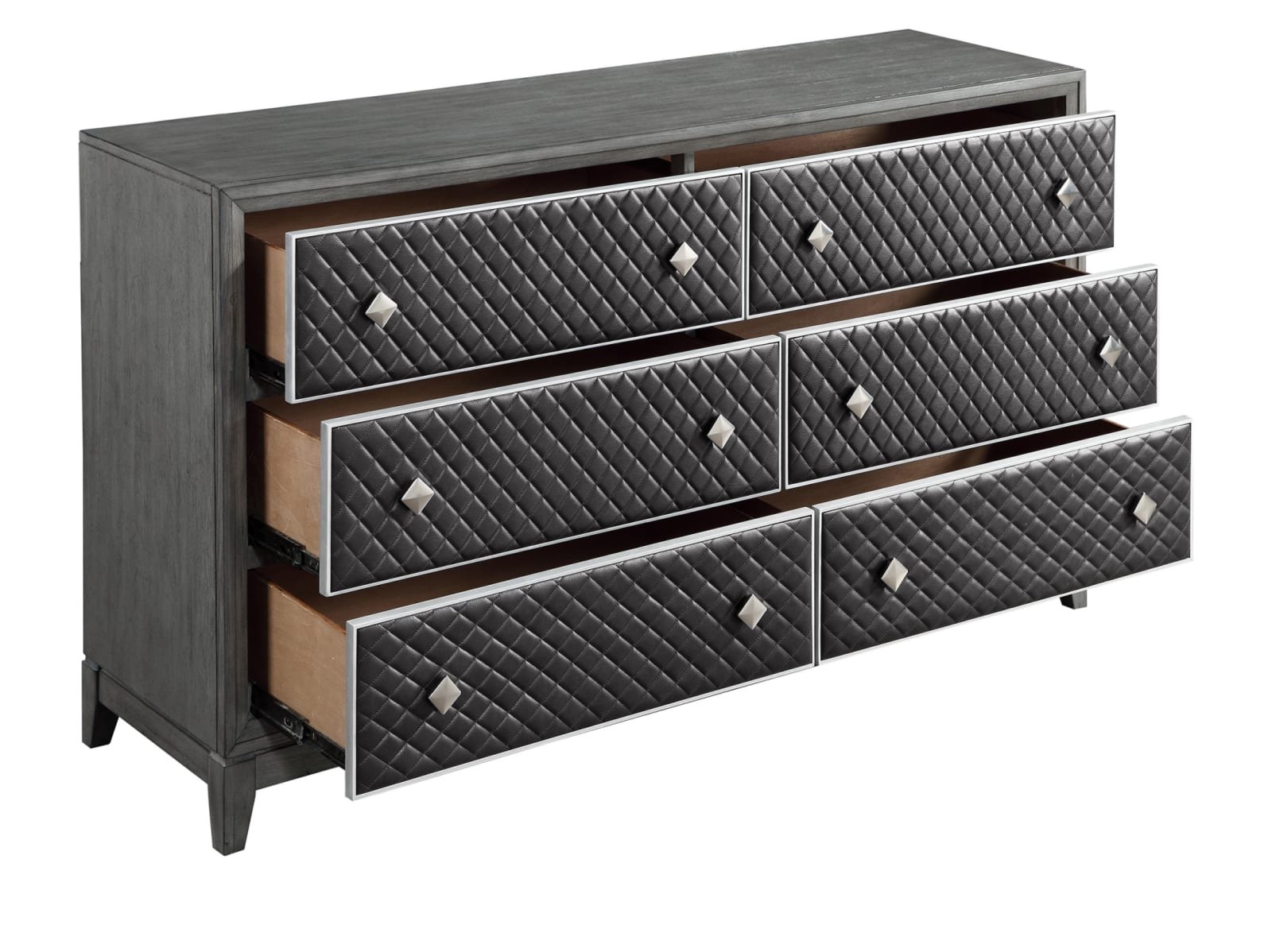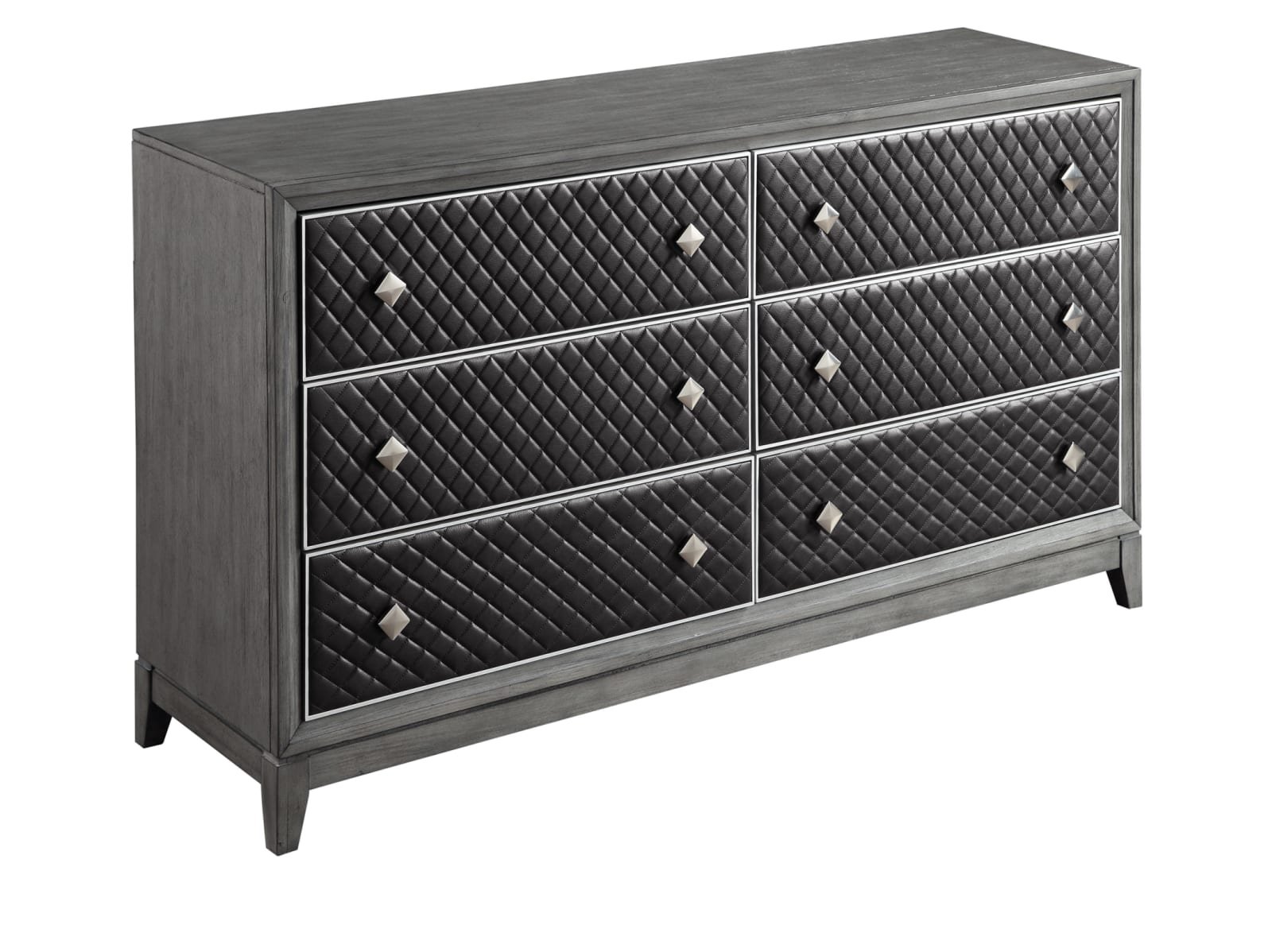 Modern styling is achieved by pairing classic design elements with eye-catching bold lines culminating in the chic look of the Nea Collection. Painted silver accent subtly frames the diamond-patterned gray faux leather fronts of the dresser, each providing complementing contrast to the gray wire-brushed finish of the collection’s birch veneer. Square nickel finished hardware fronts each drawer, furthering the modern look of the Nea Collection.