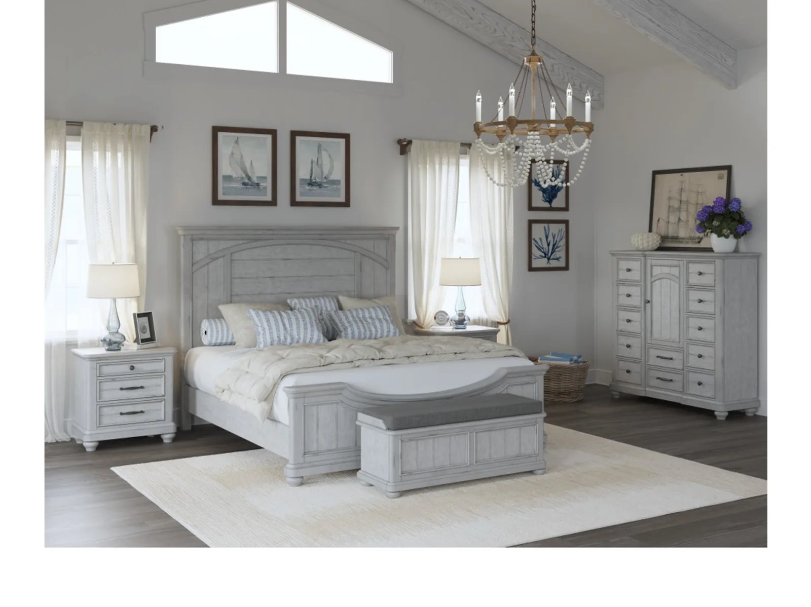 & Free ShippingGrand in scale but casual in feel, the Neisent bedroom collection is an easy winner decorated with classic arches, scored fronts, and turned wood details. The oyster shell finish with light distressing lends a weathered appearance that pairs with charming antique pewter pulls and knobs for a seaside look. Make your home feel like summer year-round with the charmingly coastal Neisent collection.