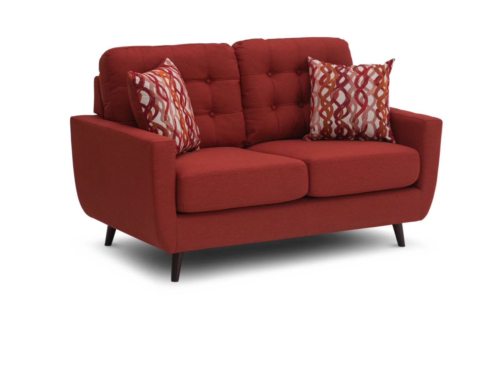 & Free ShippingThe always stylish mid-century modern look comes alive in the Nero Loveseat. This beautiful loveseat features a robust pocketed coil support system that’s wrapped in premium high-density foam and topped with two plush reversible seat cushions for added comfort and longevity. To perfect its retro look, the Nero offers streamlined track arms, button tufted back cushions, splayed tapered legs in a dark mocha finish, and it’s available in either a bold Picante red or cool Denim blue color. Add the Nero Loveseat to your collection today.