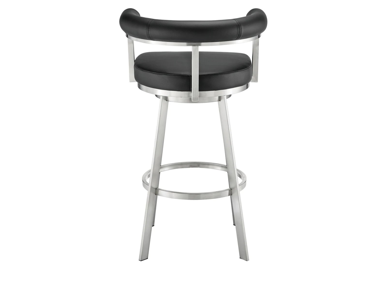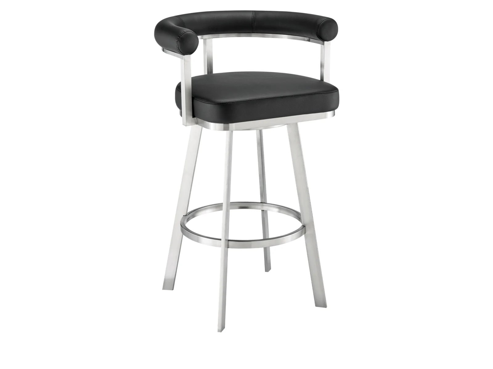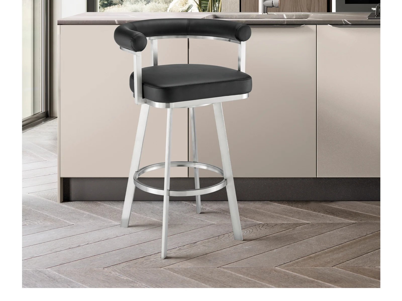 Glam up your space with the flair of our Newman swivel bar or counter stool in faux leather and metal from Armen Living. Featuring a minimal and streamlined barrel back, our mid-century modern counter stool vouches for a sleek and inviting look. The plush cushioning at the back and the padded seat offers a comfortable seat while the open back allows for breathability. Uplifted with a chic metal frame, our stylish counter or bar stool makes a powerful design statement. Upholstered in faux leather, it provides a comfortable stay at a high dining area, kitchen counter, or worktable. Faux leather does not crack easily and is stain resistant, does not fade easily and is also UV resistant. Counter or bar height stools that feature a swivel mechanism tend to be much more convenient for everyday use or when entertaining. The wonderful full 360-degree swivel function allows for maximum mobility. The smooth glide swivel function allows you to change directions with ease, making this your new favorite seat in your home. The Newman faux leather and metal kitchen bar stool is available in your choice of a black finish with brown or grey faux leather, a brushed stainless-steel finish with your choice of black, light grey, or white faux leather, or a java brown finish with chocolate faux leather upholstery. This bar stool is available in 26-inch or 30-inch seat heights options.
