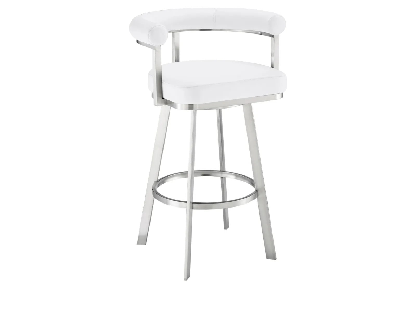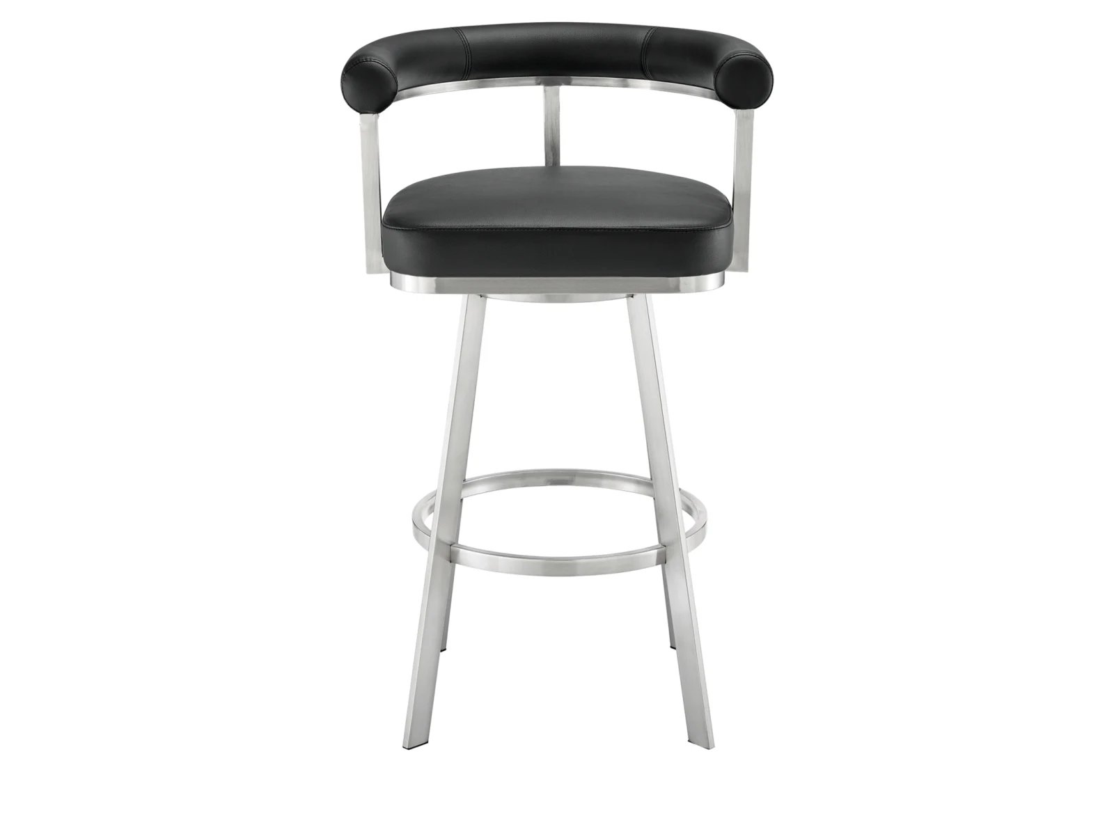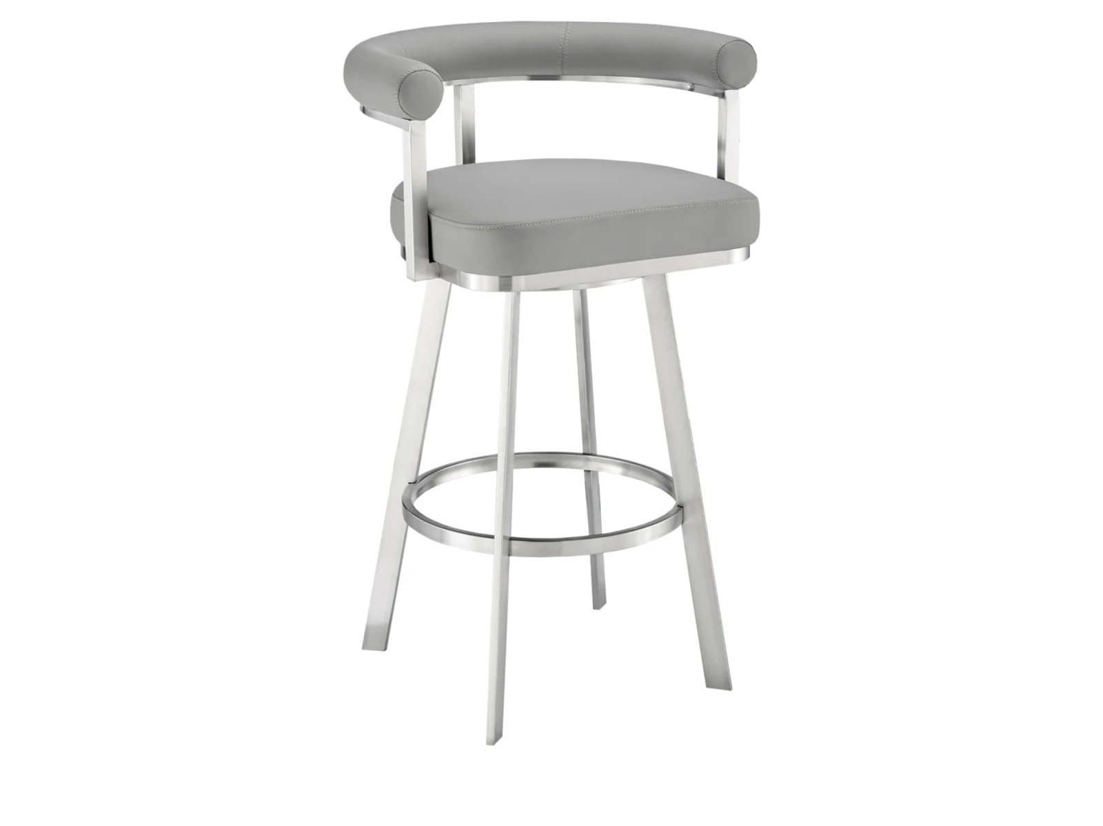 Glam up your space with the flair of our Newman swivel bar or counter stool in faux leather and metal from Armen Living. Featuring a minimal and streamlined barrel back, our mid-century modern counter stool vouches for a sleek and inviting look. The plush cushioning at the back and the padded seat offers a comfortable seat while the open back allows for breathability. Uplifted with a chic metal frame, our stylish counter or bar stool makes a powerful design statement. Upholstered in faux leather, it provides a comfortable stay at a high dining area, kitchen counter, or worktable. Faux leather does not crack easily and is stain resistant, does not fade easily and is also UV resistant. Counter or bar height stools that feature a swivel mechanism tend to be much more convenient for everyday use or when entertaining. The wonderful full 360-degree swivel function allows for maximum mobility. The smooth glide swivel function allows you to change directions with ease, making this your new favorite seat in your home. The Newman faux leather and metal kitchen bar stool is available in your choice of a black finish with brown or grey faux leather, a brushed stainless-steel finish with your choice of black, light grey, or white faux leather, or a java brown finish with chocolate faux leather upholstery. This bar stool is available in 26-inch or 30-inch seat heights options.