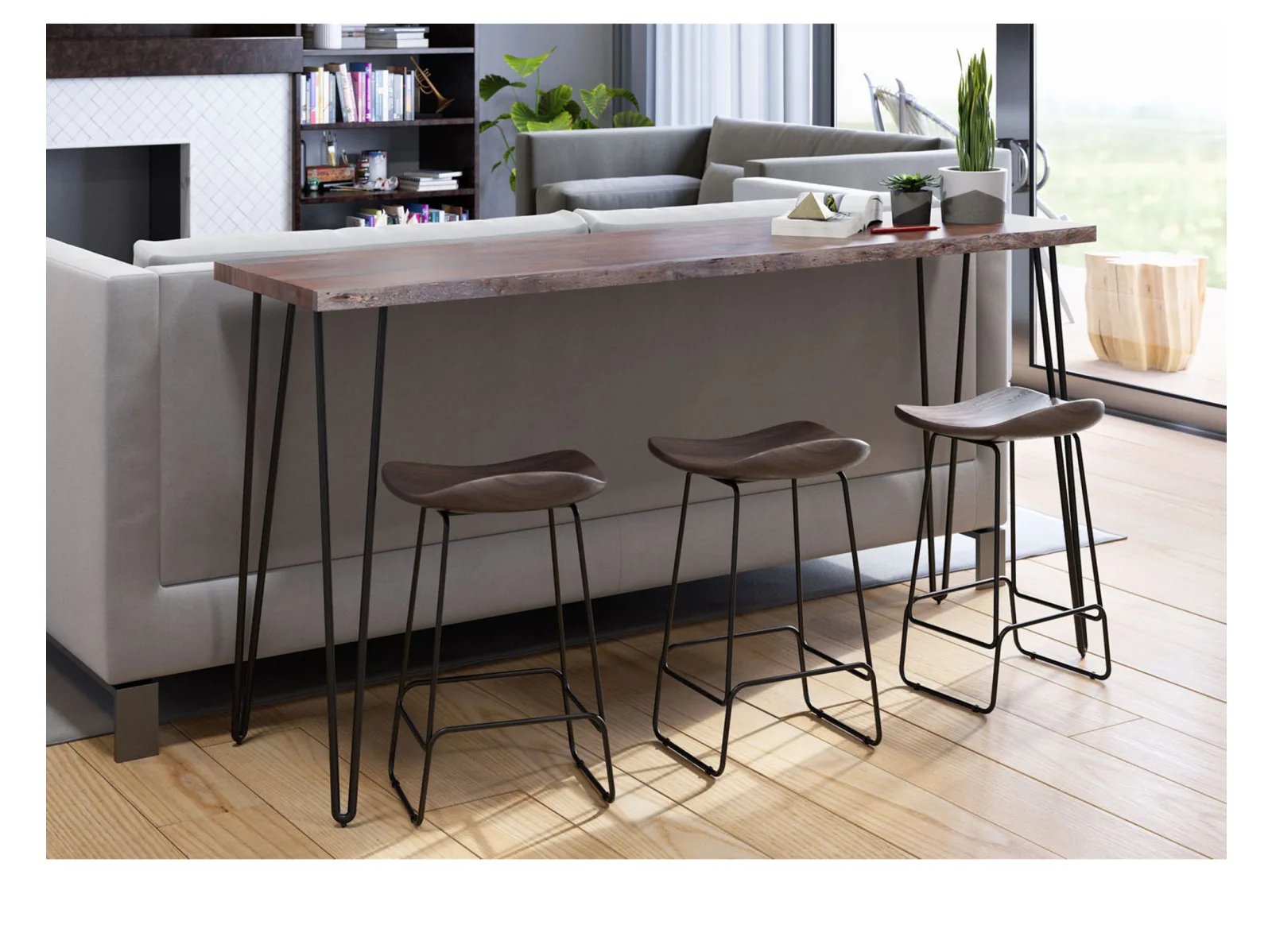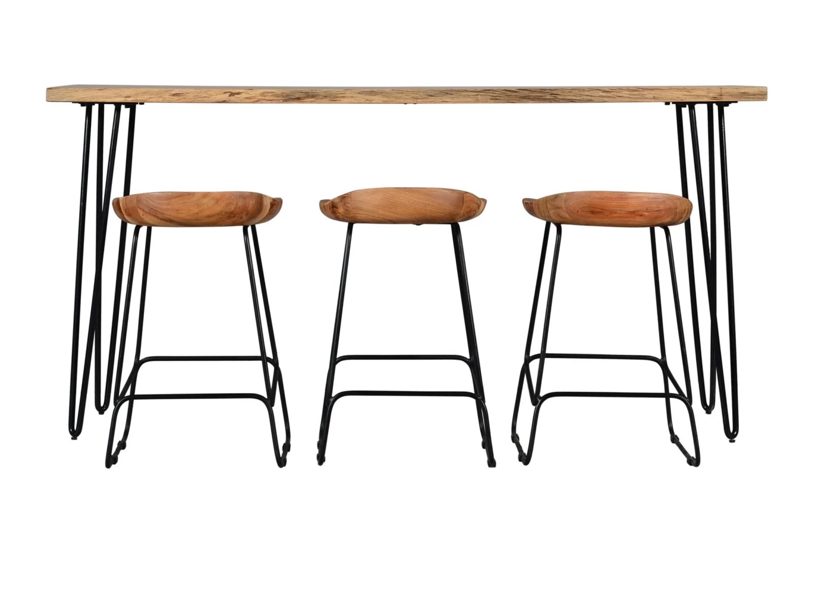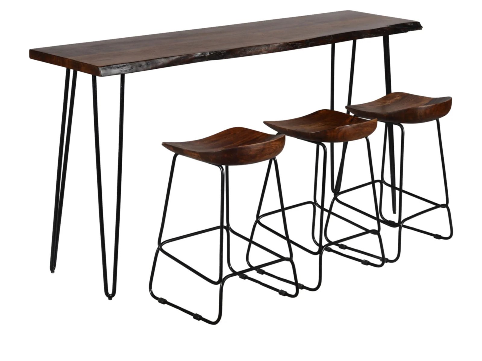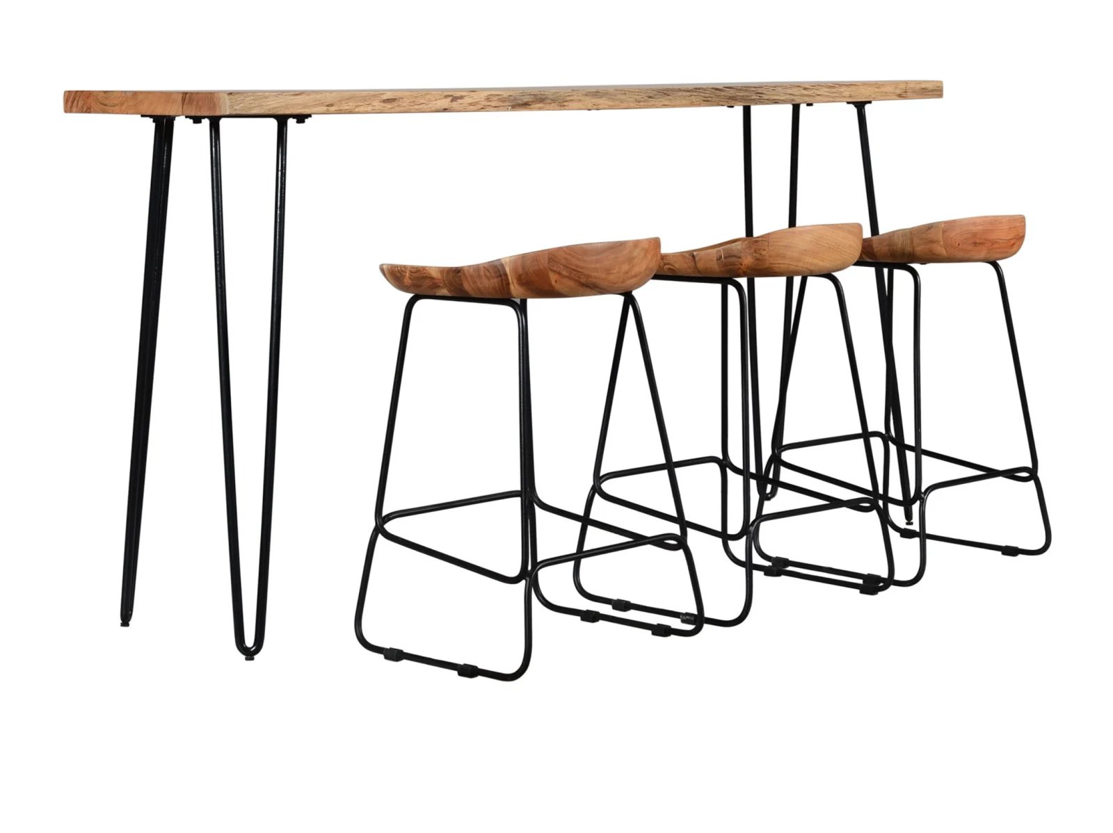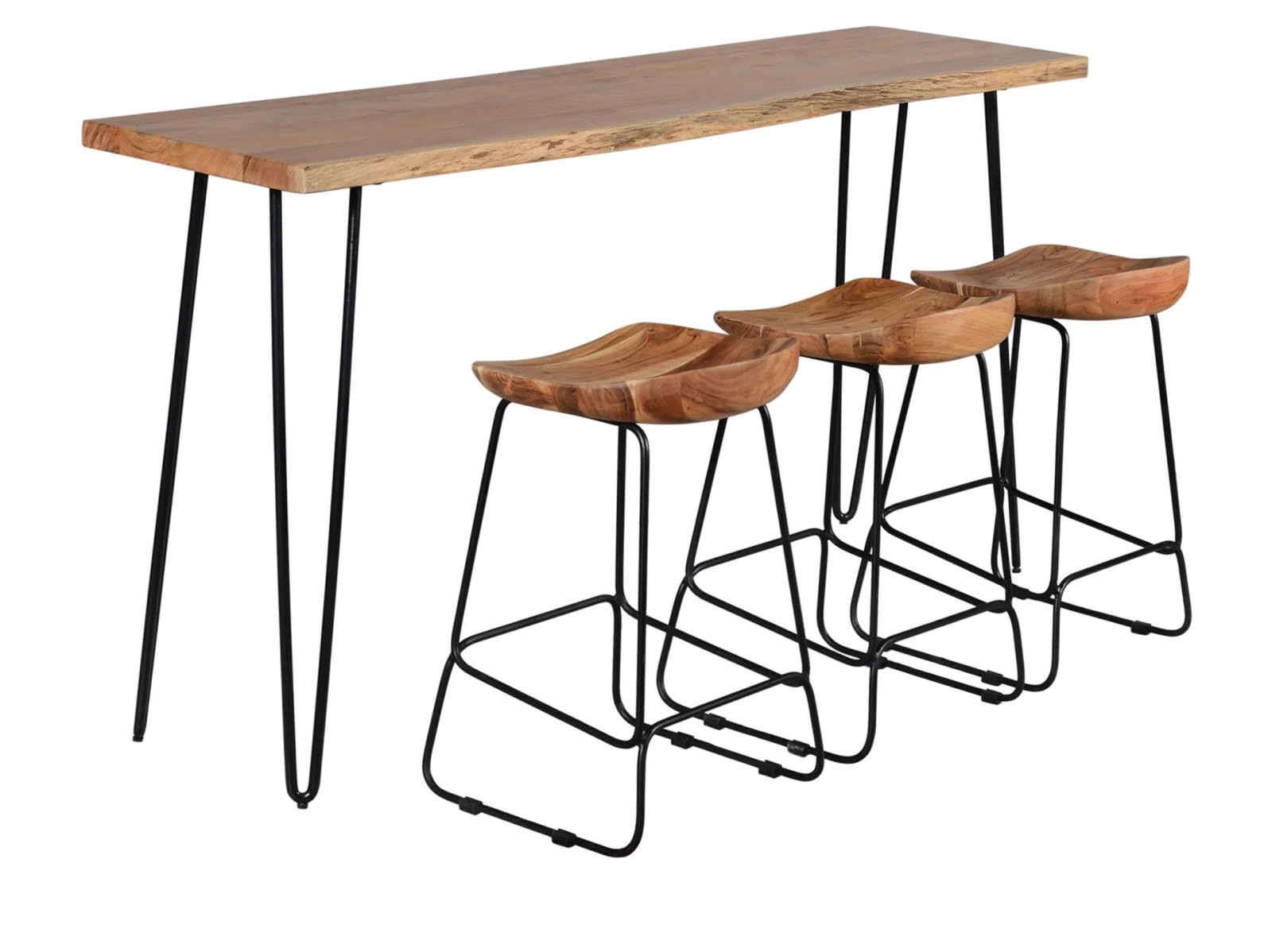 Transform your living room or dining room with the Niovi 4 Pc. Bar Set. This cool ensemble includes a counter-height bar table and three backless bar stools, all featuring live edge acacia wood and sleek hairpin legs. The set’s rustic and mid-century modern design influences create a stylish and functional space for casual dining or entertaining.