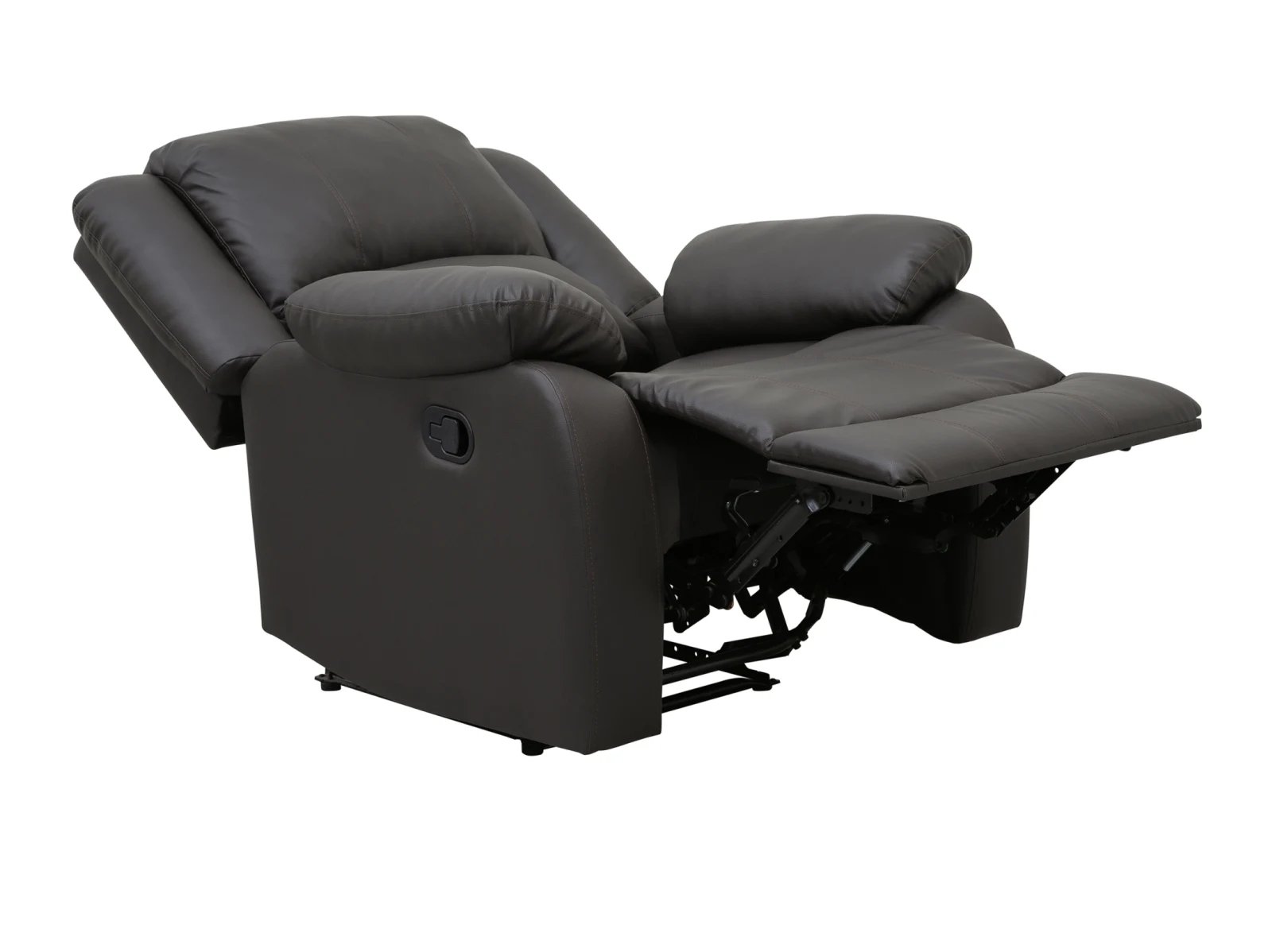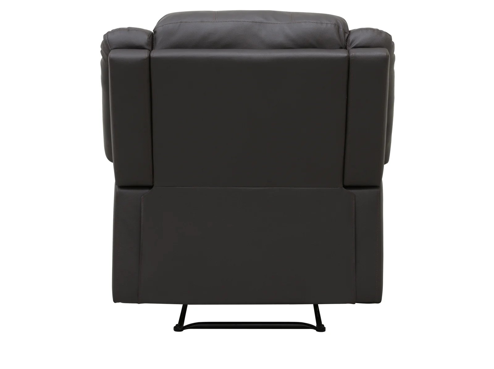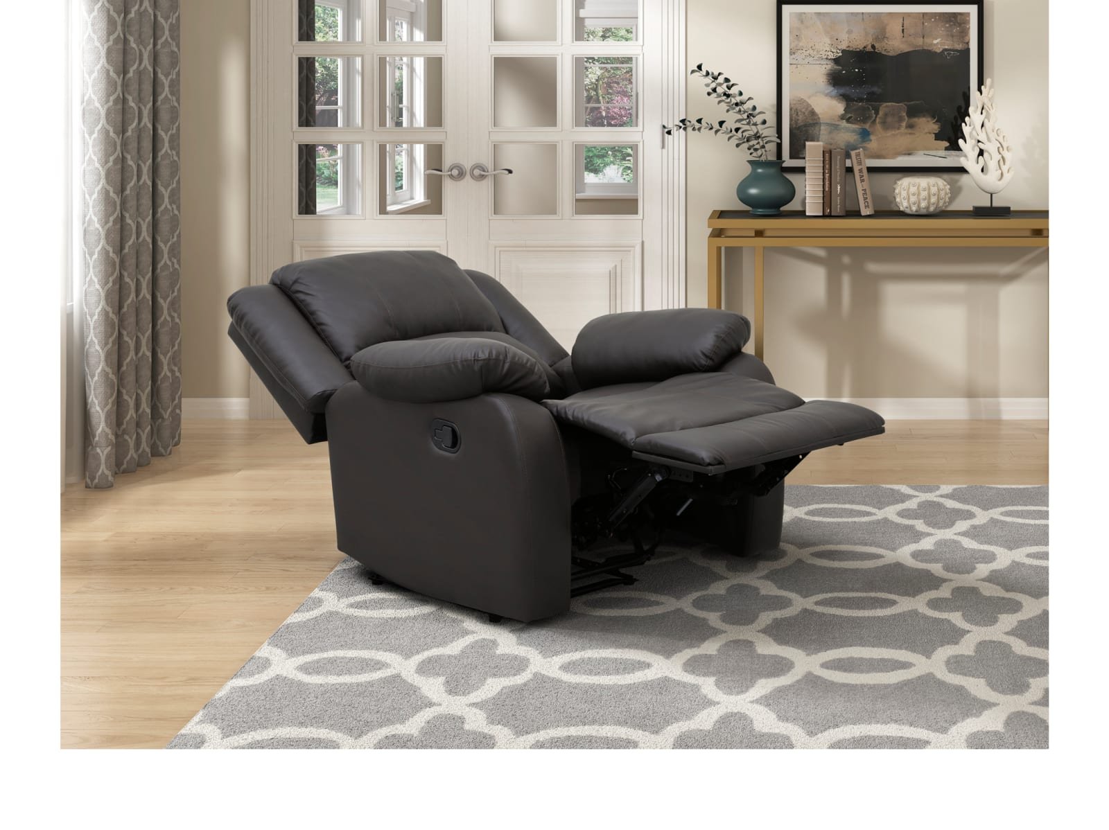 A solid pairing to your transitional living room, the Nixa III Collection’s decorative versatility, and plush seating creating a reclining chair that is a complement to your lifestyle. Dark brown faux leather covers the chair, the neutral hue lending unobtrusive style to your space. The manual motion mechanism of the piece is engaged with a pull of the side-mounted tab, transitioning you from seated to reclined. The contoured seat structure is amply paired with pillowtop arms maximizing your comfort.