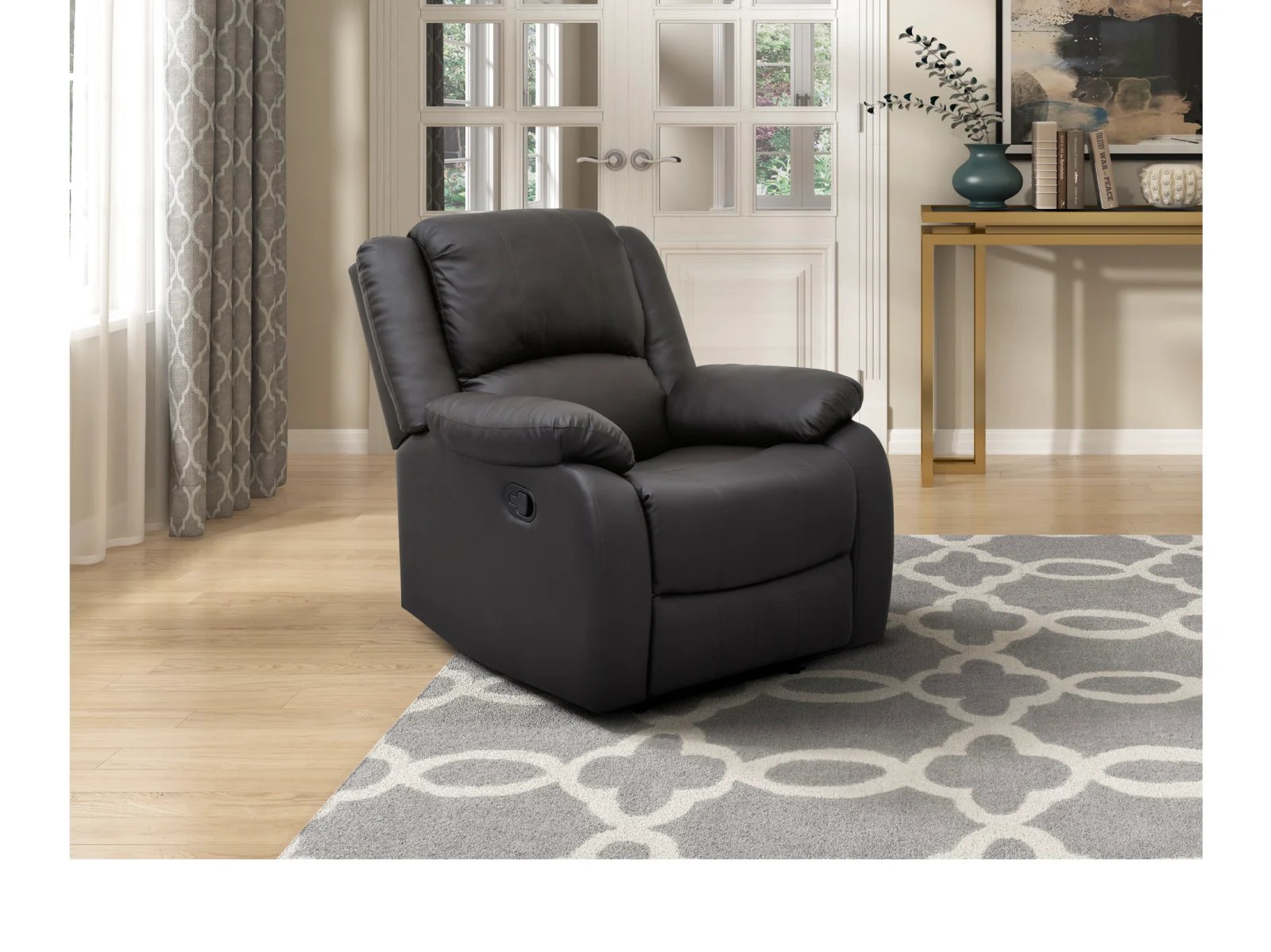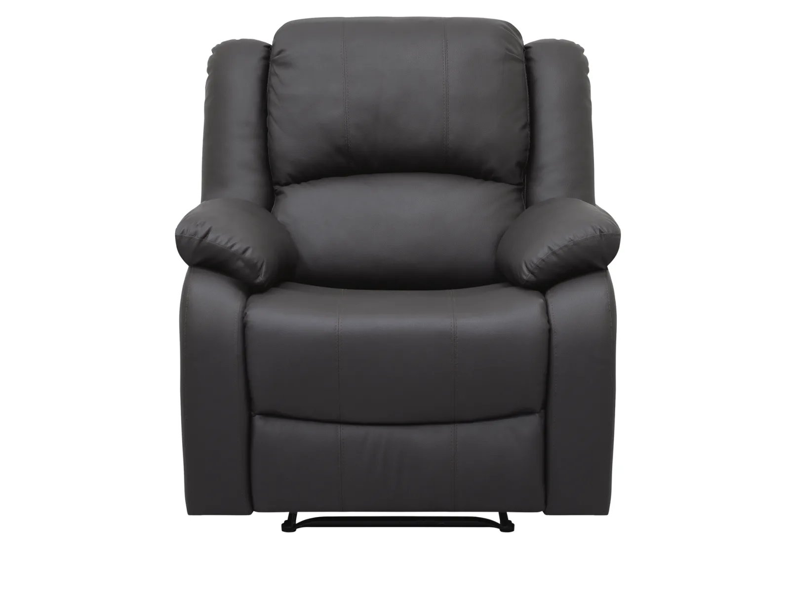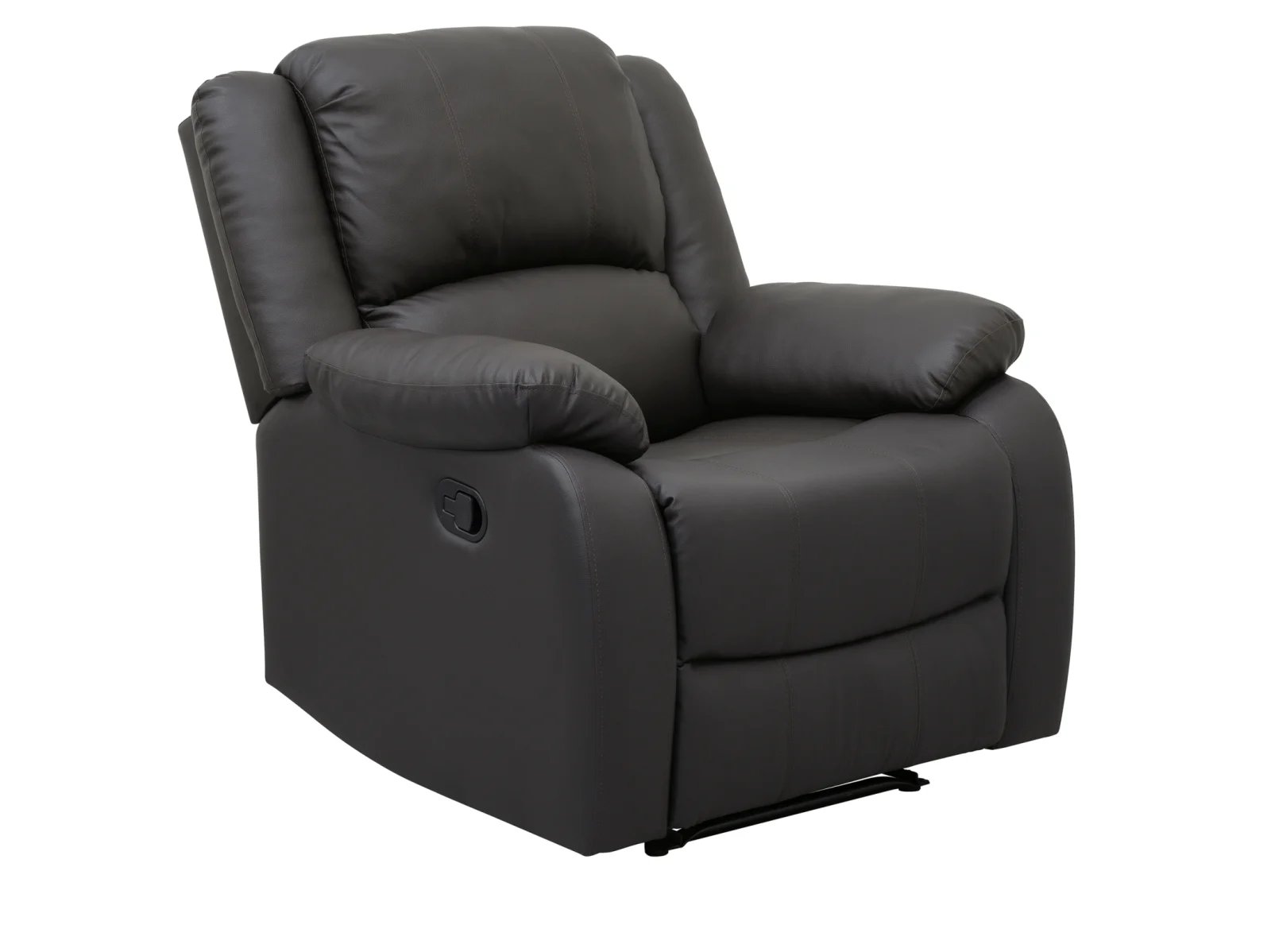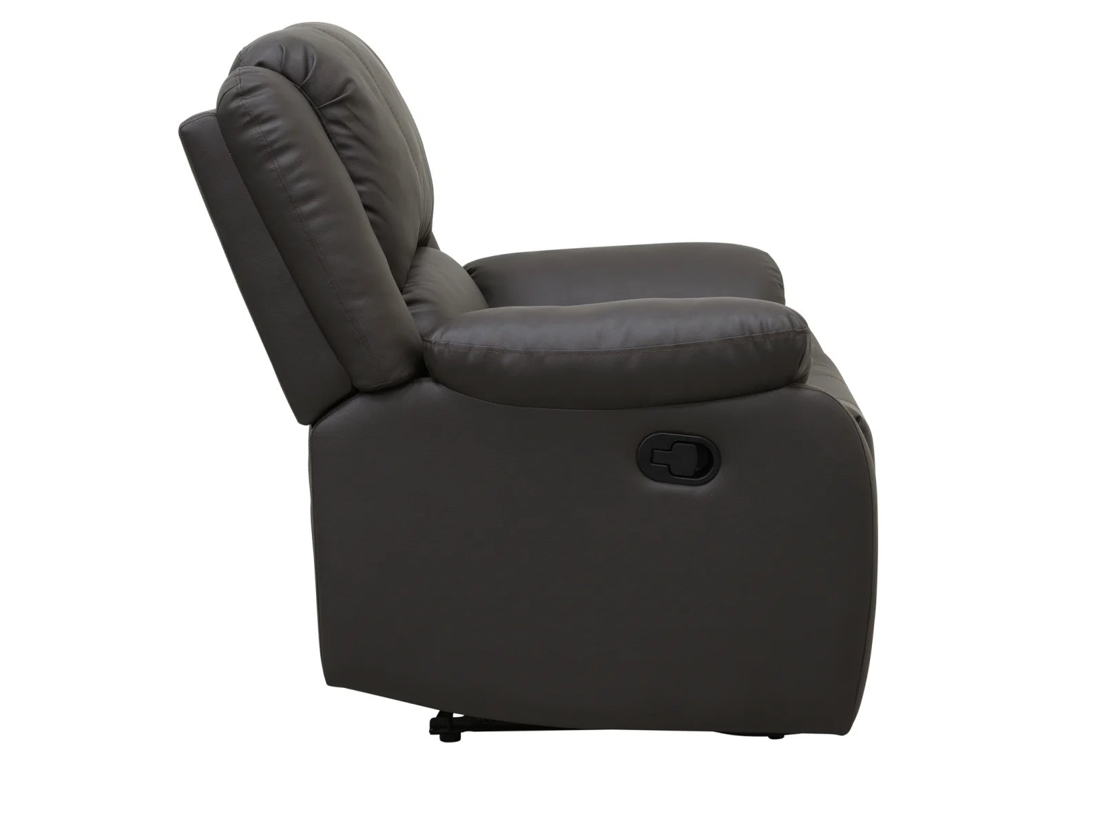 A solid pairing to your transitional living room, the Nixa III Collection’s decorative versatility, and plush seating creating a reclining chair that is a complement to your lifestyle. Dark brown faux leather covers the chair, the neutral hue lending unobtrusive style to your space. The manual motion mechanism of the piece is engaged with a pull of the side-mounted tab, transitioning you from seated to reclined. The contoured seat structure is amply paired with pillowtop arms maximizing your comfort.