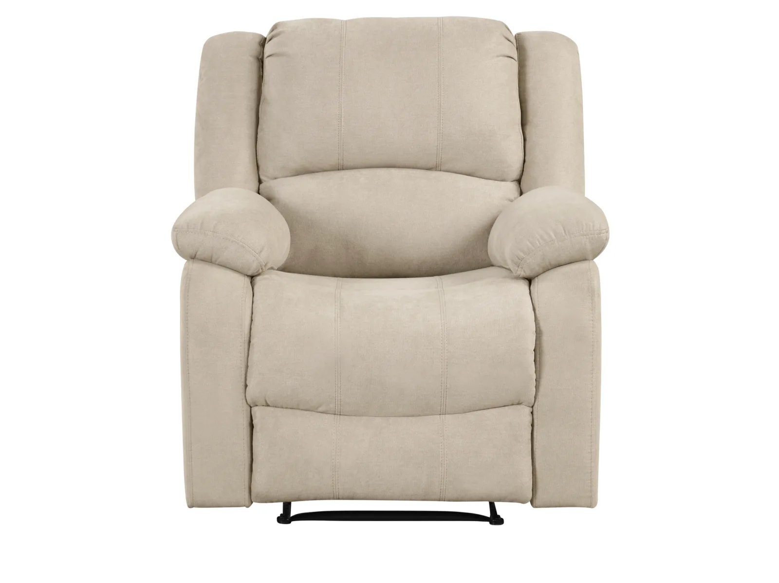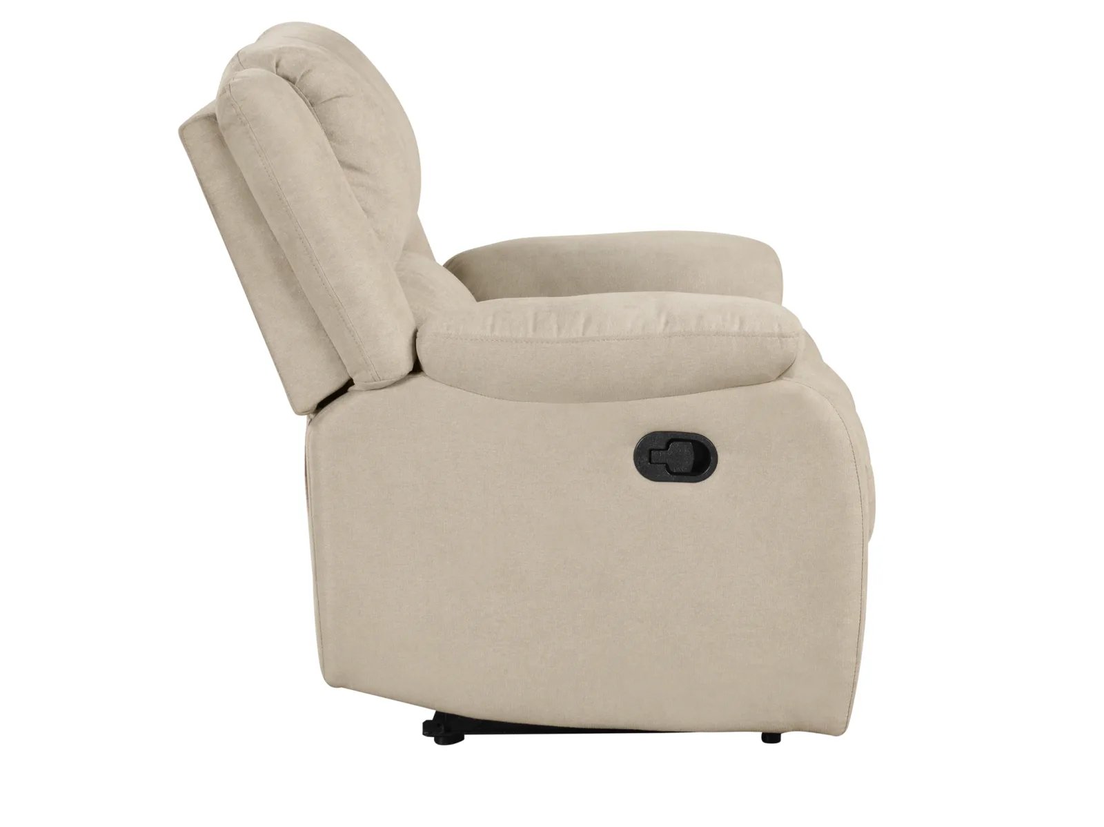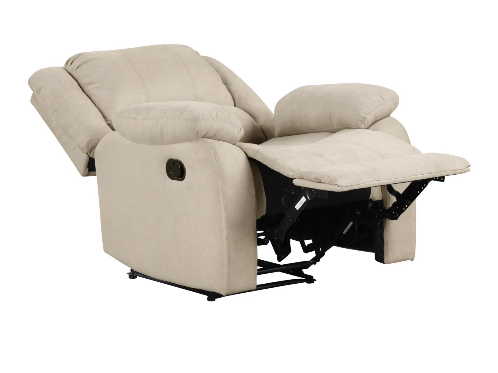 A solid pairing to your transitional living room, the Nixa IV Chair’s decorative versatility, and plush seating creates a reclining chair that is a complement to any lifestyle. Oatmeal textured fabric covers the chair, the neutral hue lending unobtrusive style to your space. The manual motion mechanism of the piece is engaged with a pull of the side-mounted tab, transitioning you from seated to reclined with ease, and the contoured seat structure is amply paired with pillow-top arms to maximize your comfort.