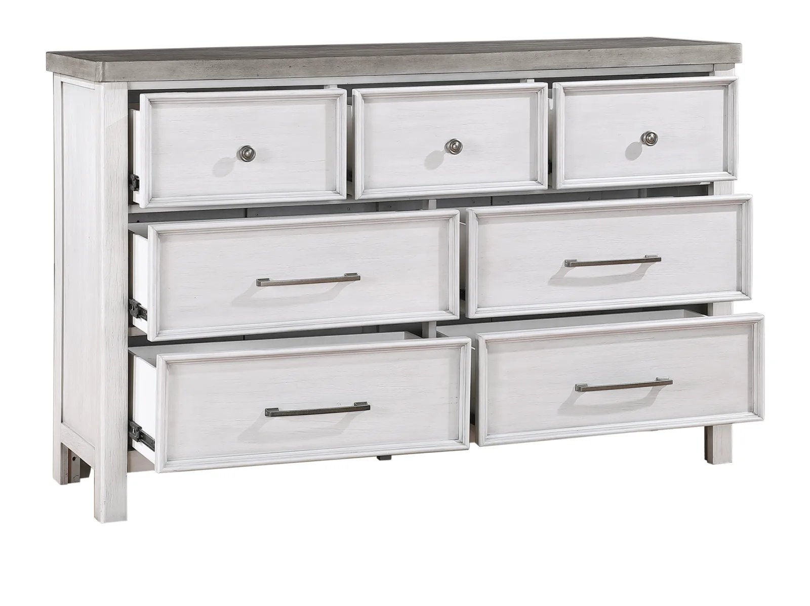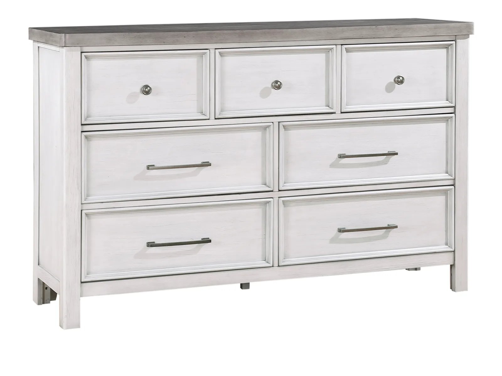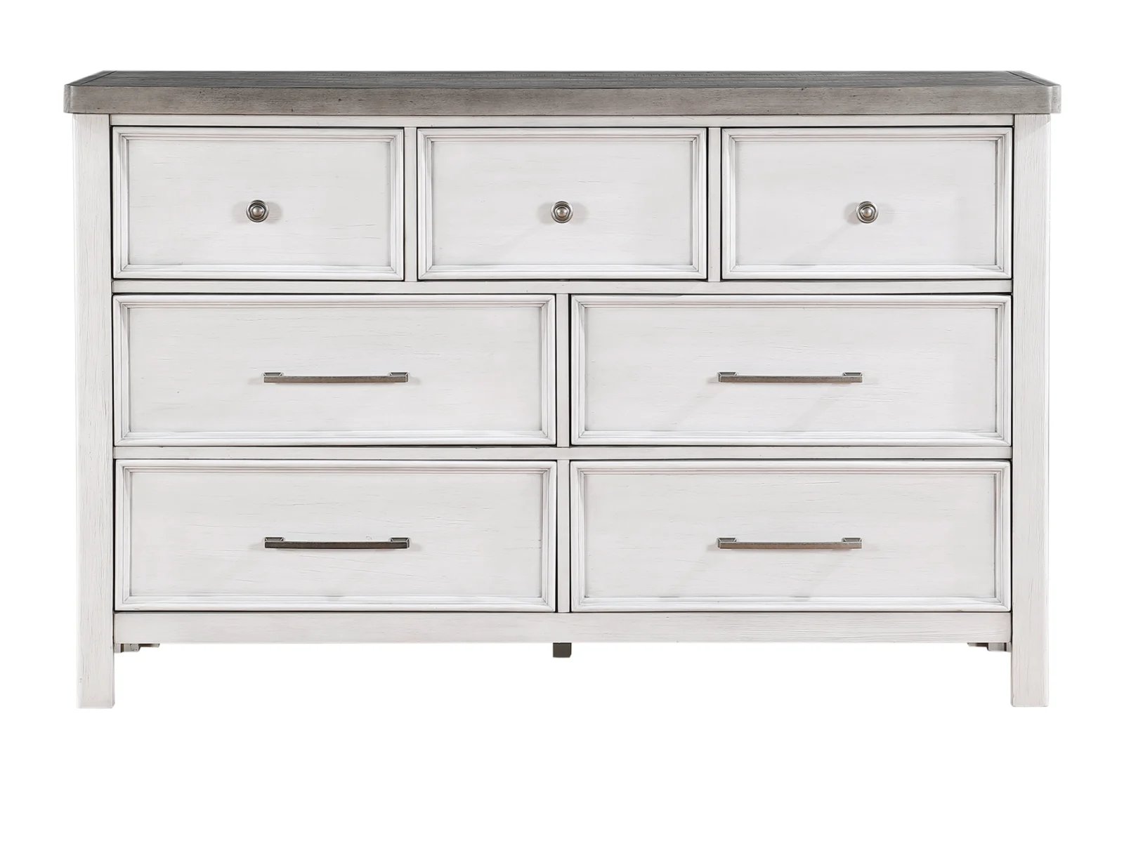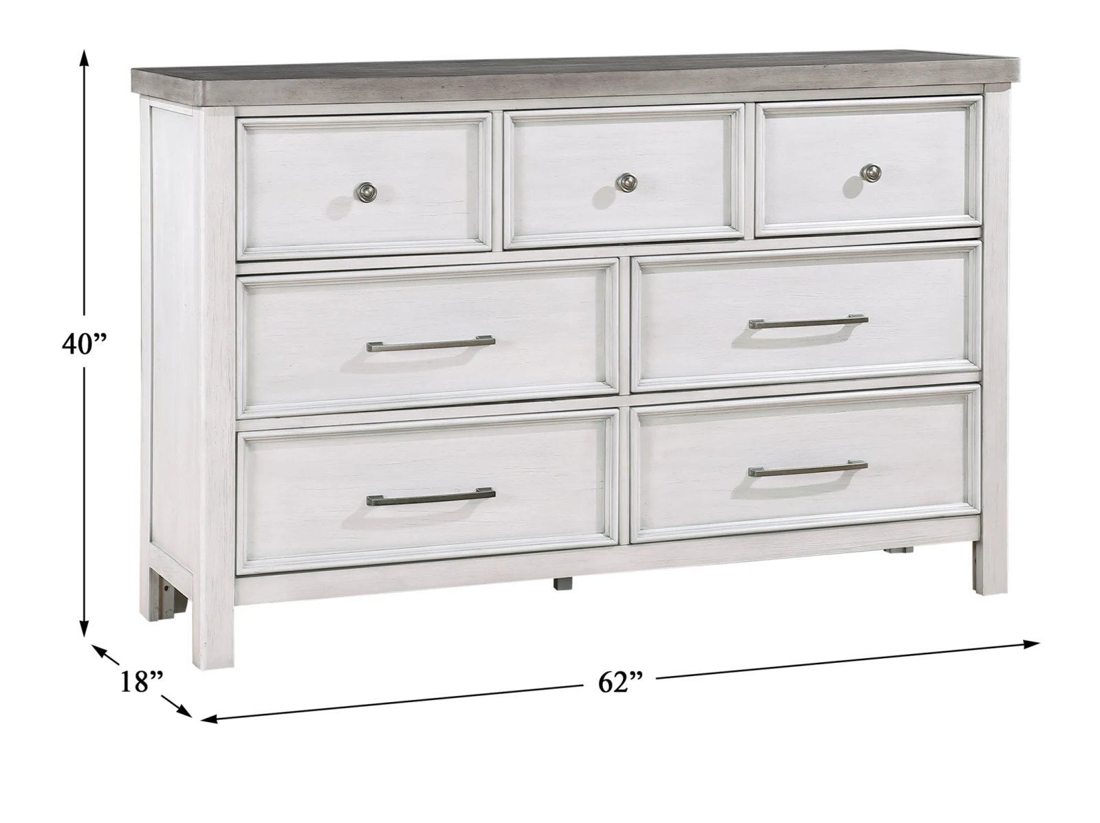 The Oak Park Dresser combines timeless design with ample storage space. Boasting seven drawers of varying sizes, this dresser offers versatile organization for all your clothing needs. The antique white finish is beautifully contrasted by an antique grey top, while antique pewter bar and knob hardware add a refined touch. Crafted with acacia veneers, this dresser brings a hint of rustic styling to your contemporary bedroom.