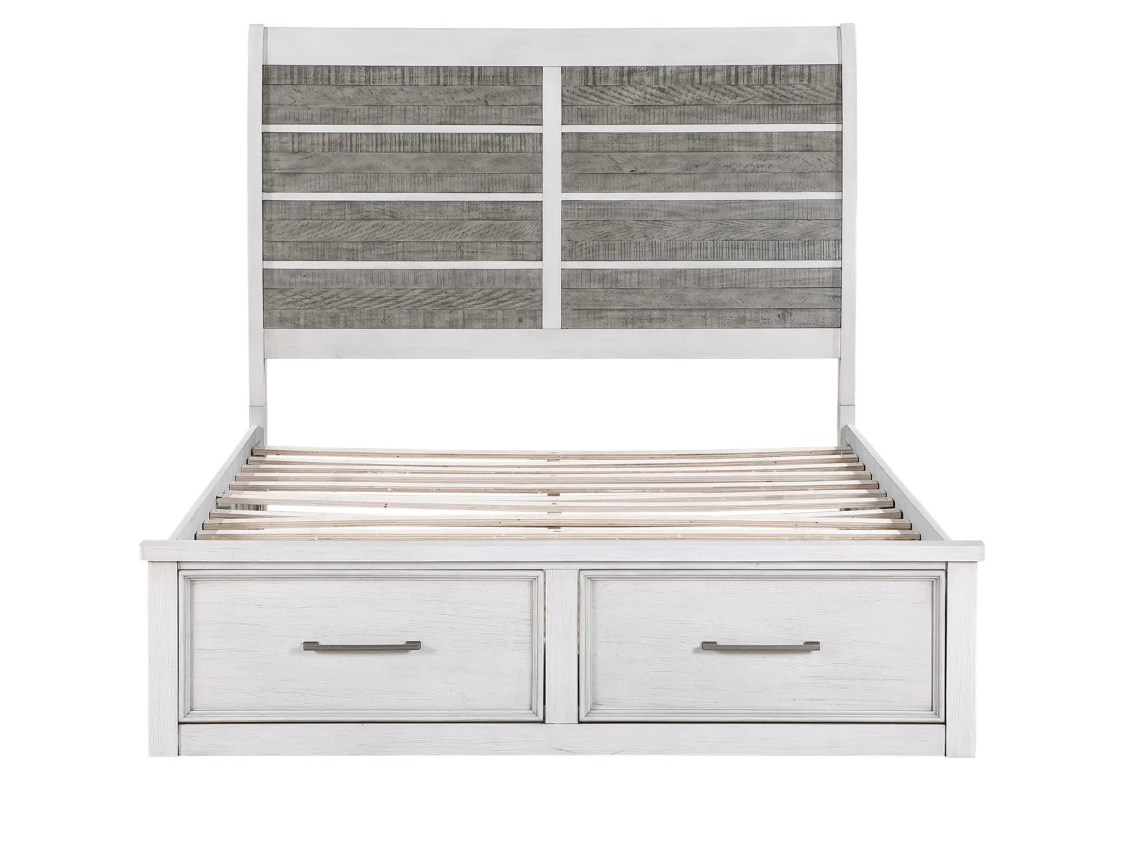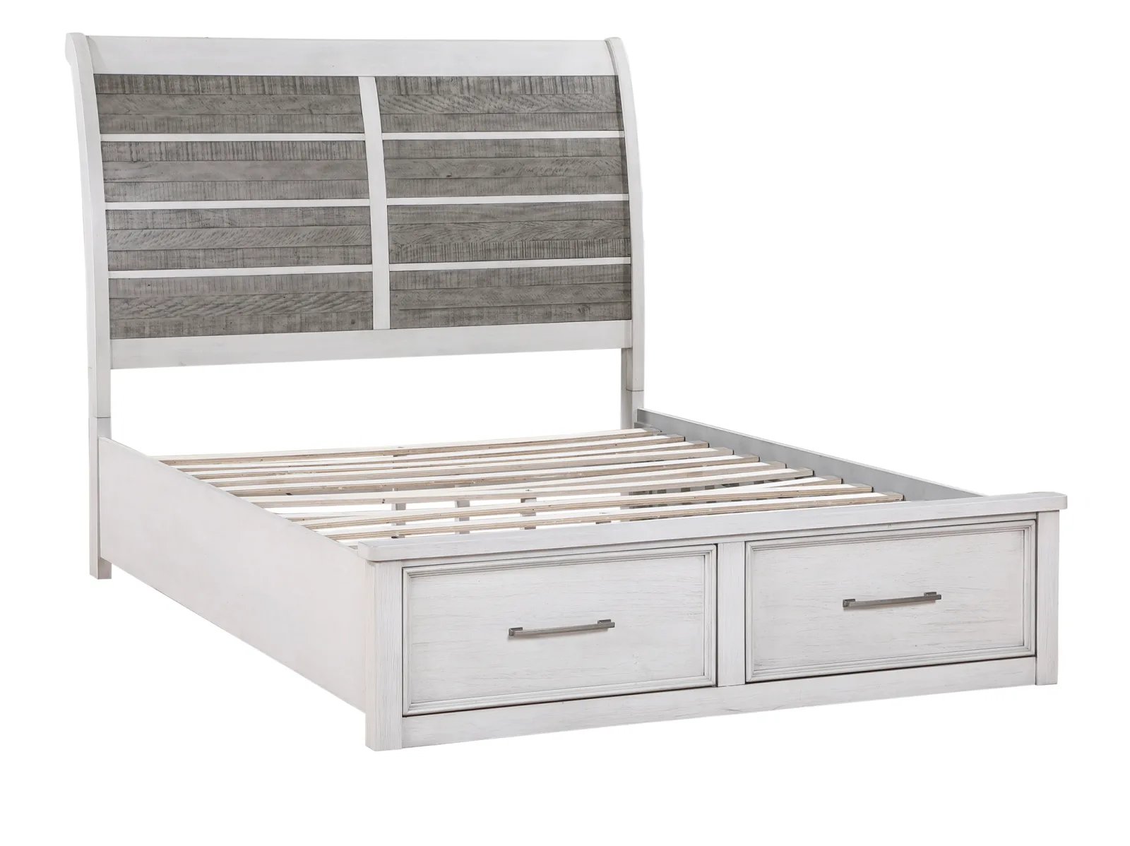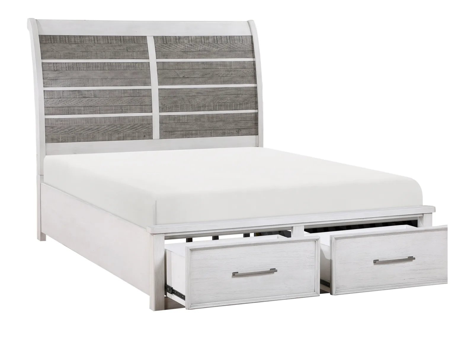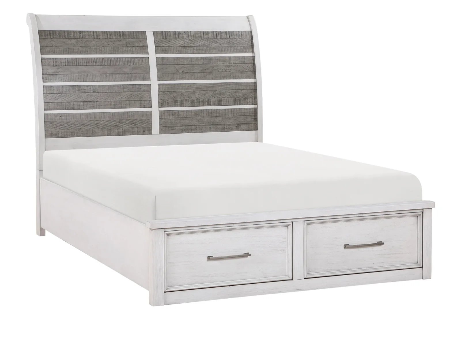 Redesign your bedroom with the Oak Park Storage Bed, a perfect blend of style and functionality. This clean-lined bed features a gracefully curved headboard showcasing panels of planked acacia veneers in an antique grey finish. The antique white frame complements the headboard beautifully, while two footboard drawers offer convenient hidden storage. Antique pewter hardware adds a sophisticated touch to this bedroom masterpiece. Available in queen, king, and cal king sizes.