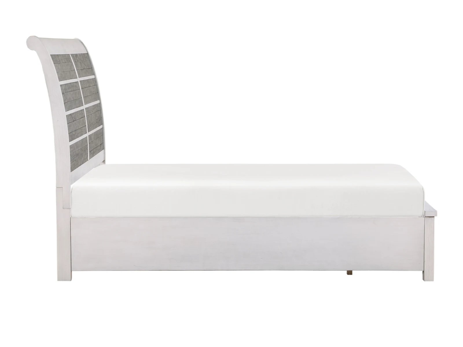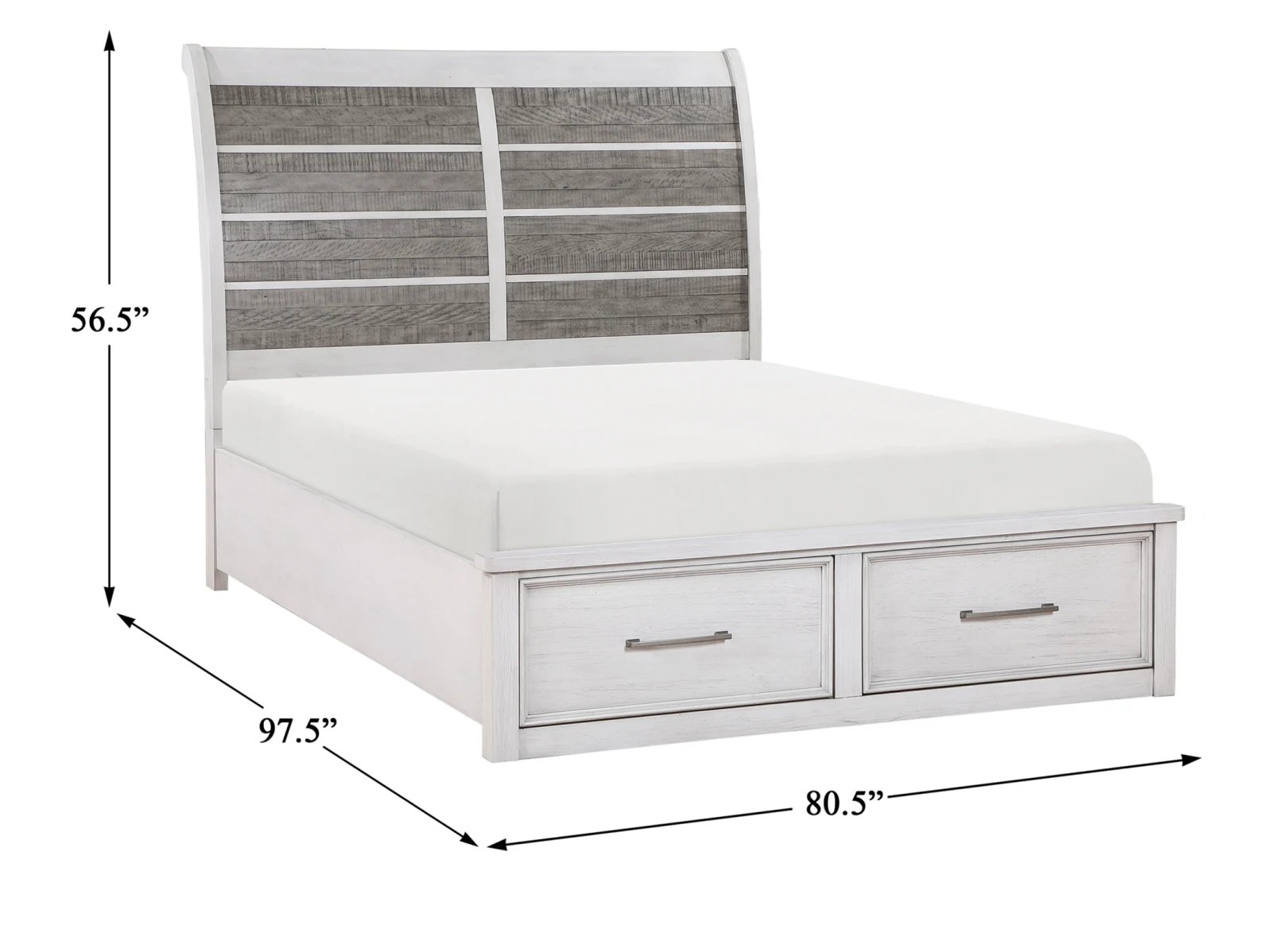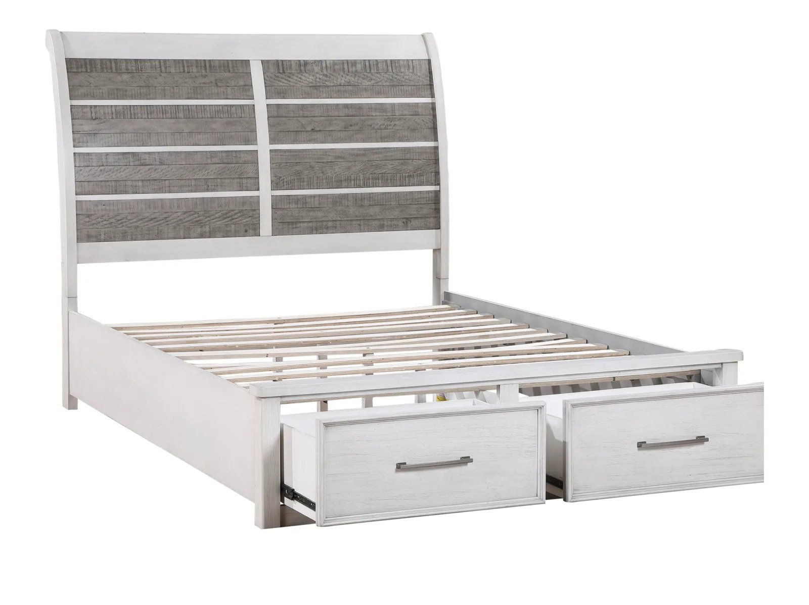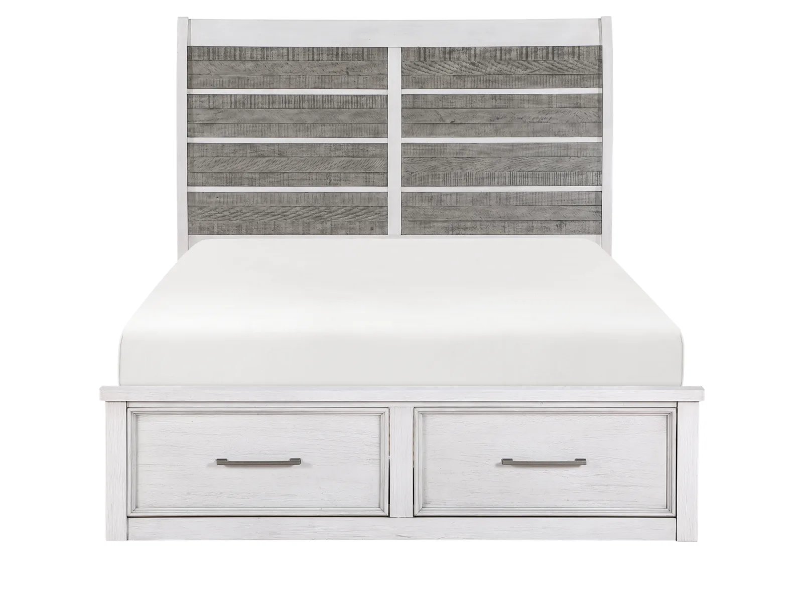 Redesign your bedroom with the Oak Park Storage Bed, a perfect blend of style and functionality. This clean-lined bed features a gracefully curved headboard showcasing panels of planked acacia veneers in an antique grey finish. The antique white frame complements the headboard beautifully, while two footboard drawers offer convenient hidden storage. Antique pewter hardware adds a sophisticated touch to this bedroom masterpiece. Available in queen, king, and cal king sizes.
