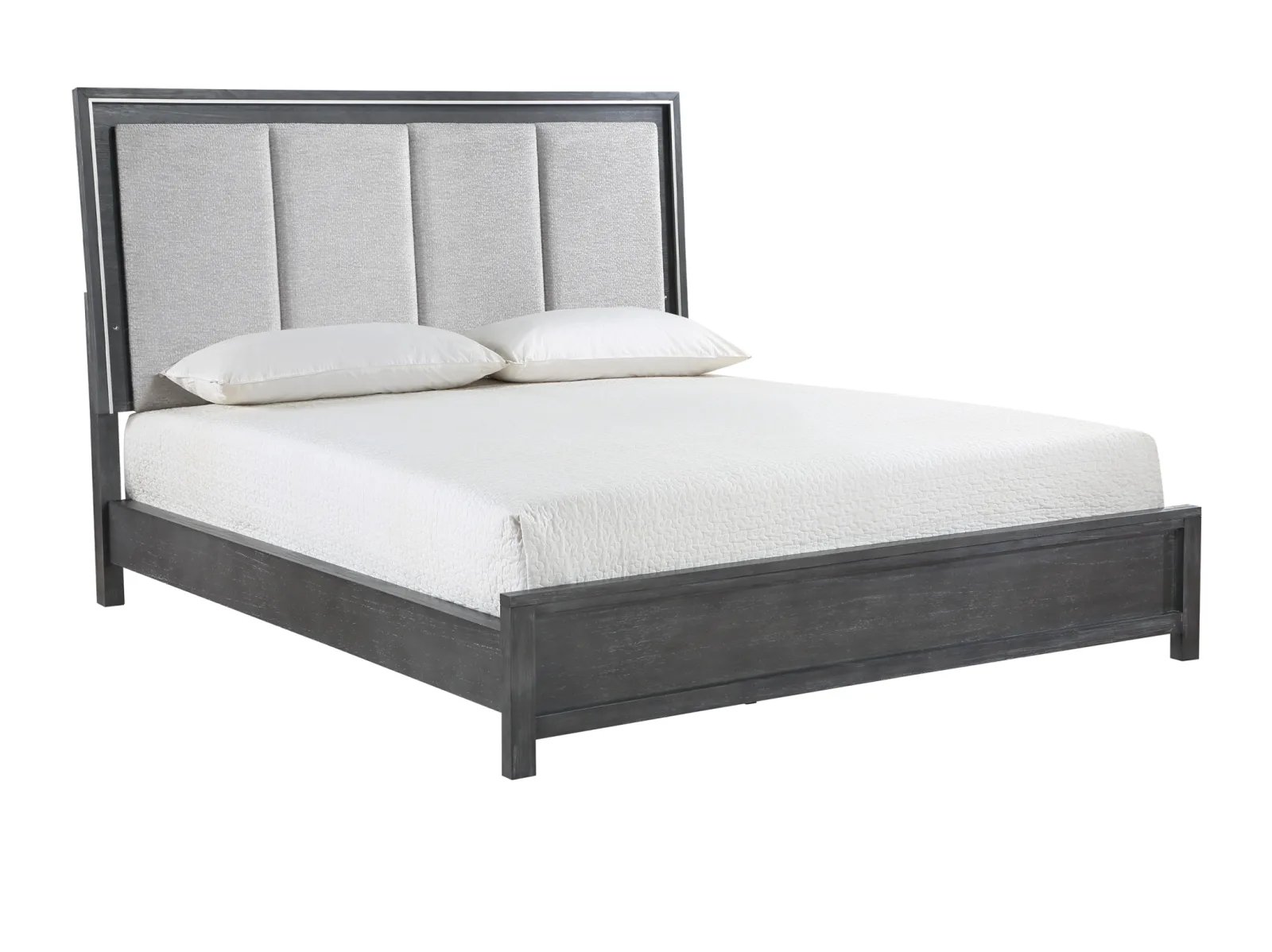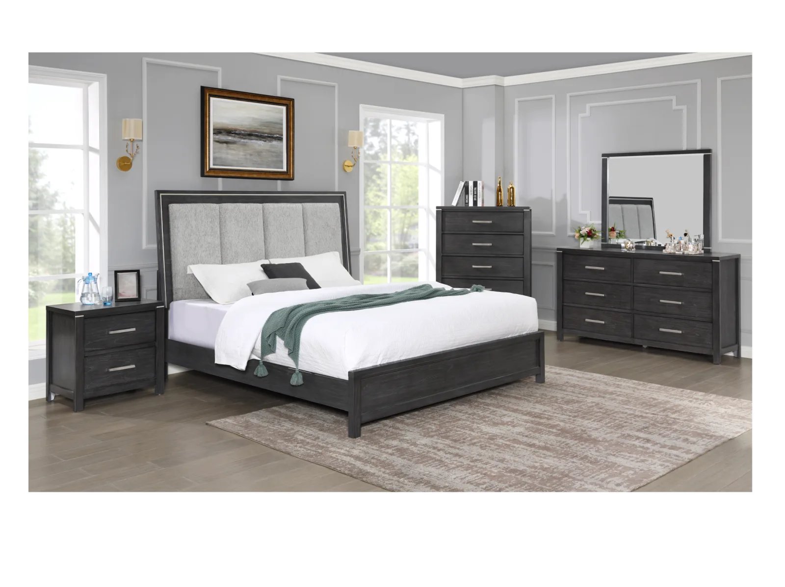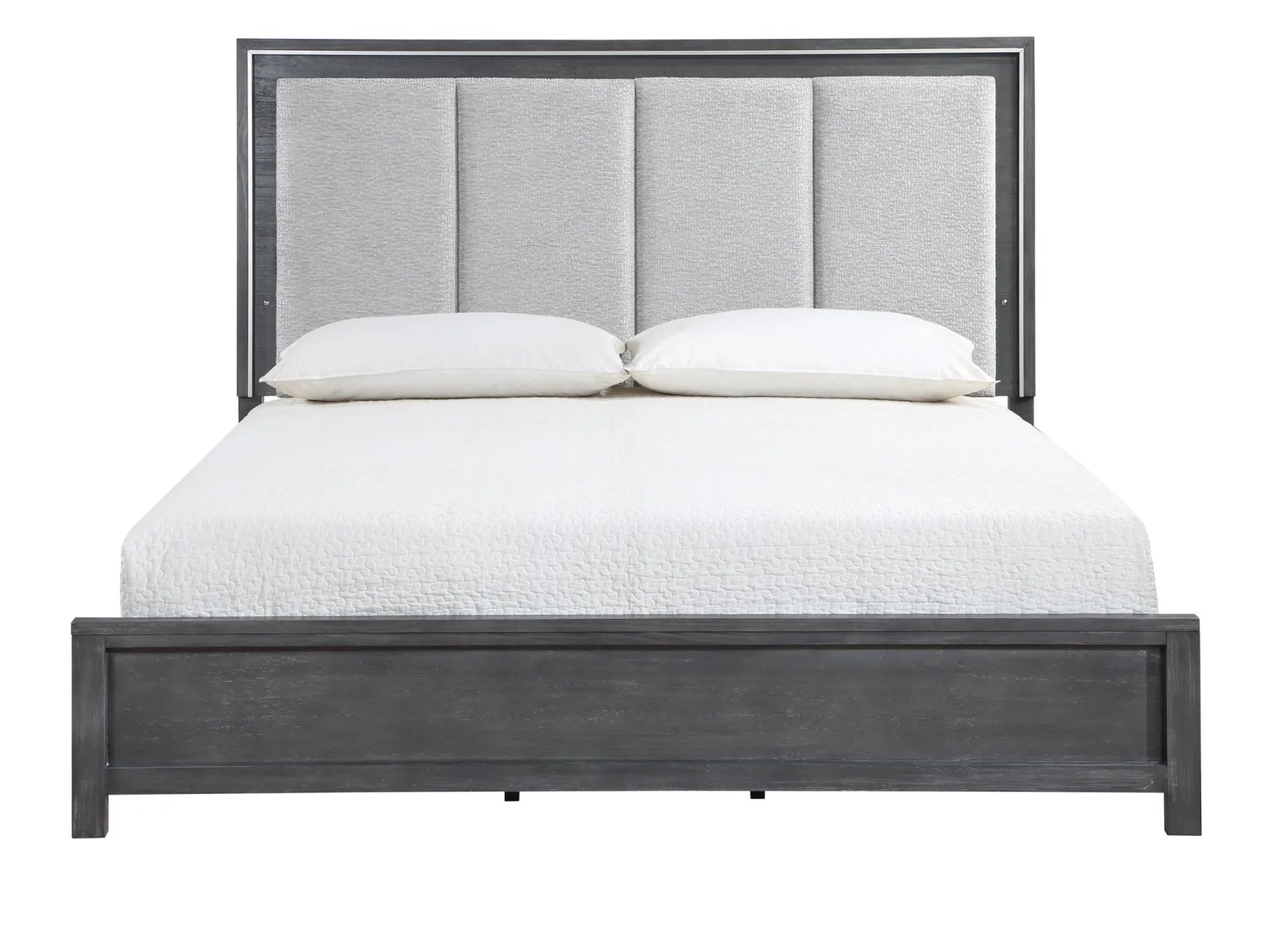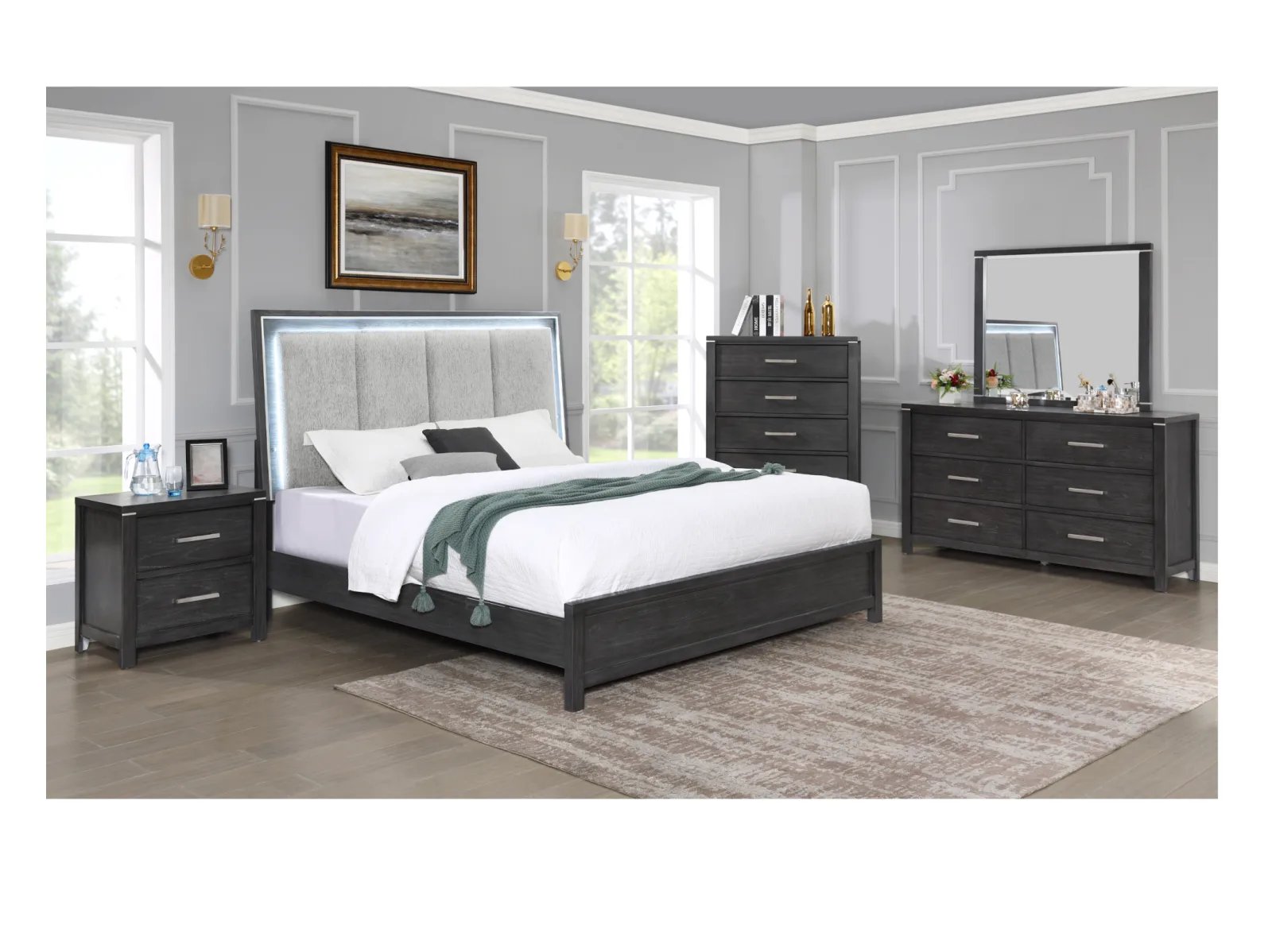& Free ShippingThe Odell Lake Bedroom Collection embodies modern sophistication and luxurious comfort. Crafted with high-quality pine solids and Mindy veneers, this collection showcases the perfect blend of durability and beauty. The charcoal gray finish with white hangup adds a touch of elegance and depth to each piece. The ball bearing full extension glides ensure smooth and effortless drawer operation, while the French front and English back dovetailed drawers provide exceptional strength and durability. With finished interiors, every detail exudes refinement. The chrome pulls and case edge accents add a contemporary flair. The plush padded headboard features silver trim and LED lighting, creating a captivating focal point and an ambiance of tranquility. Create a bedroom oasis that combines modern style and ultimate comfort with the Odell Lake Bedroom Collection.