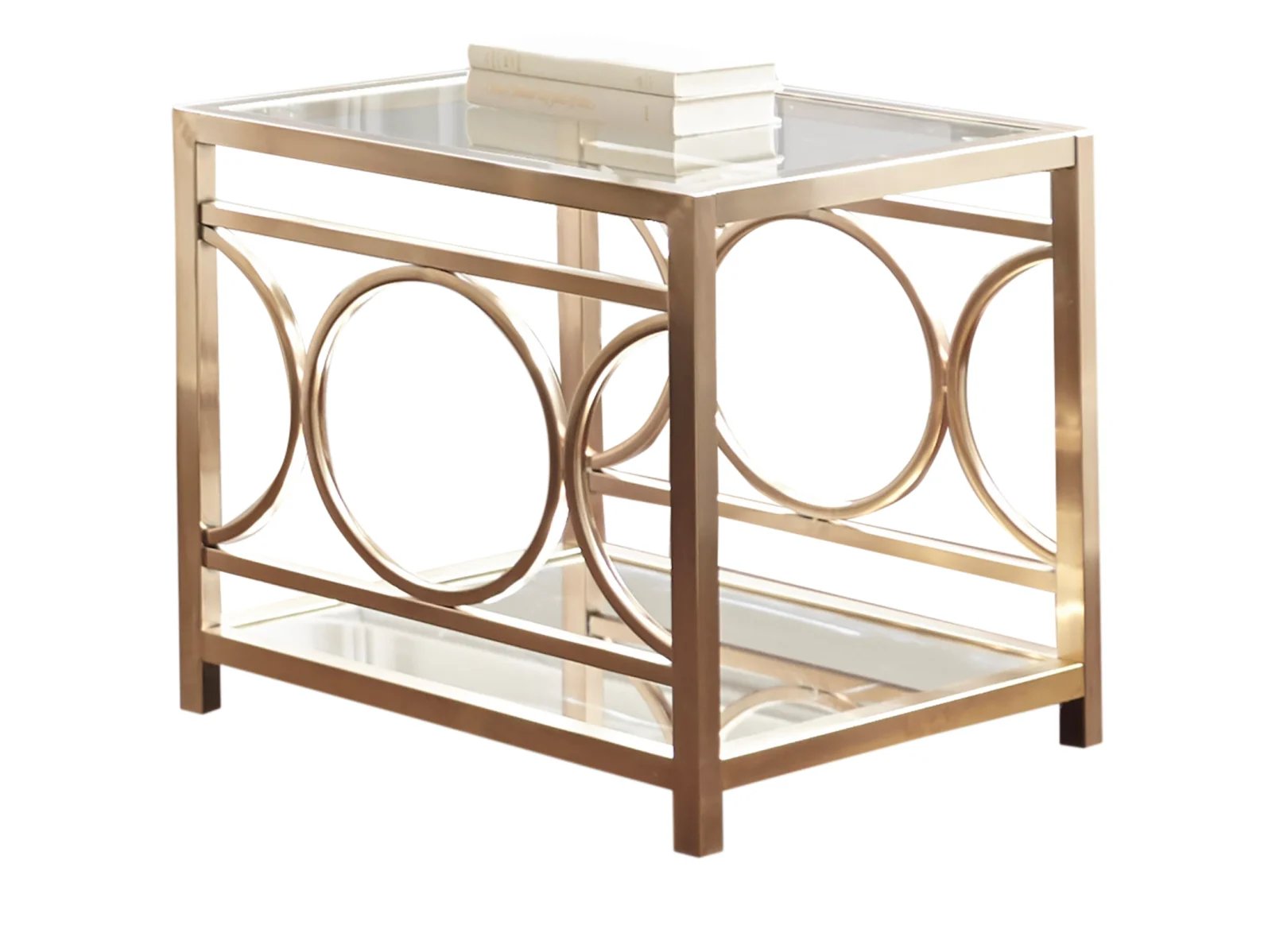& Free ShippingAdd a little Hollywood glitz and glamour to your living room with the Opelika occasional tables. Who says your living tables have to be ordinary? This occasional set is sure to steal the show with contemporary styling, gold chrome, glass top and mirrored bottom shelf. Concentric circles on table ends make these tables stand out and are sure to brighten up any living room setting.