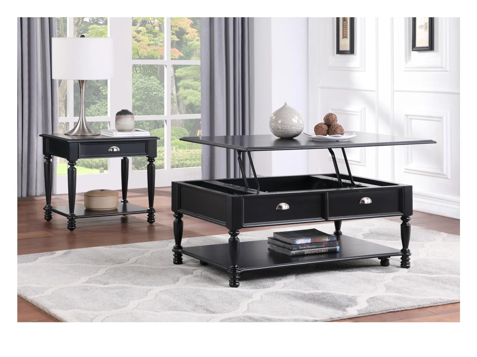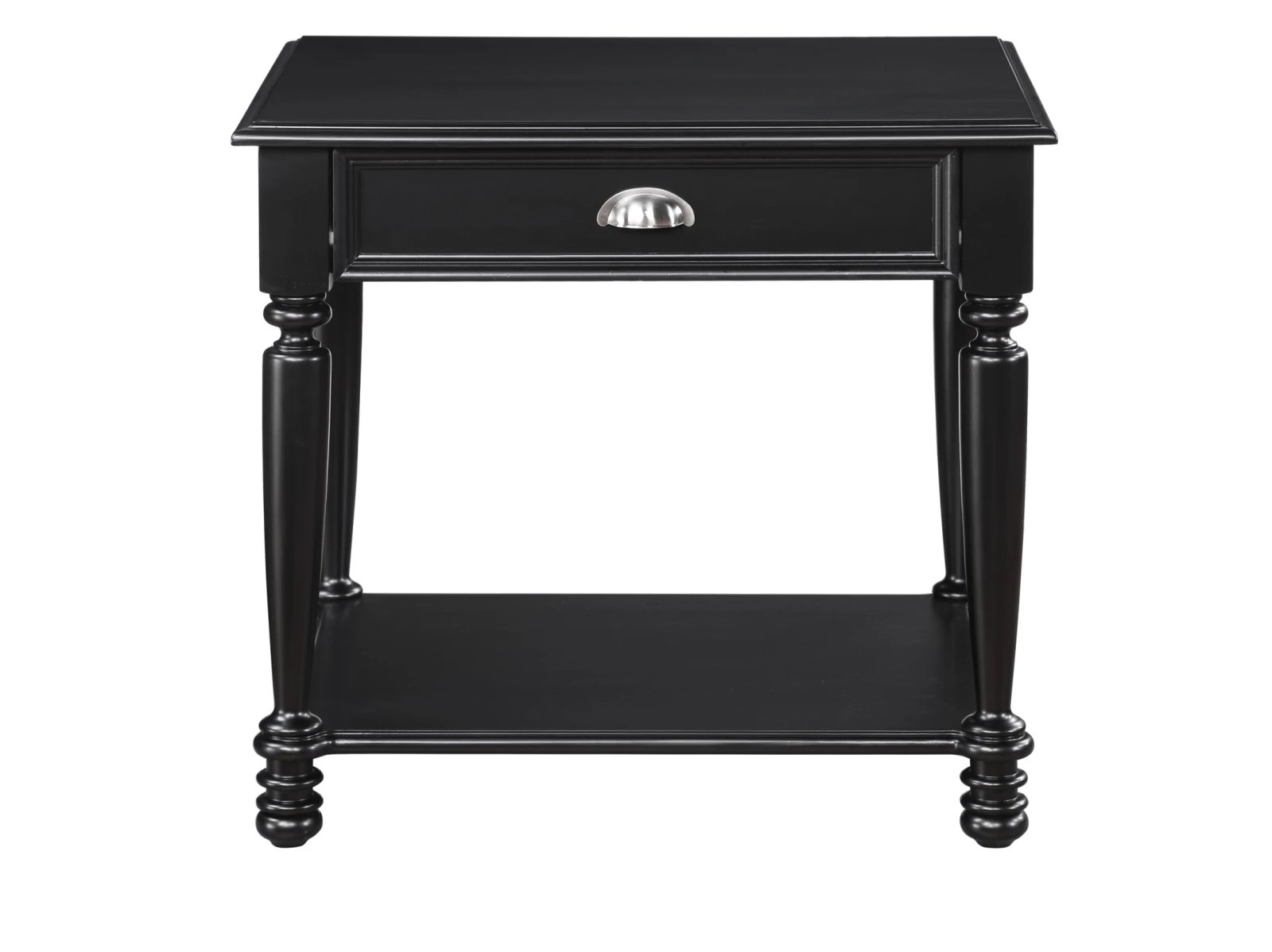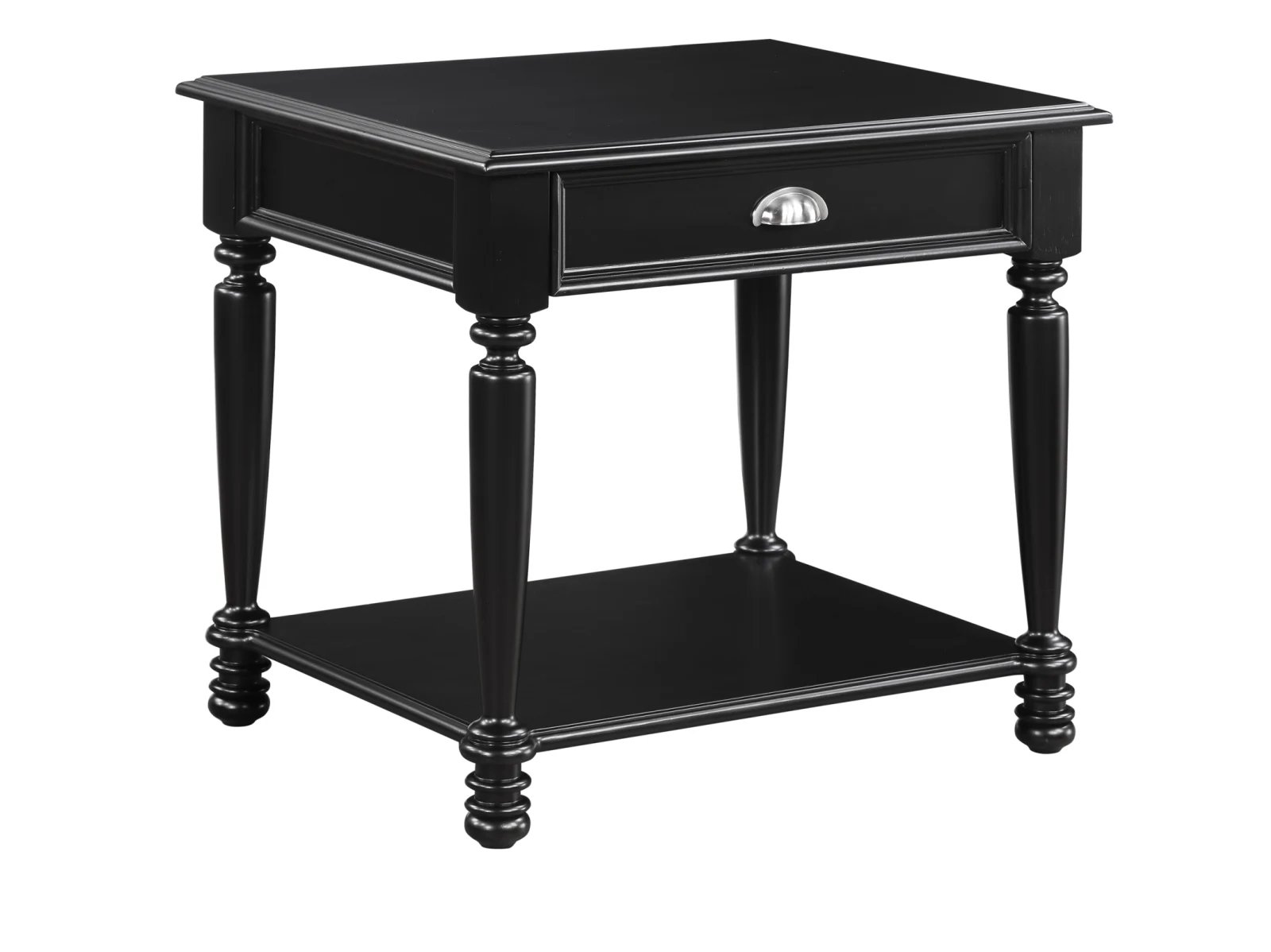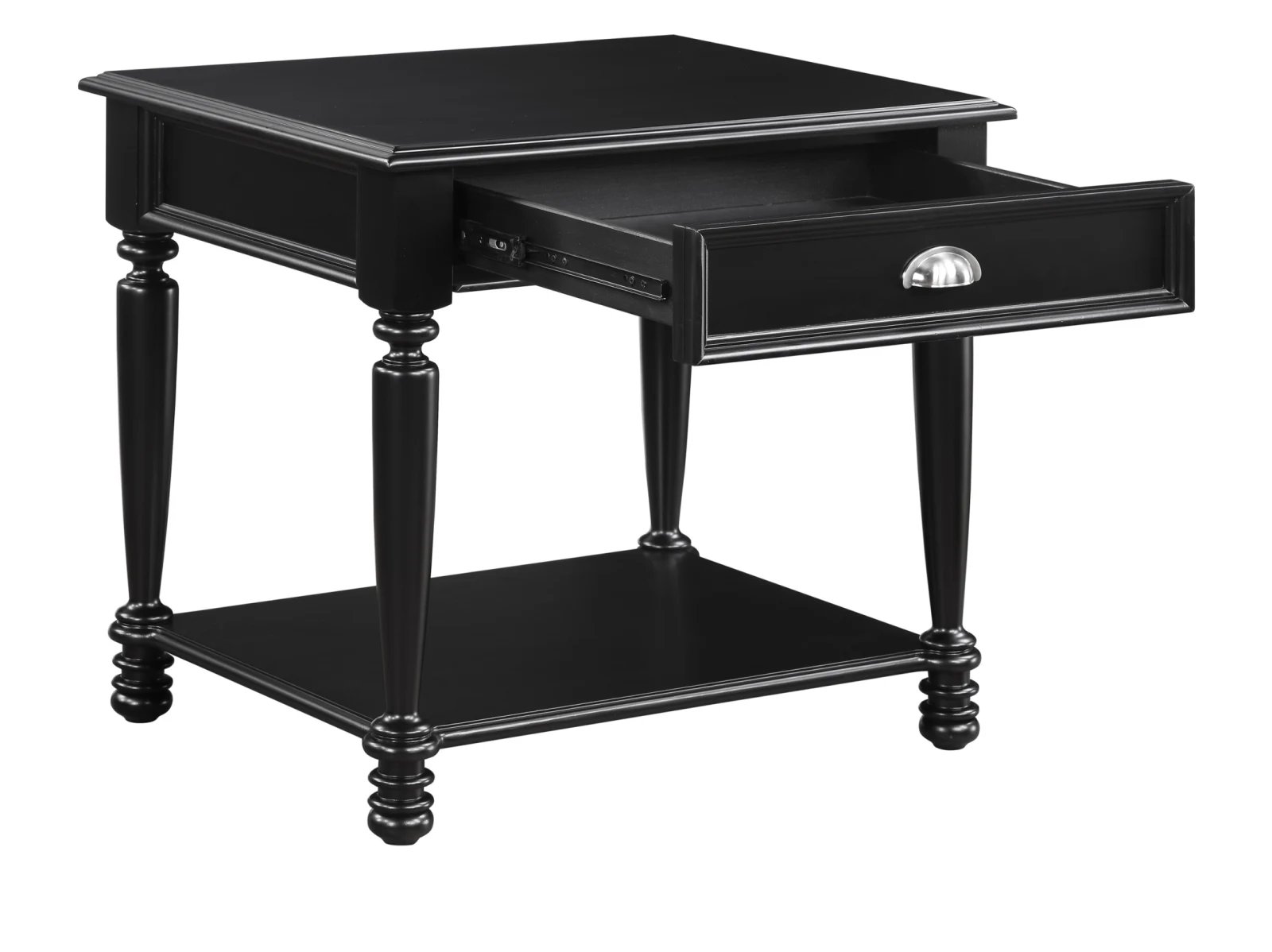 & Free ShippingProviding decorative function to your casual traditional living room is the Orbit Collection. The end table has a black finish with traditional accenting of turned legs, cup hardware, display shelf and functional drawer that lend to the classic design.