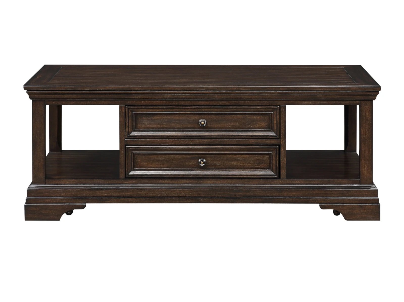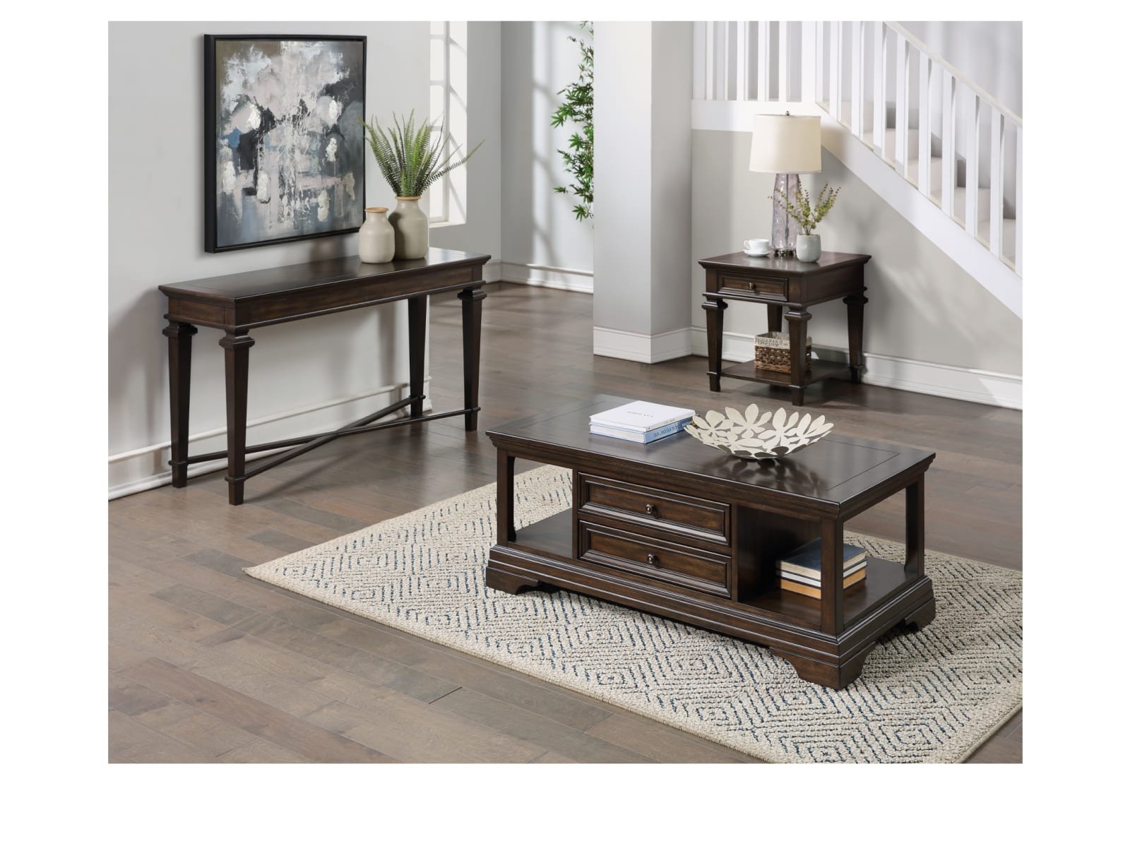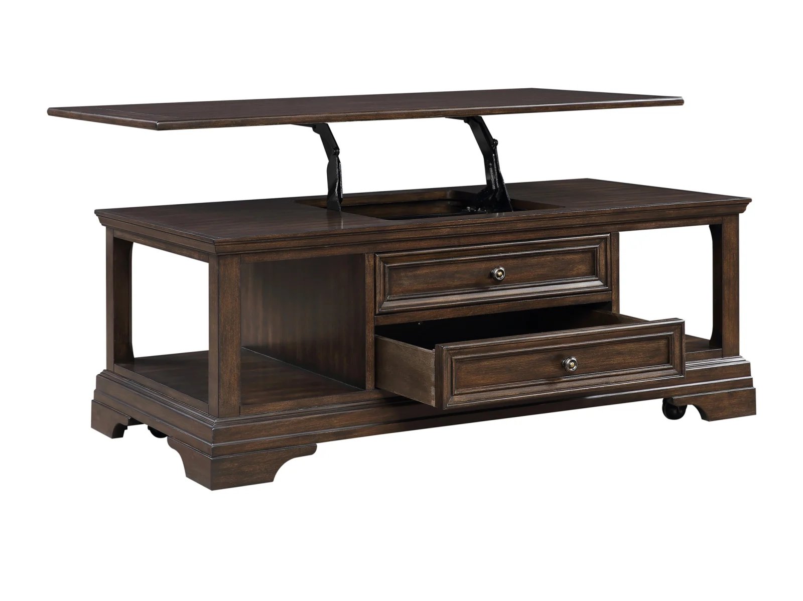 Classic design elements create a timeless look for your living room making the Paddock Collection a stylish and functional addition. Birch veneer covers the collection with an espresso finish utilized to highlight the distinct grain of the wood. The lift-top cocktail table allows for ease of access to items on your tabletop, whether it be a meal or electronic device, while open shelving and drawer storage create additional functional use for the cocktail table.