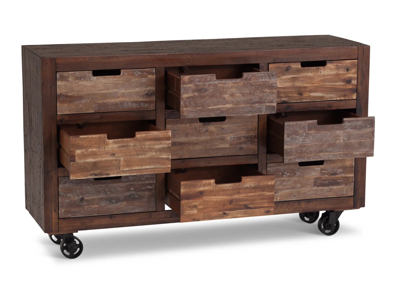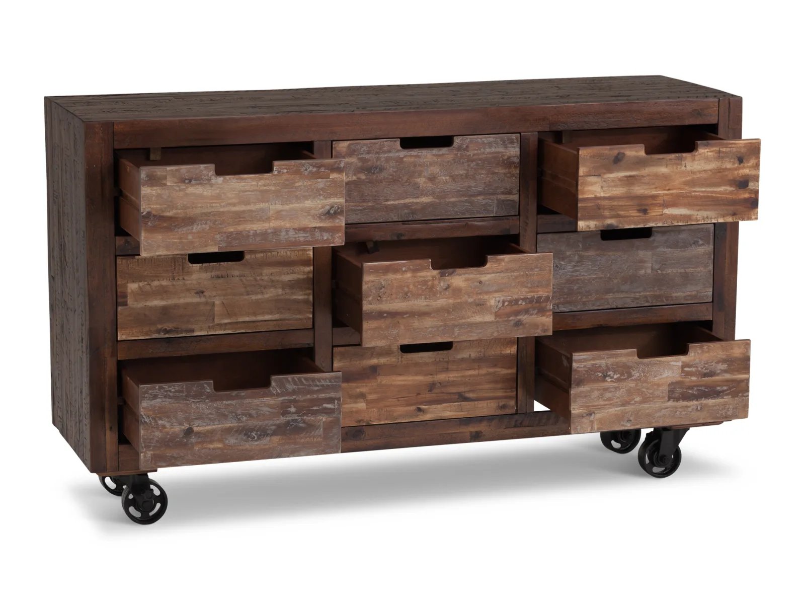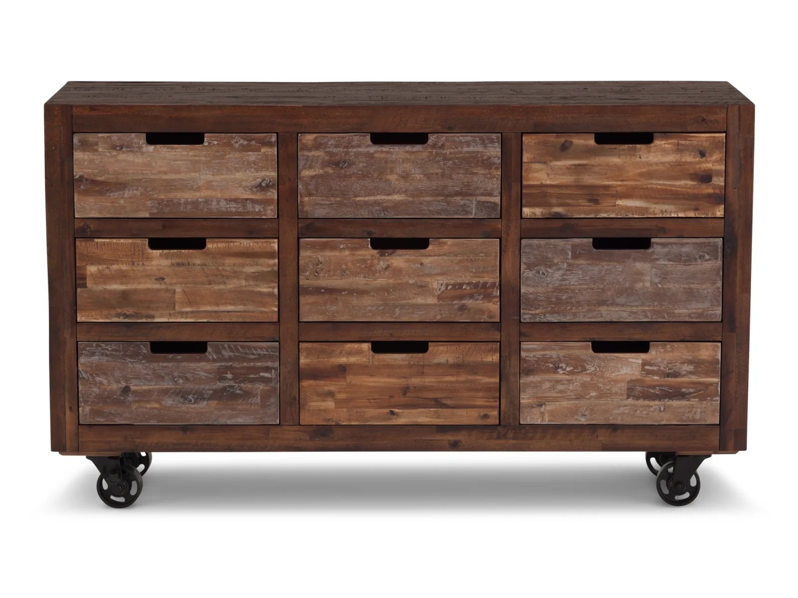 & Free ShippingRustic style comes home with the unique Painted Canyon 9 Drawer Accent Chest. Made of solid acacia, this beautifully crafted wooden chest features nine drawers with varied distressed finish tones on their fronts. Cutout handles provide easy access, while industrial moving and locking casters allow you to maneuver the Painted Canyon from place to place. This home accent is a must-have for those seeking storage. Take home this antiqued chest today.