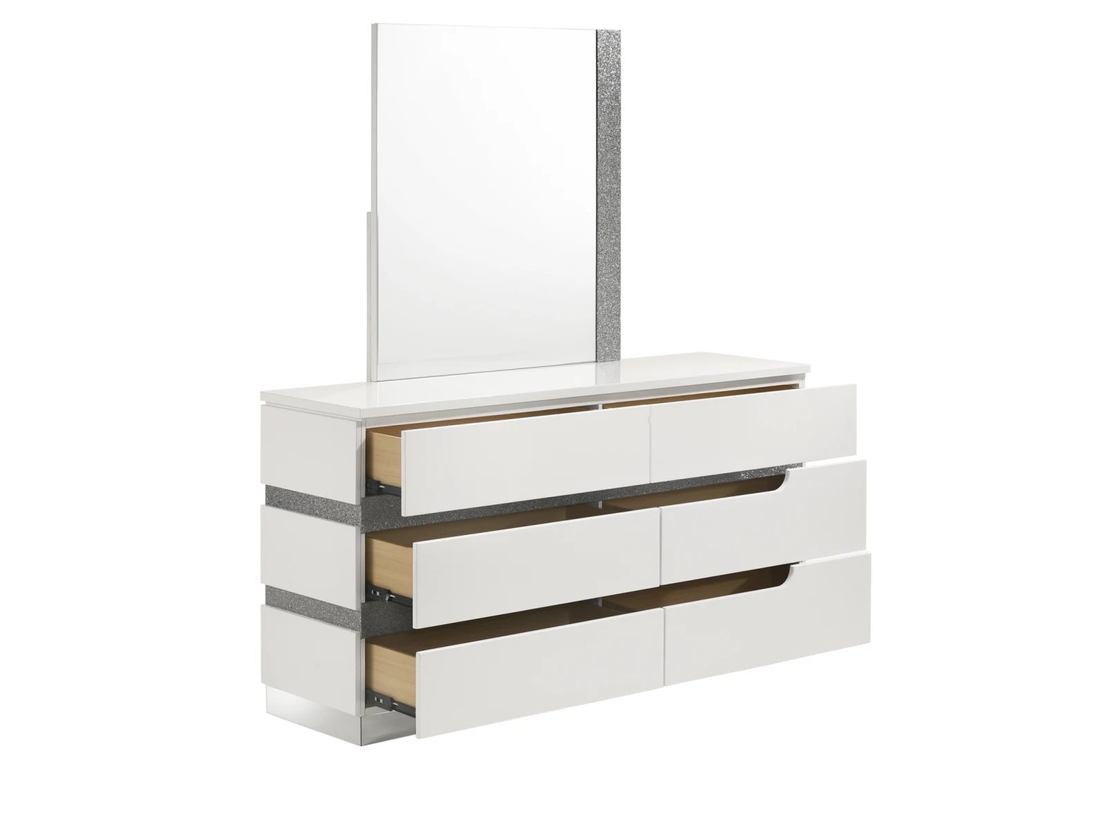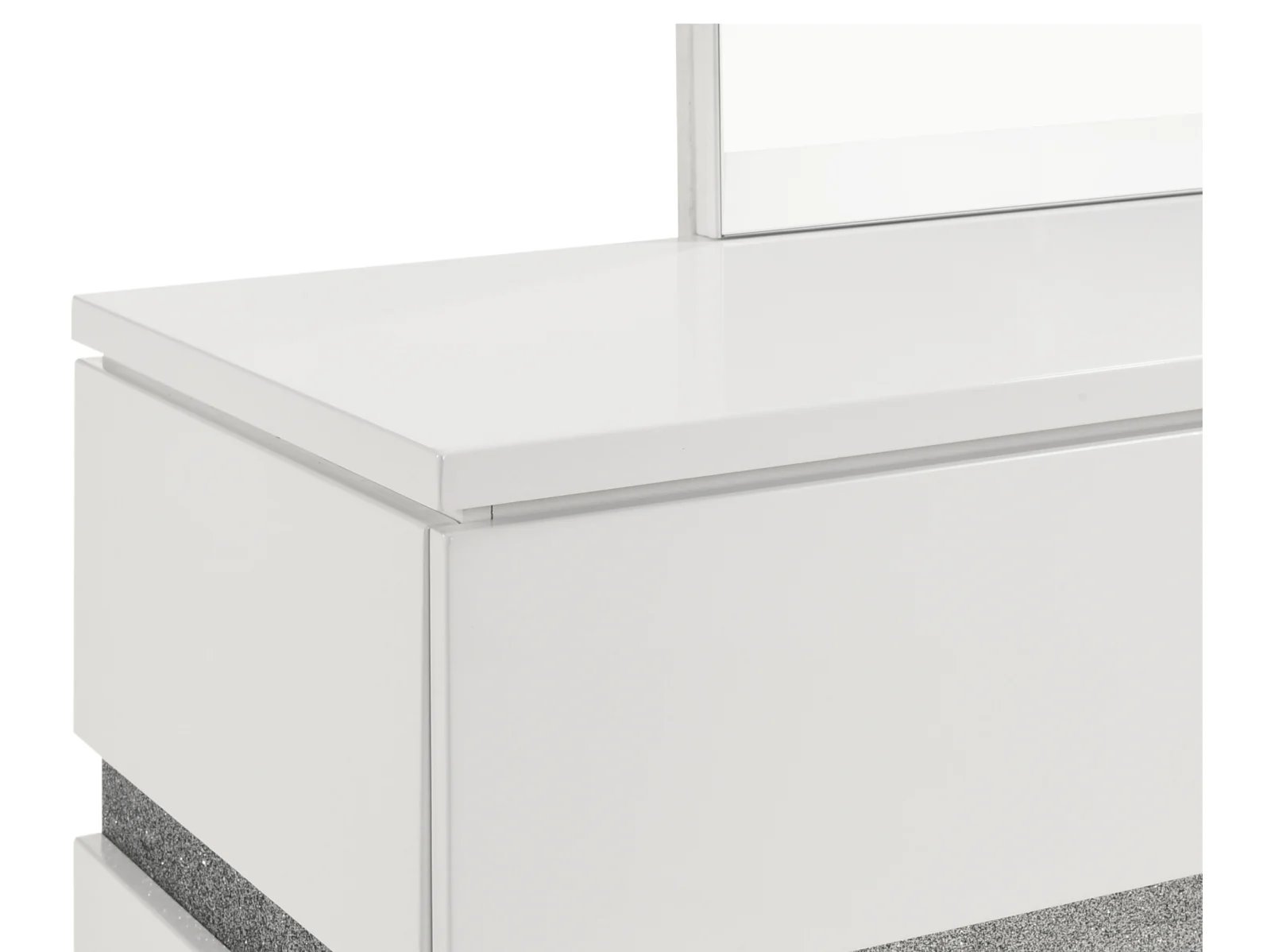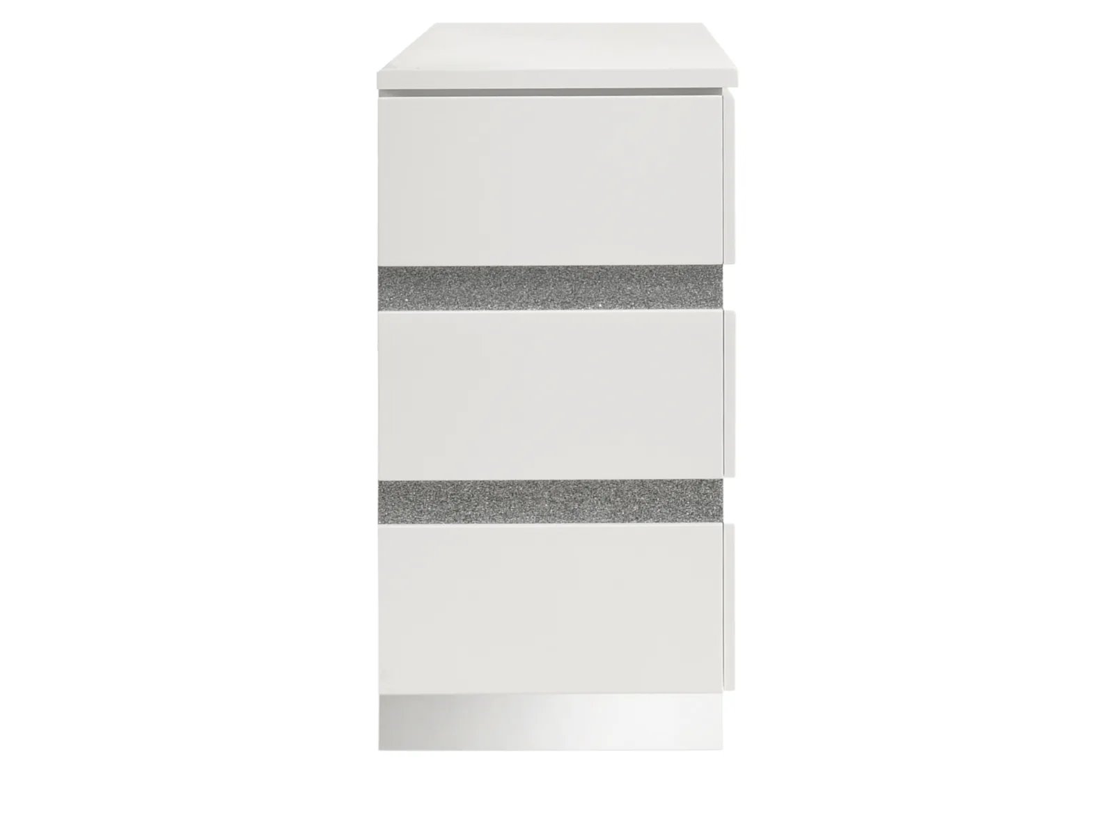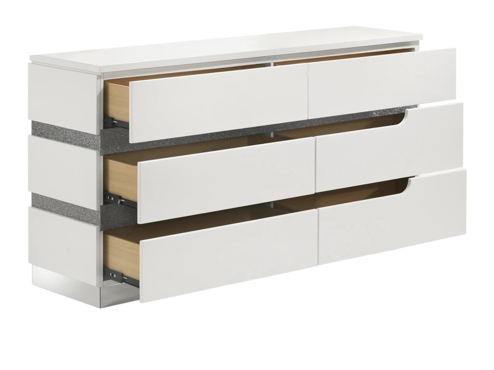 The Paparazzi Bedroom Collection is a stunning fusion of contemporary design and luxurious functionality. Its white gloss laminate water-resistant finish adds a sleek and modern touch while ensuring durability. The full extension drawer glides allow for effortless access and smooth operation, while the finished drawer interiors showcase attention to detail. The crushed crystal accents create a dazzling and glamorous effect, elevating the overall aesthetic. With LED lighted headboard, footboard, and rails with touch control, this collection creates a captivating ambiance and adds a touch of opulence to your bedroom. Experience the perfect blend of style and functionality with the Paparazzi Bedroom Collection and transform your space into a haven of modern luxury.