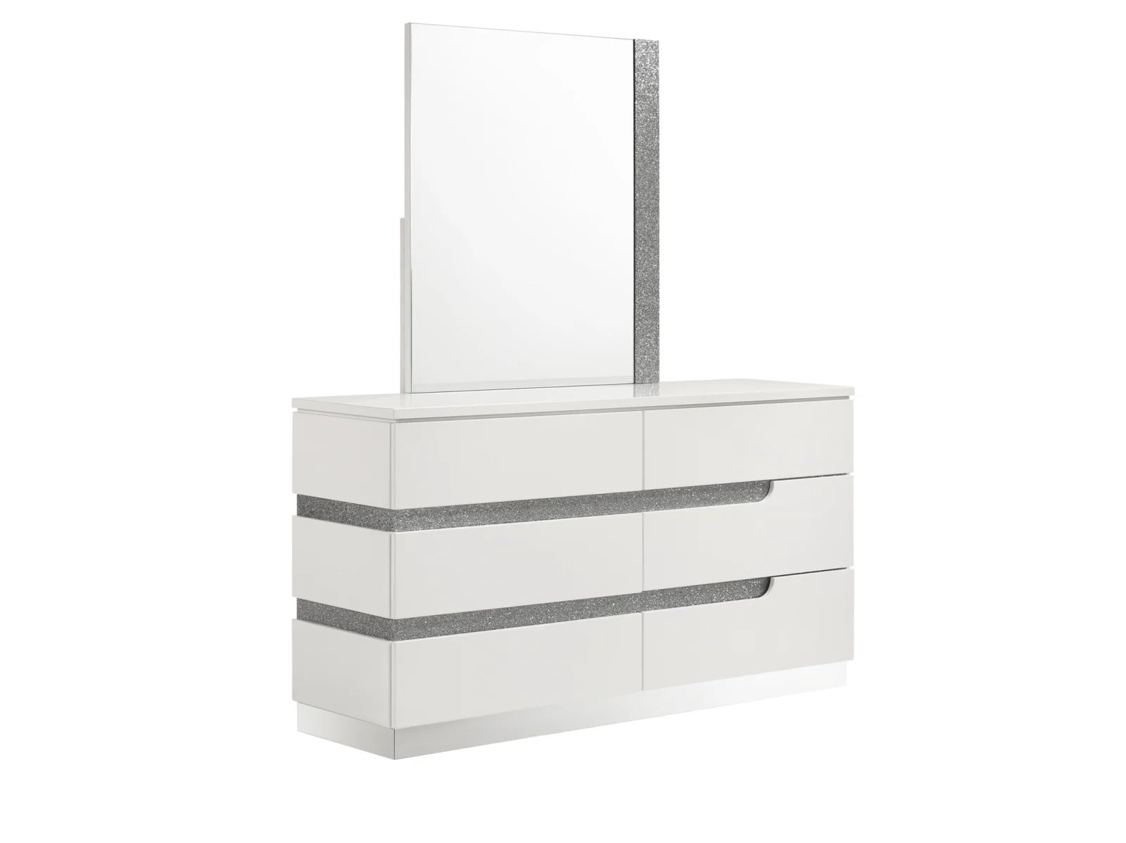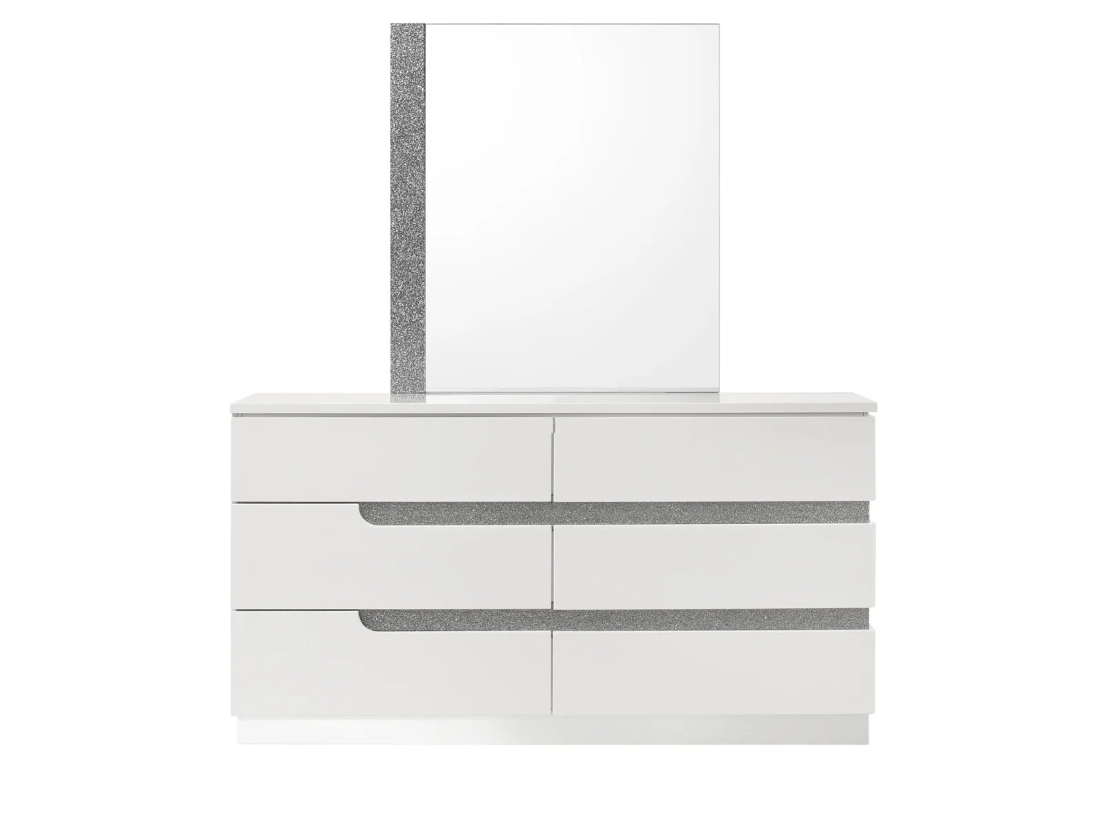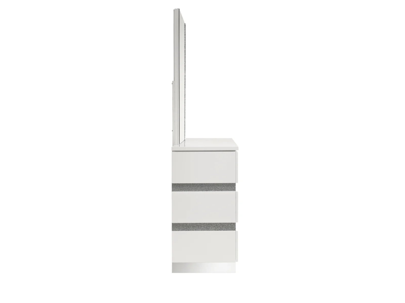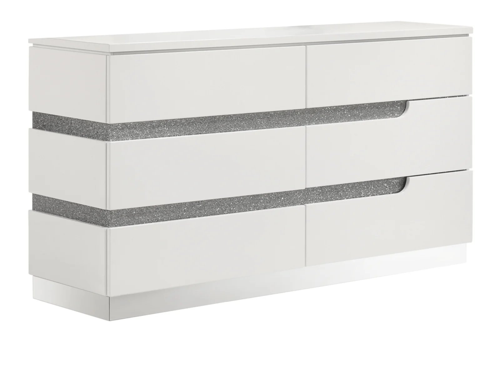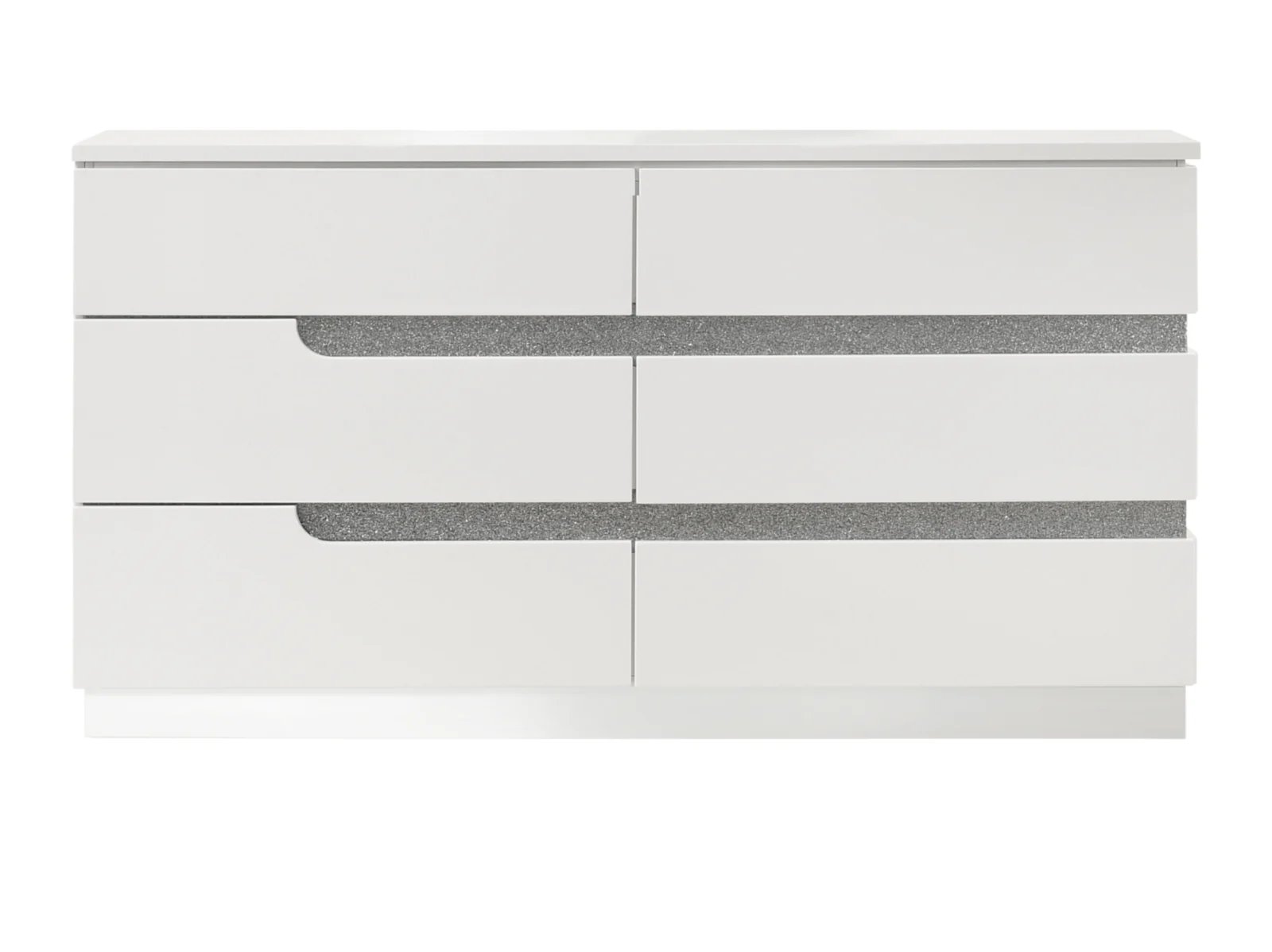 The Paparazzi Bedroom Collection is a stunning fusion of contemporary design and luxurious functionality. Its white gloss laminate water-resistant finish adds a sleek and modern touch while ensuring durability. The full extension drawer glides allow for effortless access and smooth operation, while the finished drawer interiors showcase attention to detail. The crushed crystal accents create a dazzling and glamorous effect, elevating the overall aesthetic. With LED lighted headboard, footboard, and rails with touch control, this collection creates a captivating ambiance and adds a touch of opulence to your bedroom. Experience the perfect blend of style and functionality with the Paparazzi Bedroom Collection and transform your space into a haven of modern luxury.