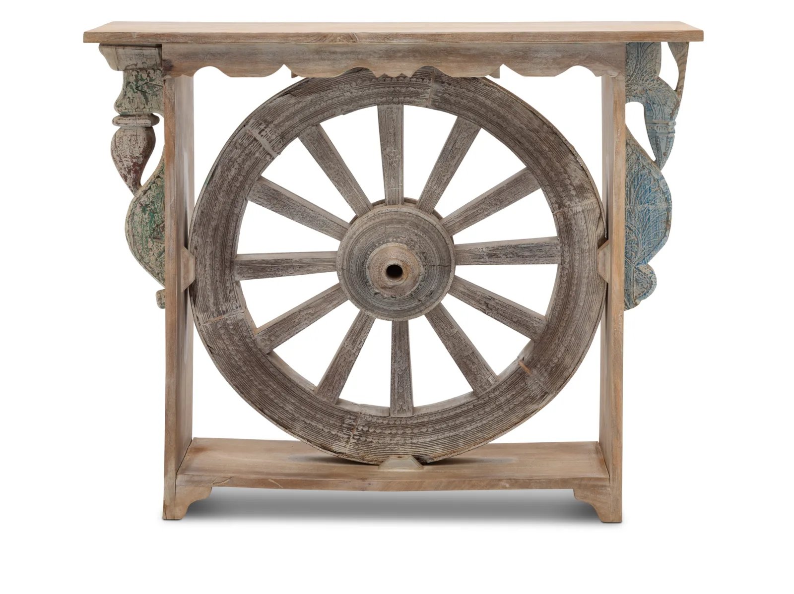 & Free ShippingThe Patiala Console Table effortlessly blends eclectic style and impeccable craftsmanship. Crafted from high-quality wood, its solid construction ensures durability and longevity, making it a functional and statement piece for years to come. The Patiala features a natural-toned finish that adds warmth and versatility, complementing its carved detailing, and it boasts exquisite three-dimensional side detailing, offering a visual depth that captures attention from every angle. The wheel-inspired accent in its base brings a touch of industrial flair, infusing the design with a hint of vintage allure. Embrace eclectic elegance and elevate your interior with this remarkable piece.