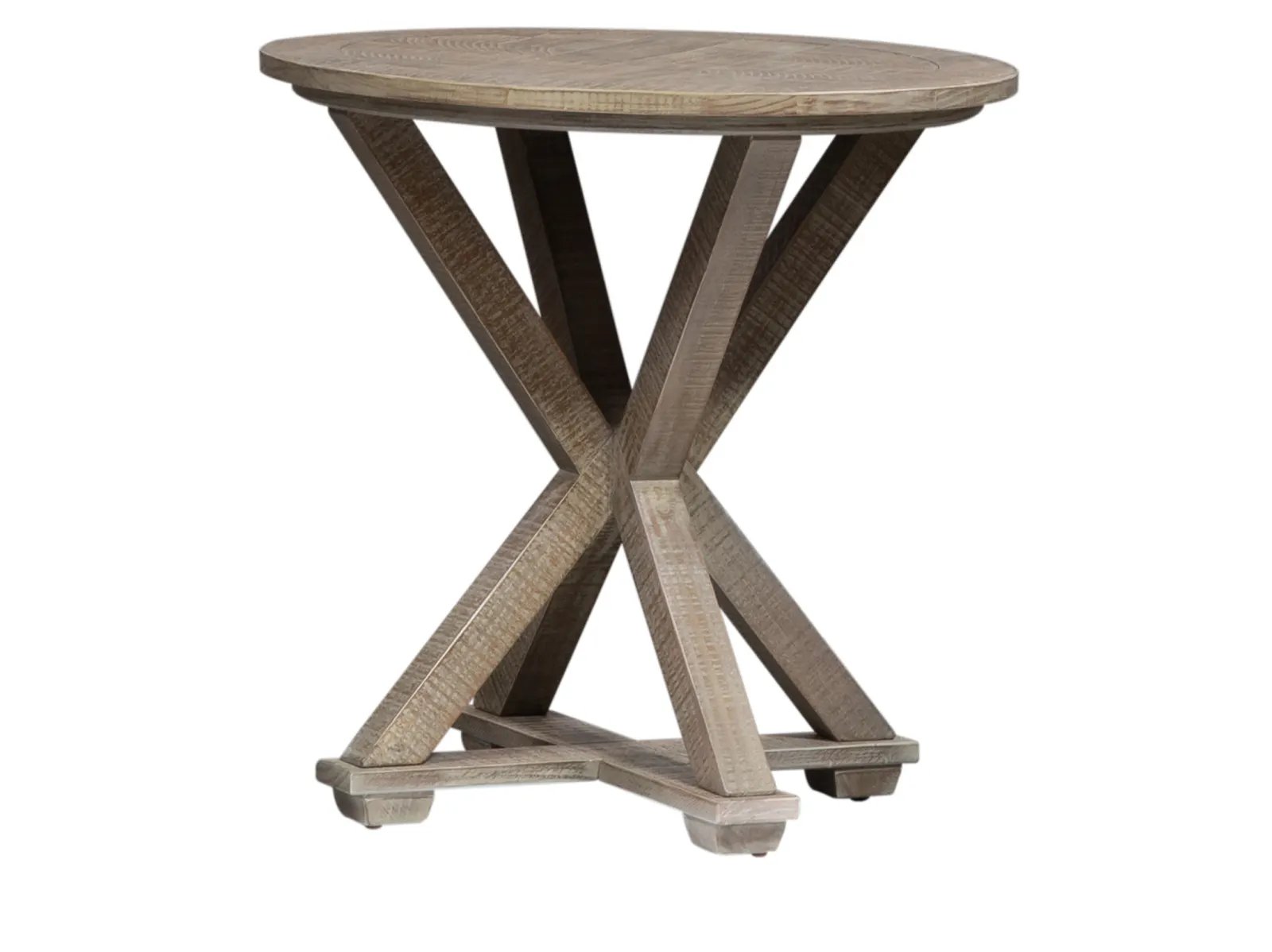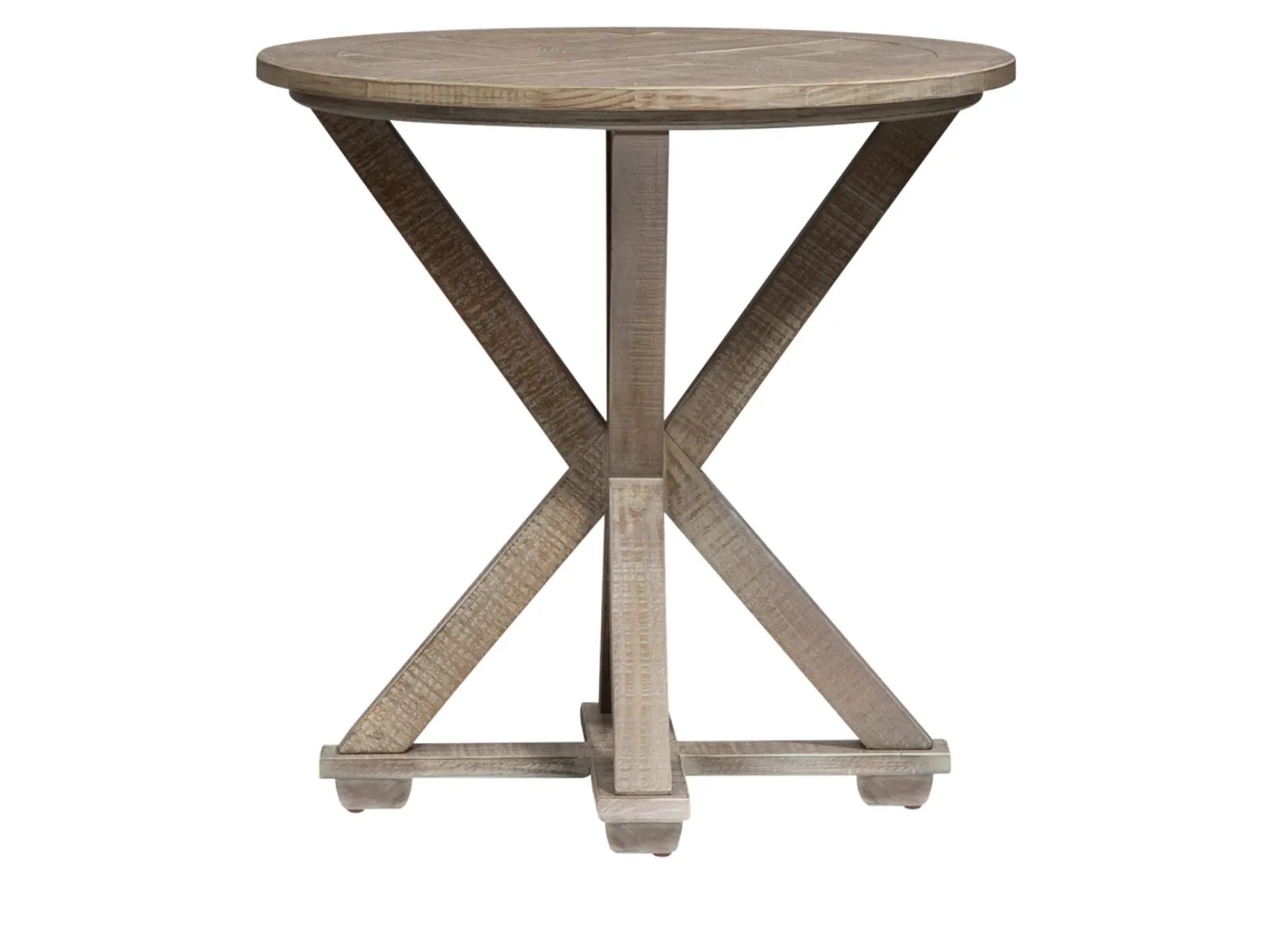 Elevate your space with the contemporary Pine rove round end table. Crafted of pine solids and knotty pine veneers, this piece features a weathered taupe finish with saw mark distressing, appealing planked top, anchored by a unique pedestal base. This piece is a great addition to any rustic, contemporary, or casual living space.