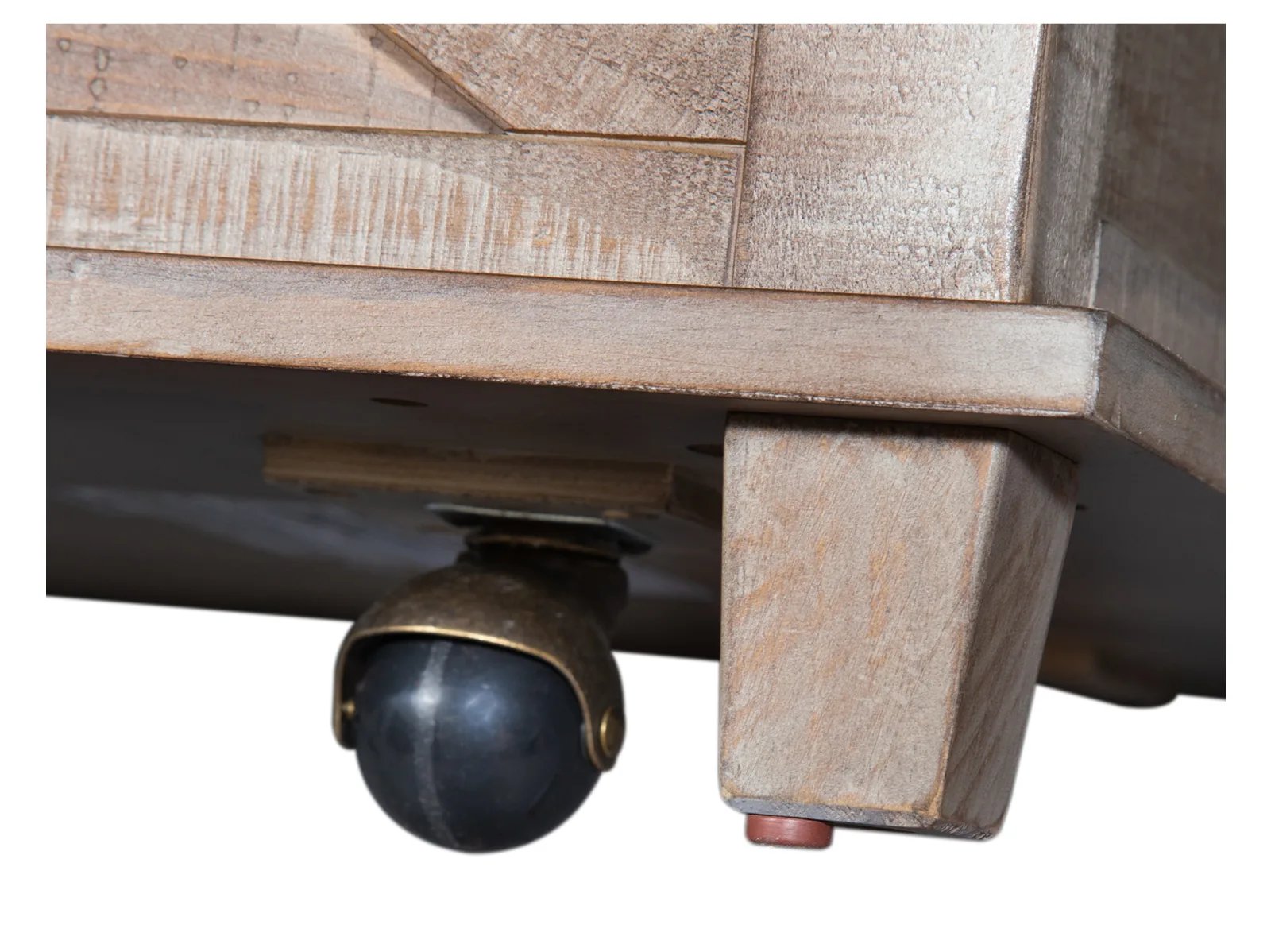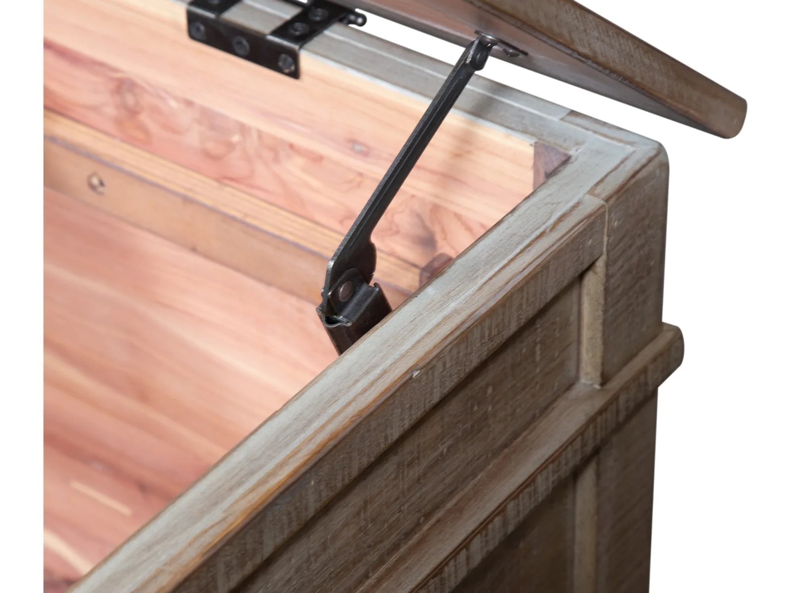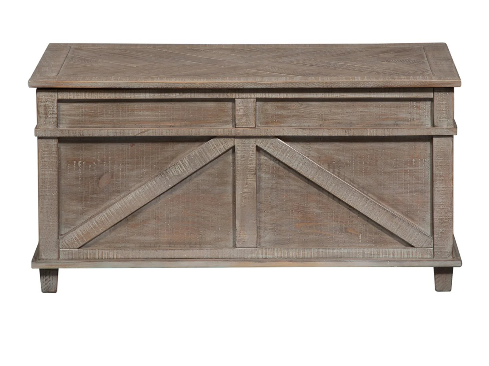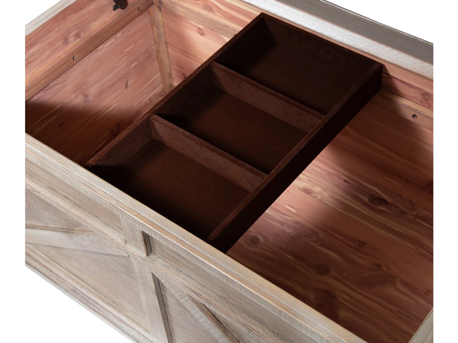 & Free ShippingAccent your space with the contemporary Pine Grove storage trunk. Crafted of pine solids and knotty pine veneers, this piece features a weathered taupe finish with saw mark distressing, an appealing planked top, casters for easy movability, a felt lined removeable jewelry tray, and a cedar lined interior with abundance of storage space. This piece is a great addition to any rustic, contemporary, or casual living space.