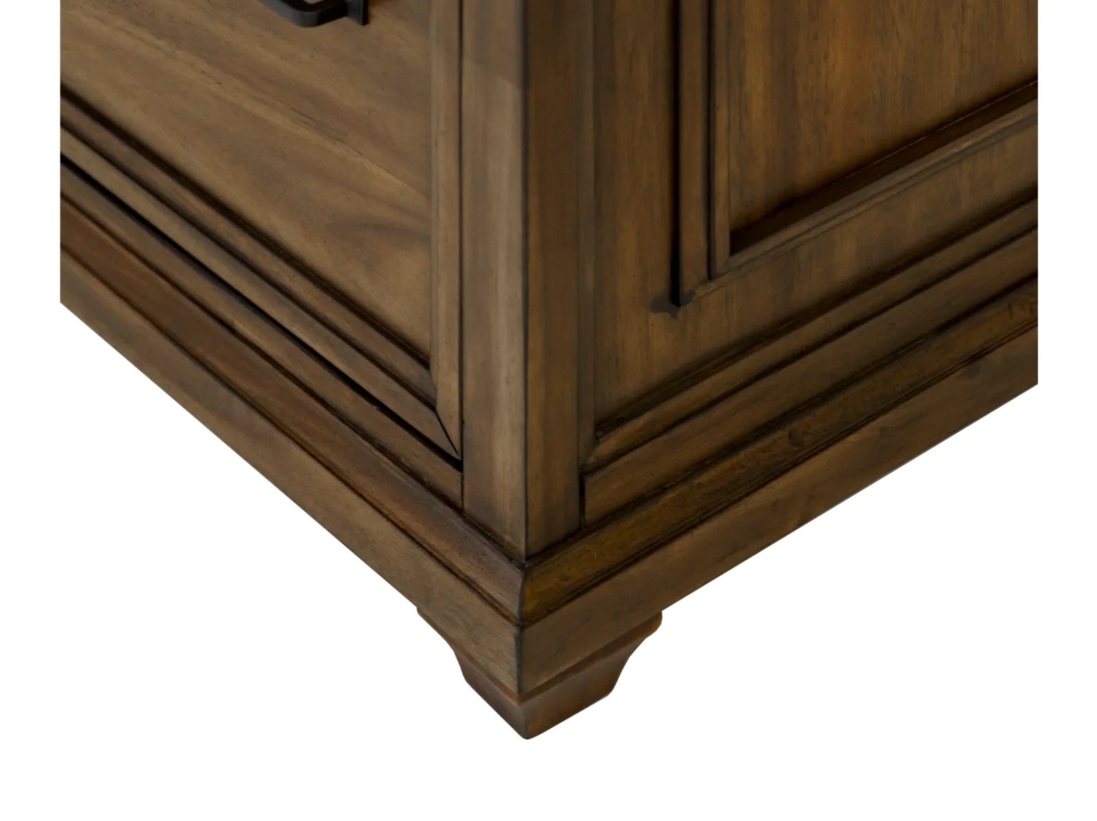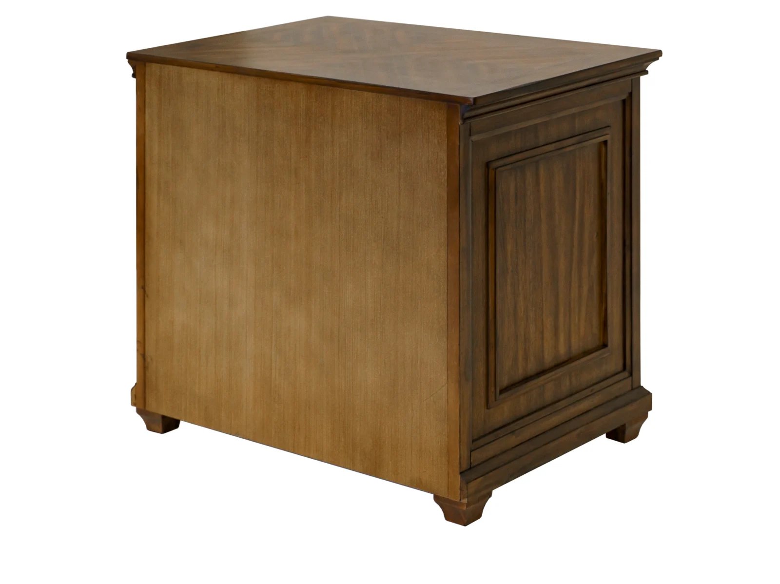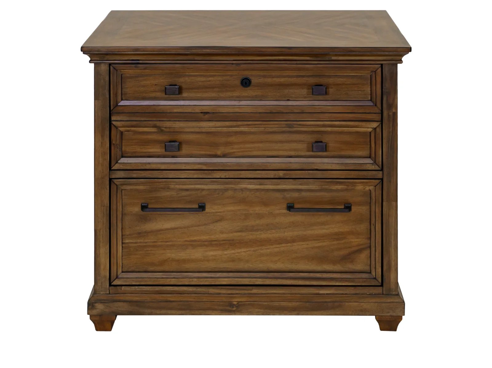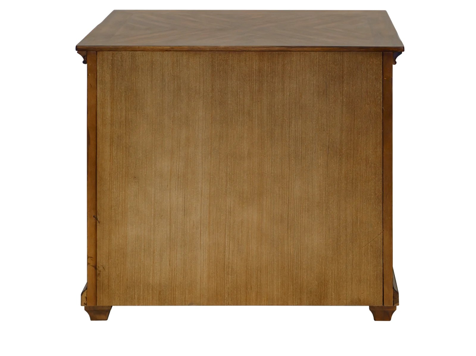 Plathe is a standout collection with classic style. Natural wood veneers finished in warm brown with soft gold undertones feature a unique herringbone pattern with center “X” design. The vintage finish allows the natural wood grain to show through with added detail for an aged appearance, creating a casual yet elegant look. Captured end panels with additional moldings emphasize its clean straight forward appeal. The Plathe File Cabinet features two file drawers with the top including a lock.