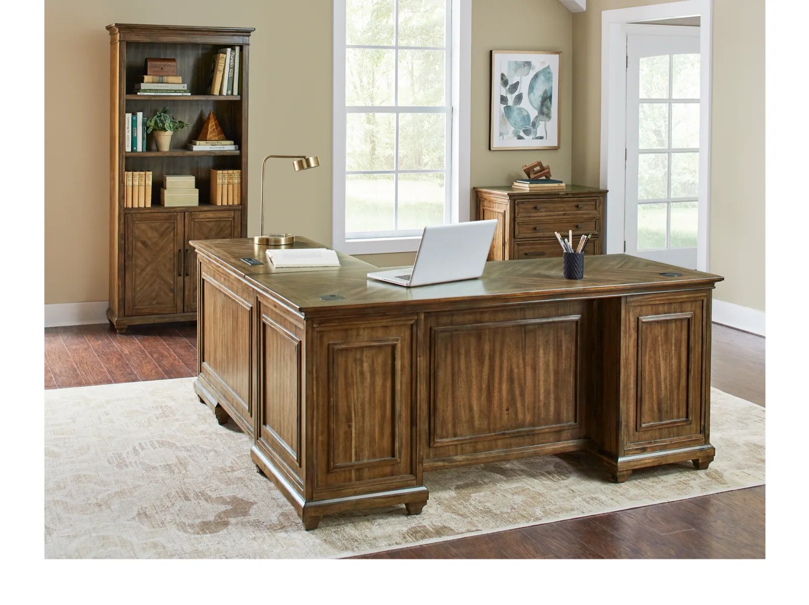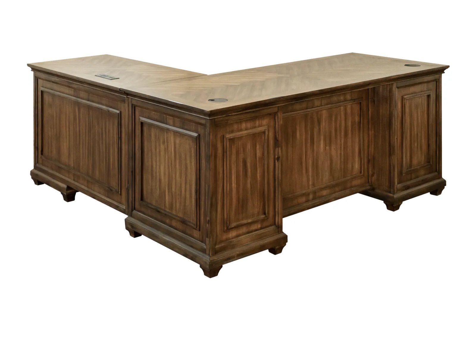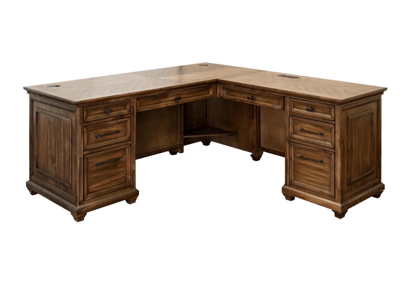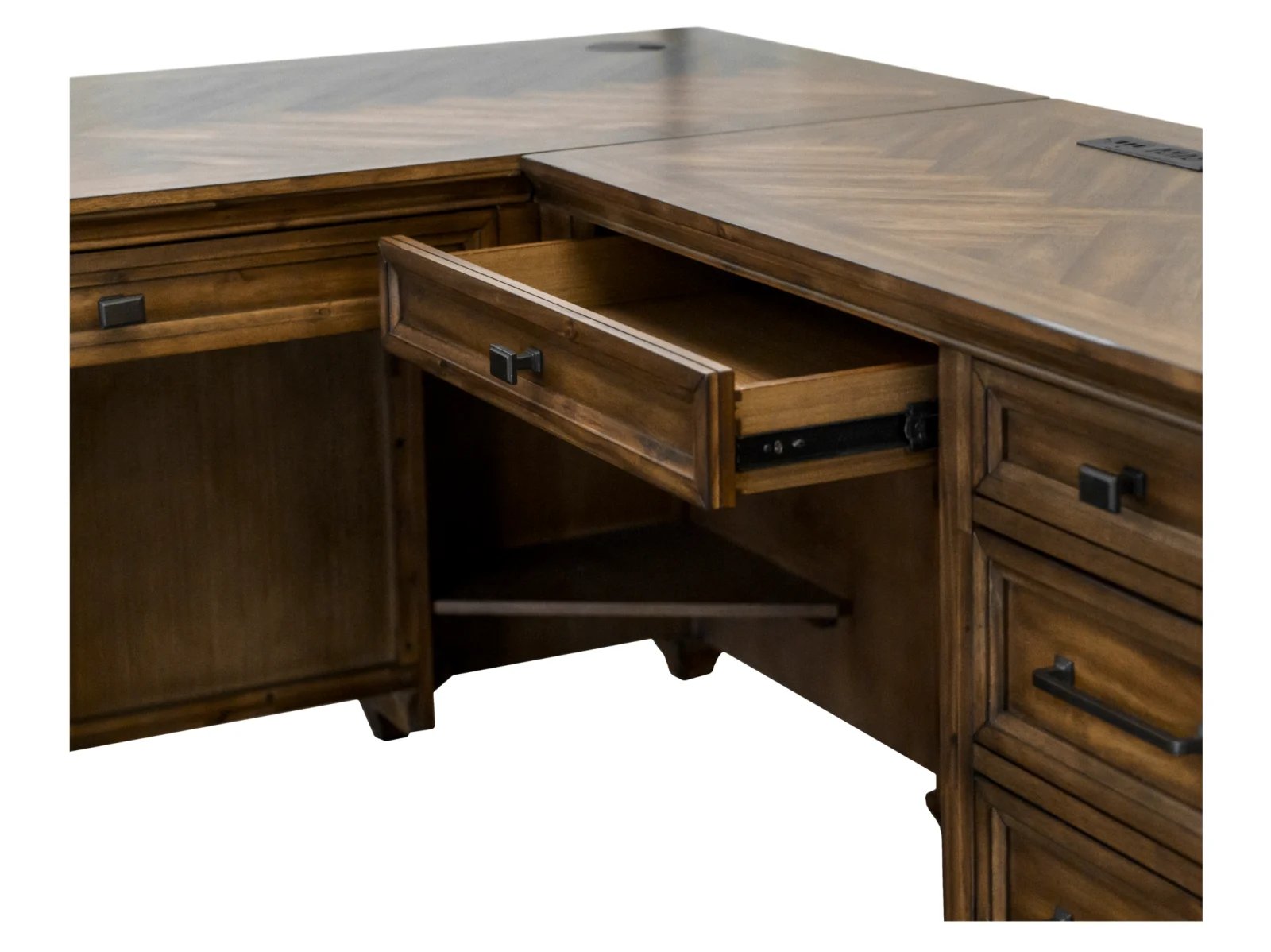 Plathe is a standout collection with classic style. Natural wood veneers finished in warm brown with soft gold undertones feature a unique herringbone pattern with center “X” design. The vintage finish allows the natural wood grain to show through with added detail for an aged appearance, creating a casual yet elegant look. Captured end panels with additional moldings emphasize its clean straight forward appeal. The Plathe Pedestal L Shaped Desk features six storage drawers and two locking file drawers, and a power station with USB and AC outlets.