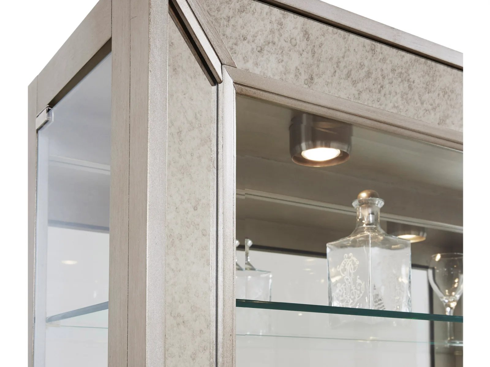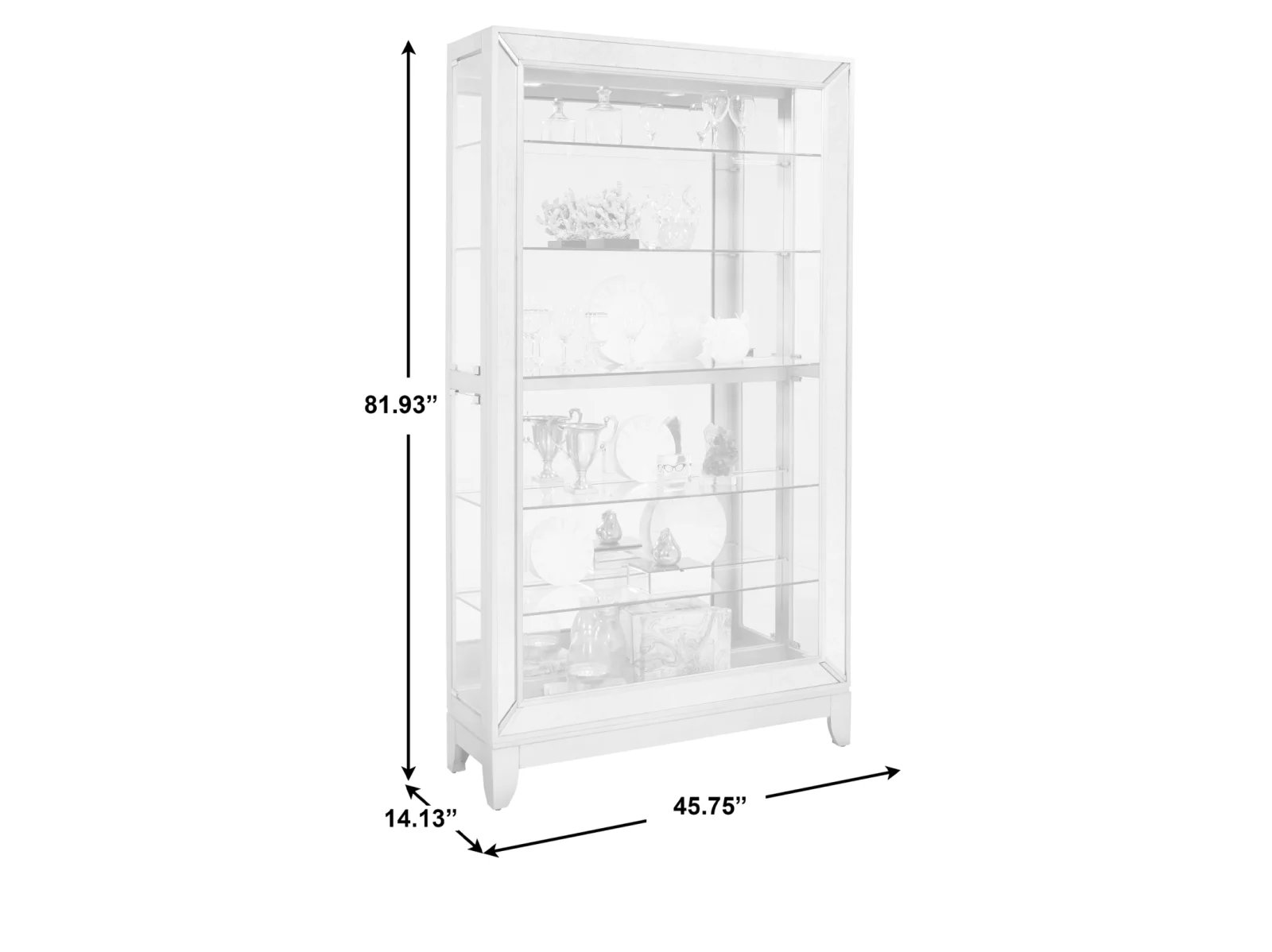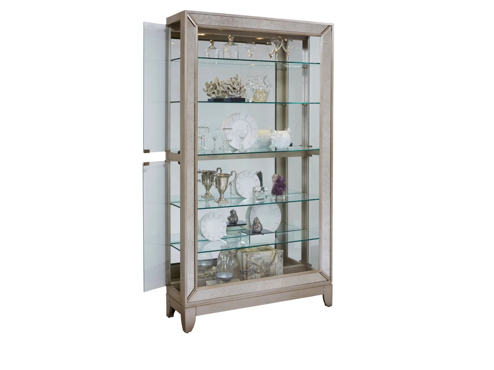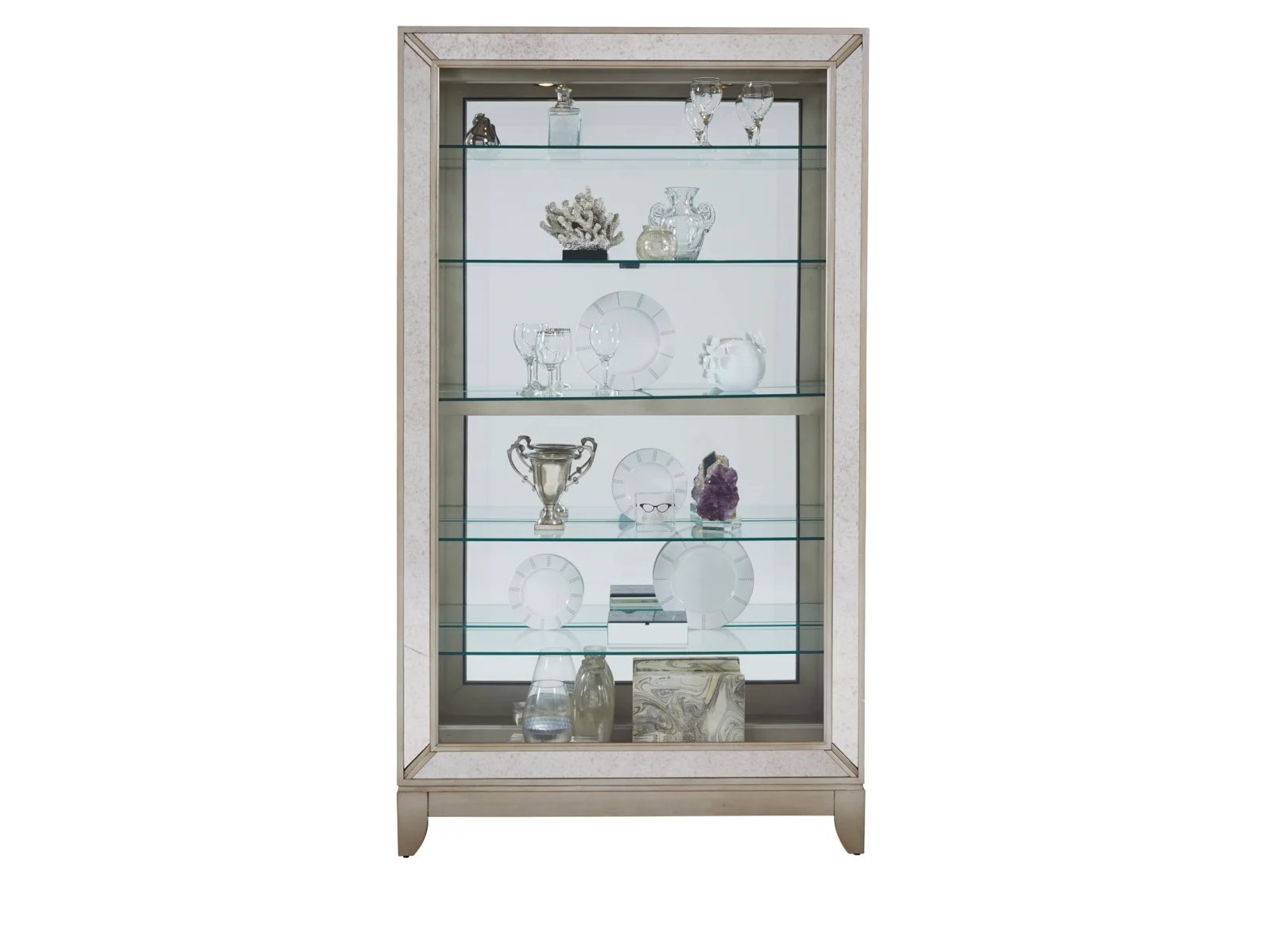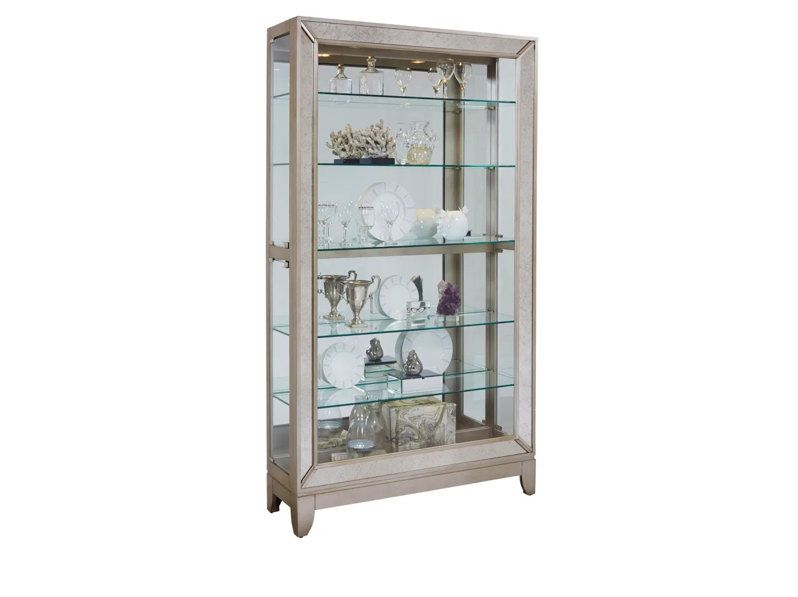 & Free ShippingTransform your room with the chic Pulaski Accents 21384 Curio! Its simple shape is elevated by antiqued mirror frame insets and a glamorous Platinum finish. Sitting gracefully on saber feet, this curio features a mirror back, high/low halogen lighting, and five adjustable glass shelves with plate grooves. Sturdily built of hardwood solids and veneers, it’s the perfect centerpiece to showcase your cherished collection.