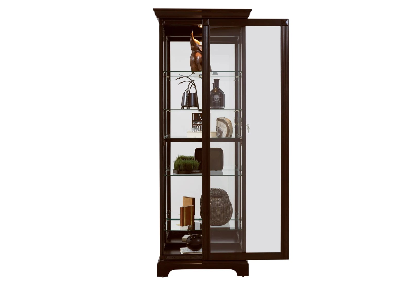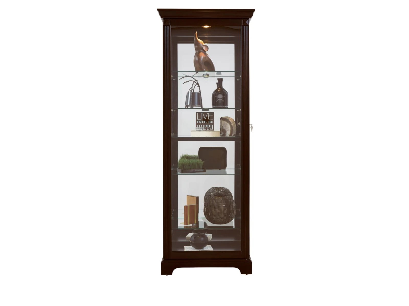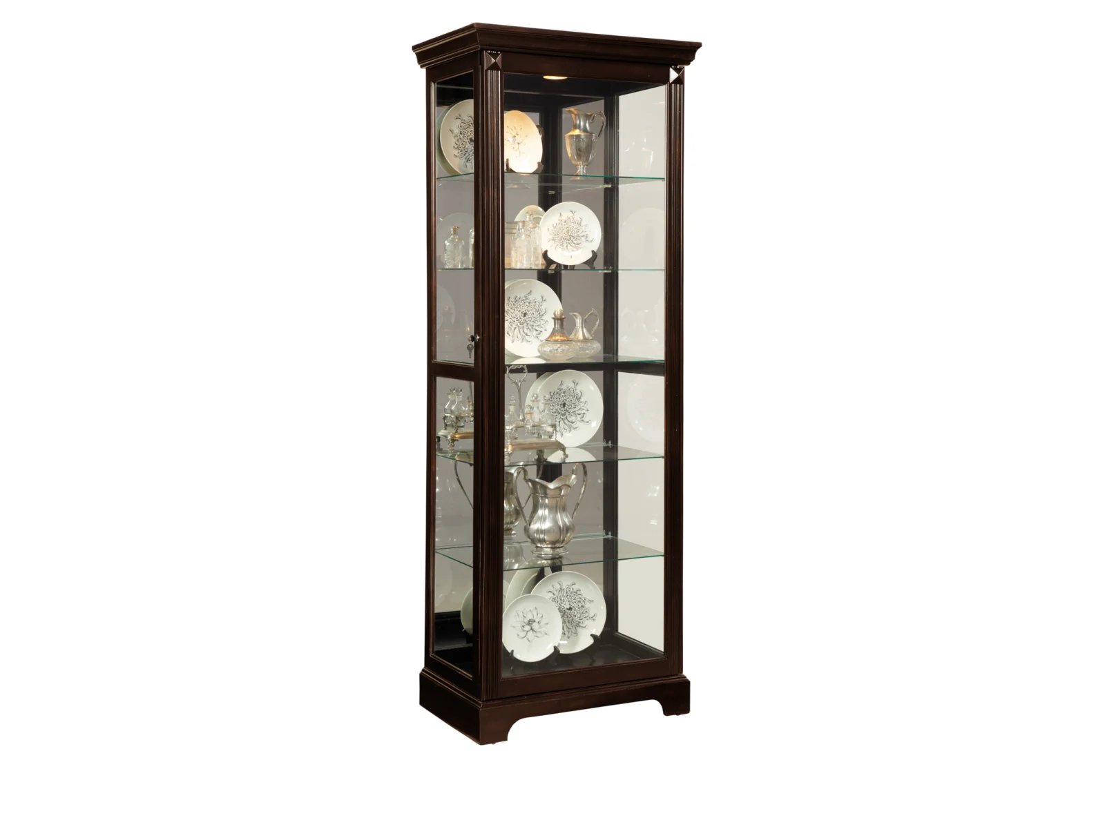 This display curio offers both high-end style and a roomy interior for your treasured collections. The dark cherry brown finish uses wood rub-through and simple design elements to reflect a transitional style that works well with any decor. The front of the case is constructed with a two-way sliding door with a lock for security, while a mirrored interior back allows you to view contents from any angle Five adjustable glass shelves offer customized storage and display, and a single halogen can-style light clicks on with a roll-switch for nighttime viewing. The case is decorated with reeded pilasters and diamond-shaped carvings at the top for added elegance.