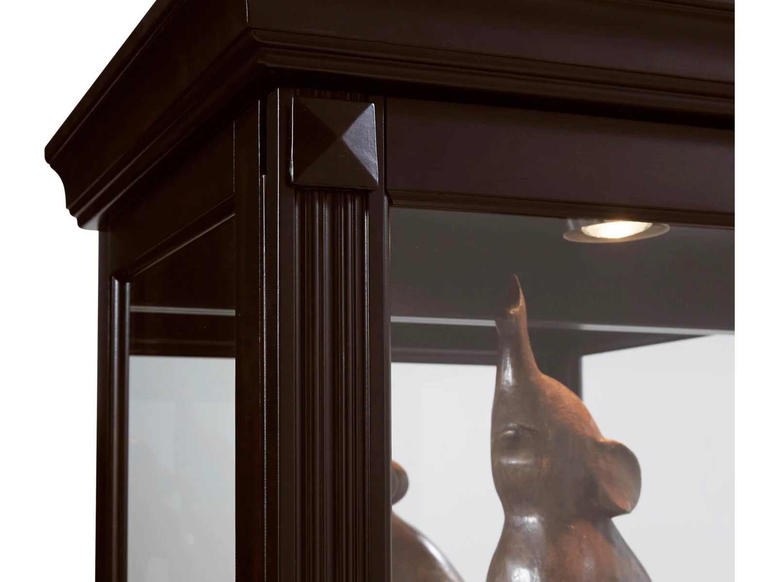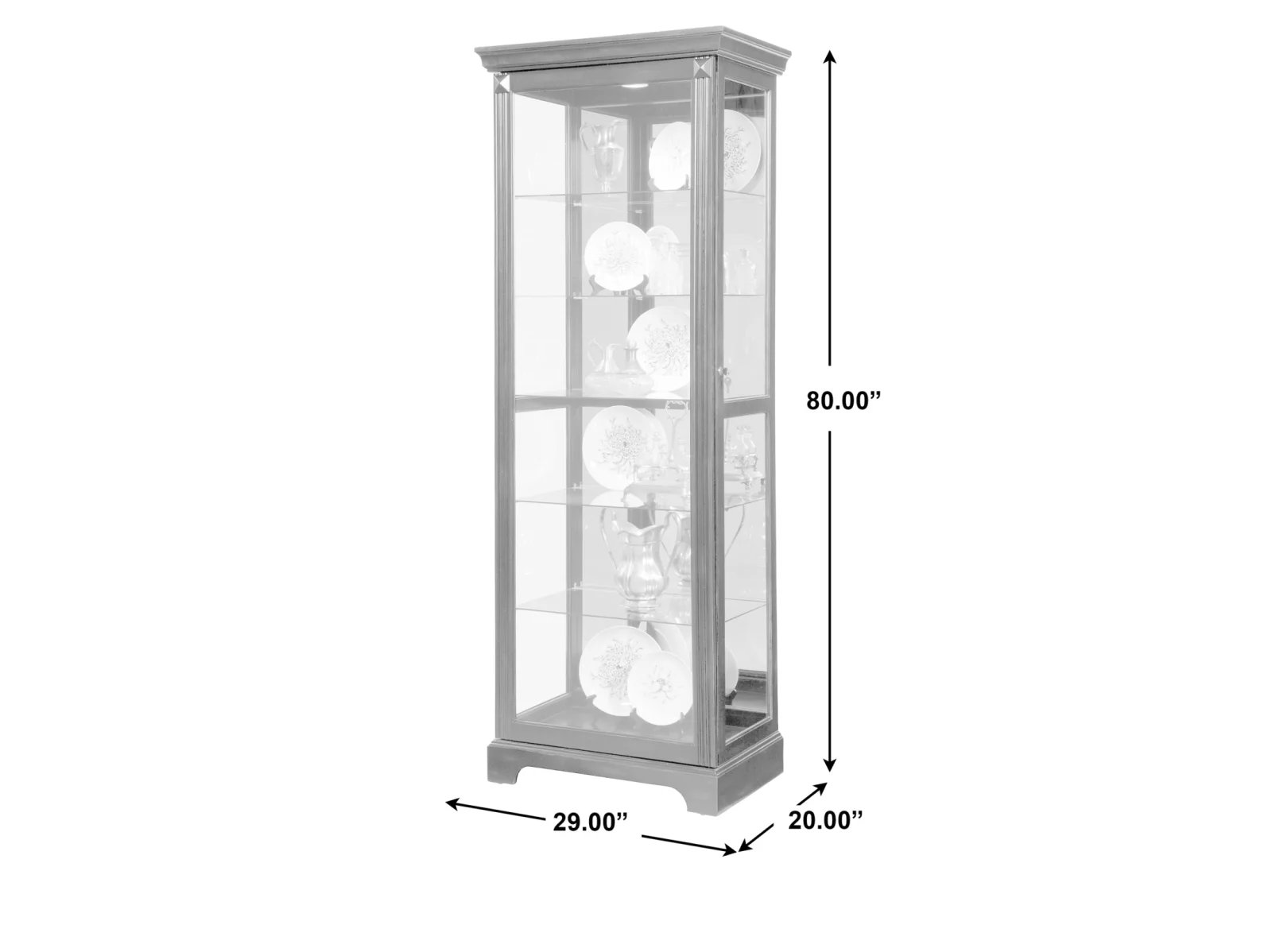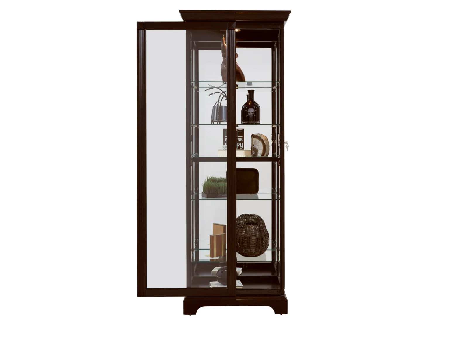 This display curio offers both high-end style and a roomy interior for your treasured collections. The dark cherry brown finish uses wood rub-through and simple design elements to reflect a transitional style that works well with any decor. The front of the case is constructed with a two-way sliding door with a lock for security, while a mirrored interior back allows you to view contents from any angle Five adjustable glass shelves offer customized storage and display, and a single halogen can-style light clicks on with a roll-switch for nighttime viewing. The case is decorated with reeded pilasters and diamond-shaped carvings at the top for added elegance.