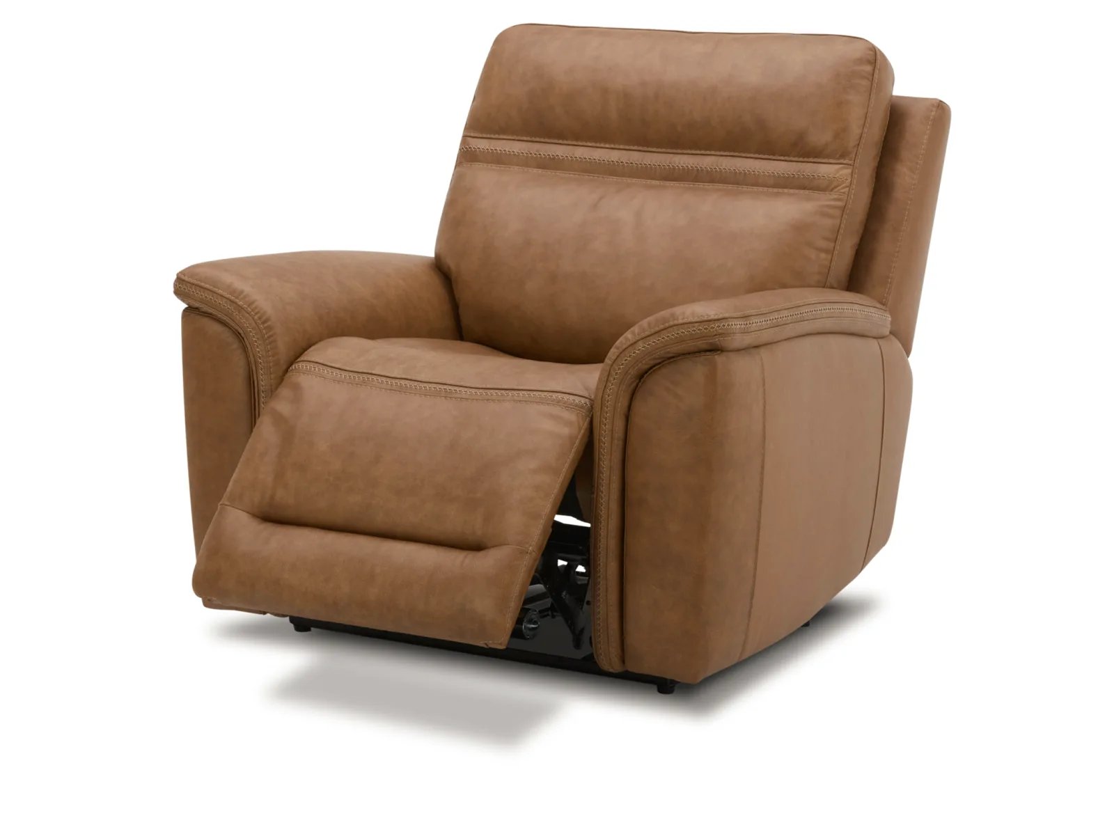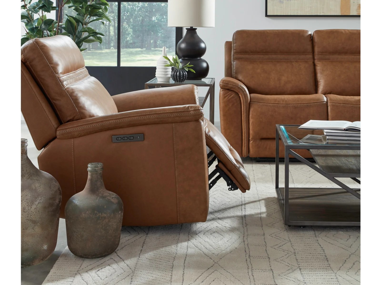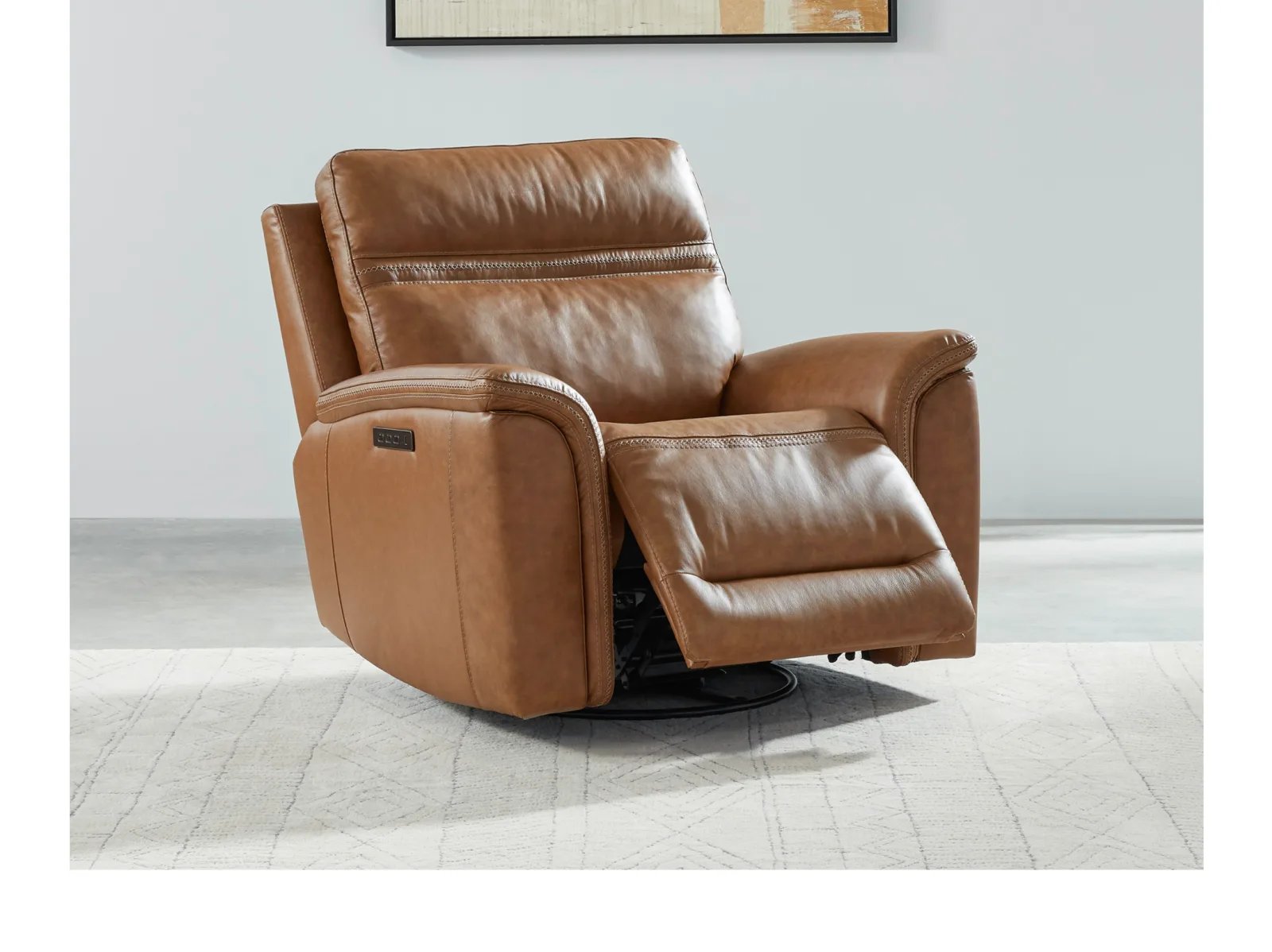 The Quarry Leather Power Swivel Recliner is infused with emotion! Crafted with Solid Hardwood, Plywood and Laminated Veneer Lumber, this sofa features Semi-Aniline Top Grain Leather with Match in your choice of slate or copper. PVC Vinyl is matched to the leather and used on the outside backs and sides, meaning everywhere your body touches is real genuine leather! The Quarry recliner offers triple power recline with a power articulating headrest and power lumbar support for optimal comfort. An added layer of memory foam is added to the bucket seats, meaning this recliner is not only a dream to lounge in, but is built to last. The full pad-over chaise ensures head-to-toe support. The neutral leather tones are the perfect lifestyle leather with their ultra-matte finish and soft two-tone savage. Matching single and cross stitching is sure to catch the eye. The high panel back with a decorative trim along with the nested padded arms add for a shapely clean appearance. With today’s technology in mind, a USB-A and USB-C port is located on the side of the recliner. The swivel glide recliner base allows you to stay engaged in conversations around the room, without having to strain your neck or leave your seat. A built-in stop mechanism is used to protect the wiring during swivel. Relax in livable luxury with the Quarry Leather Power Swivel Recliner.