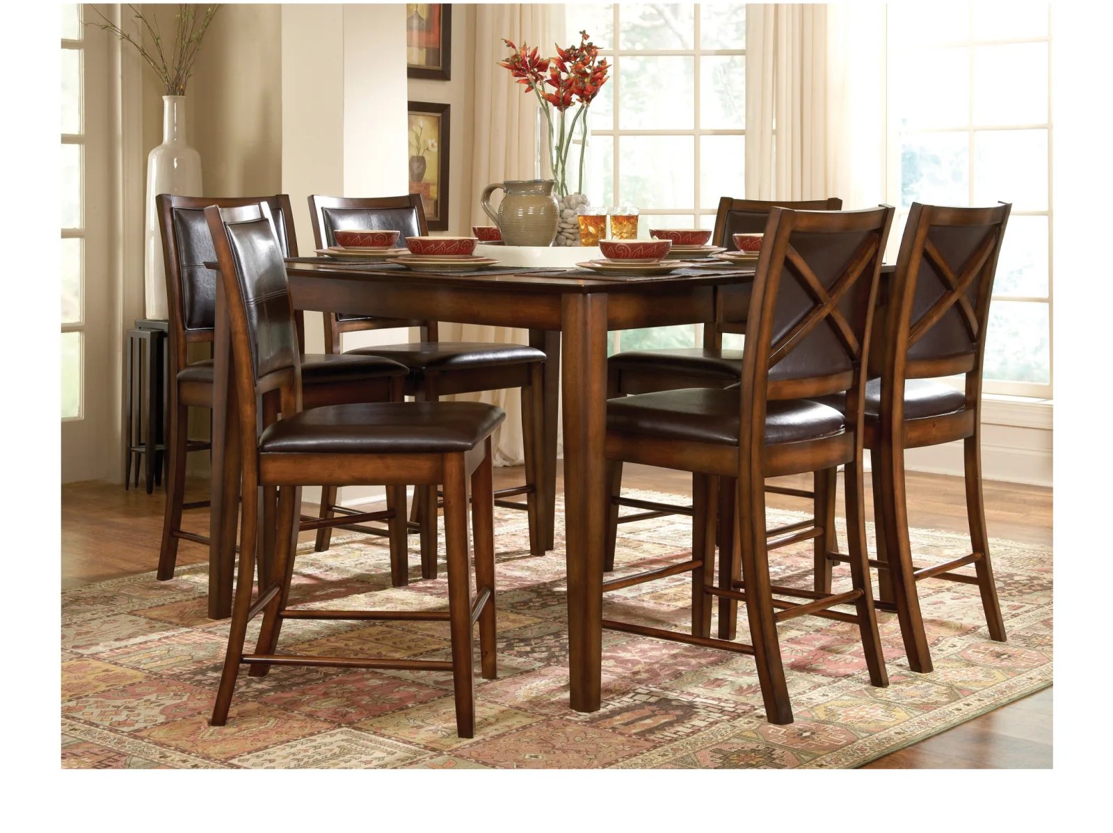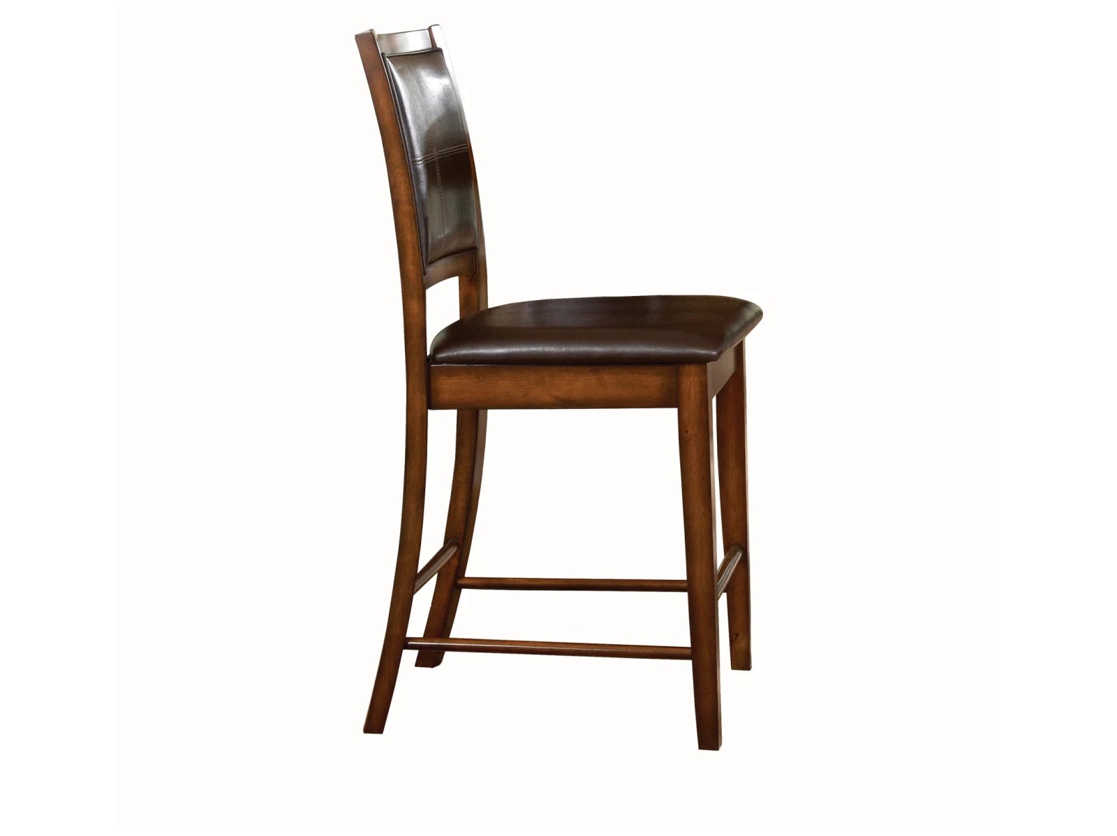 From traditional to modern, the Quebec Collection fits beautifully into any home décor. The counter height chair design features faux leather in brown finish that is easy to clean and is luxurious to the touch, that when paired with the amber finish exemplifies the transitional style.