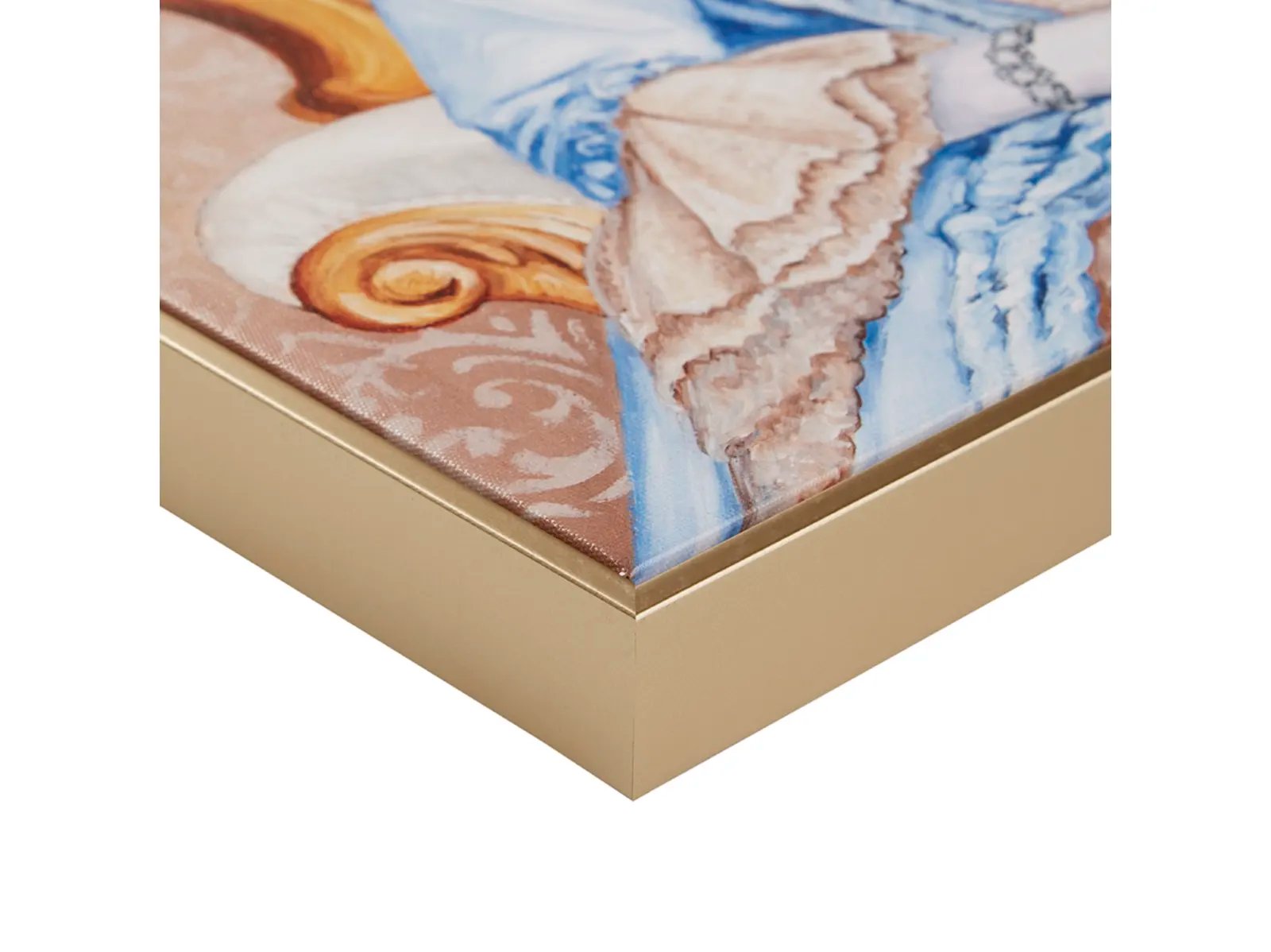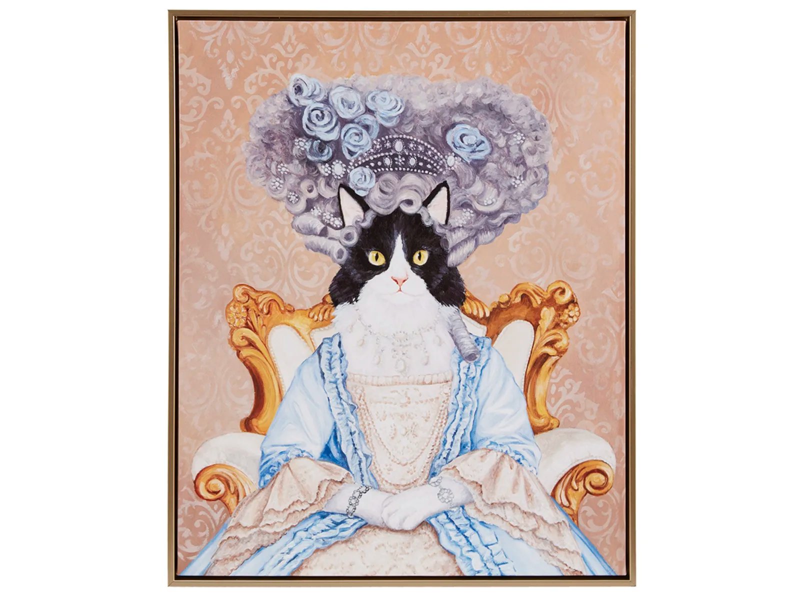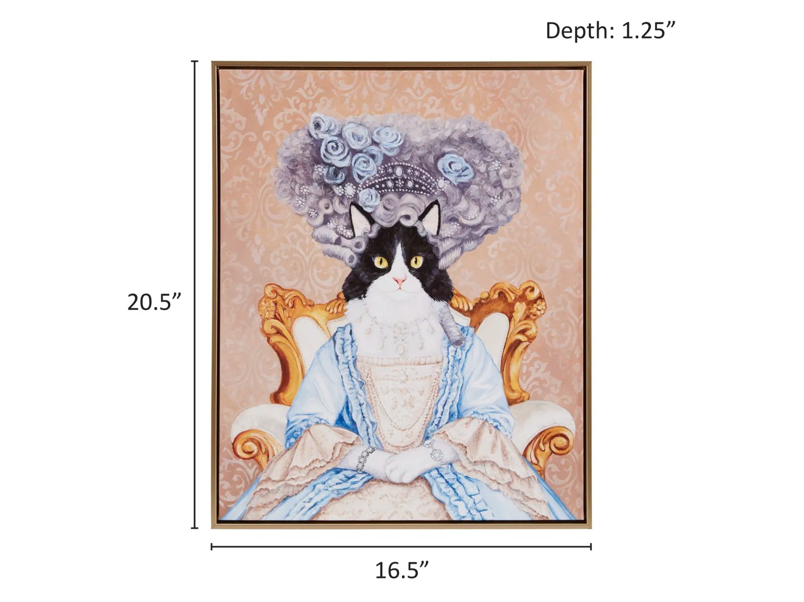 Add a touch of regal charm and whimsy to your home with the Queen Bridger Kitty Pet Portrait Framed Canvas Wall Art. This captivating 16.5″W x 20.5″H piece by artist Carol Lew reimagines a classic Renaissance portrait with a delightful feline twist. Our royal kitty strikes a stately pose, adorned in a period-inspired gown and elaborate wig, showcasing a perfect blend of historical elegance and playful charm. The artwork is printed on high-quality canvas and enhanced with micro-texture embossing, adding depth and sophistication. The golden frame further elevates the piece, creating a truly aristocratic feel. Ready to hang with two D-ring hangers, this charming wall art is perfect for adding a unique touch to your living room, bedroom, or study. Simply spot clean as needed to maintain its vibrant beauty. Bring home this purr-fectly charming piece and let your walls tell a story of feline royalty.