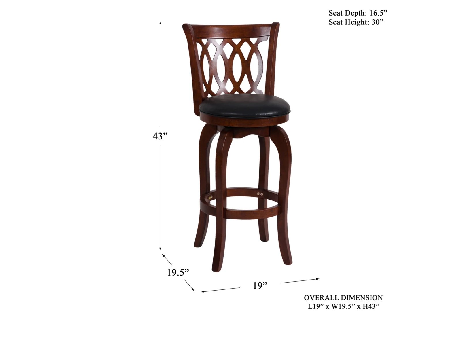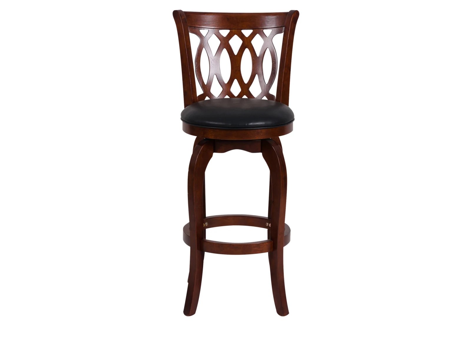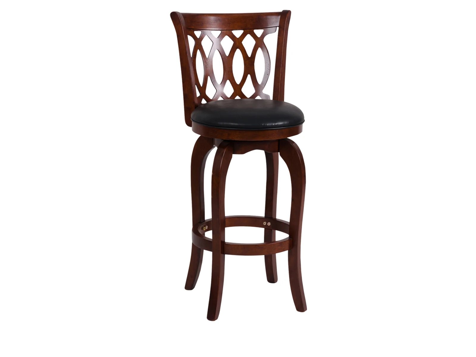 Enjoy easy conversation with anyone in the room from this Quincy cherry swivel stool. Foam fill cushioning provides a soft, comfortable seat while the base swivels smoothly, providing a complete 360-degree rotation for easy socializing. Perch your feet on the ring footrest that circles the base for relaxation and swivel control.The solid wood construction of this swivel stool offers strong support and long-lasting durability. Impart an old world pub feel to your entertainment room with the black faux leather upholstery on this comfortable high-back stool.