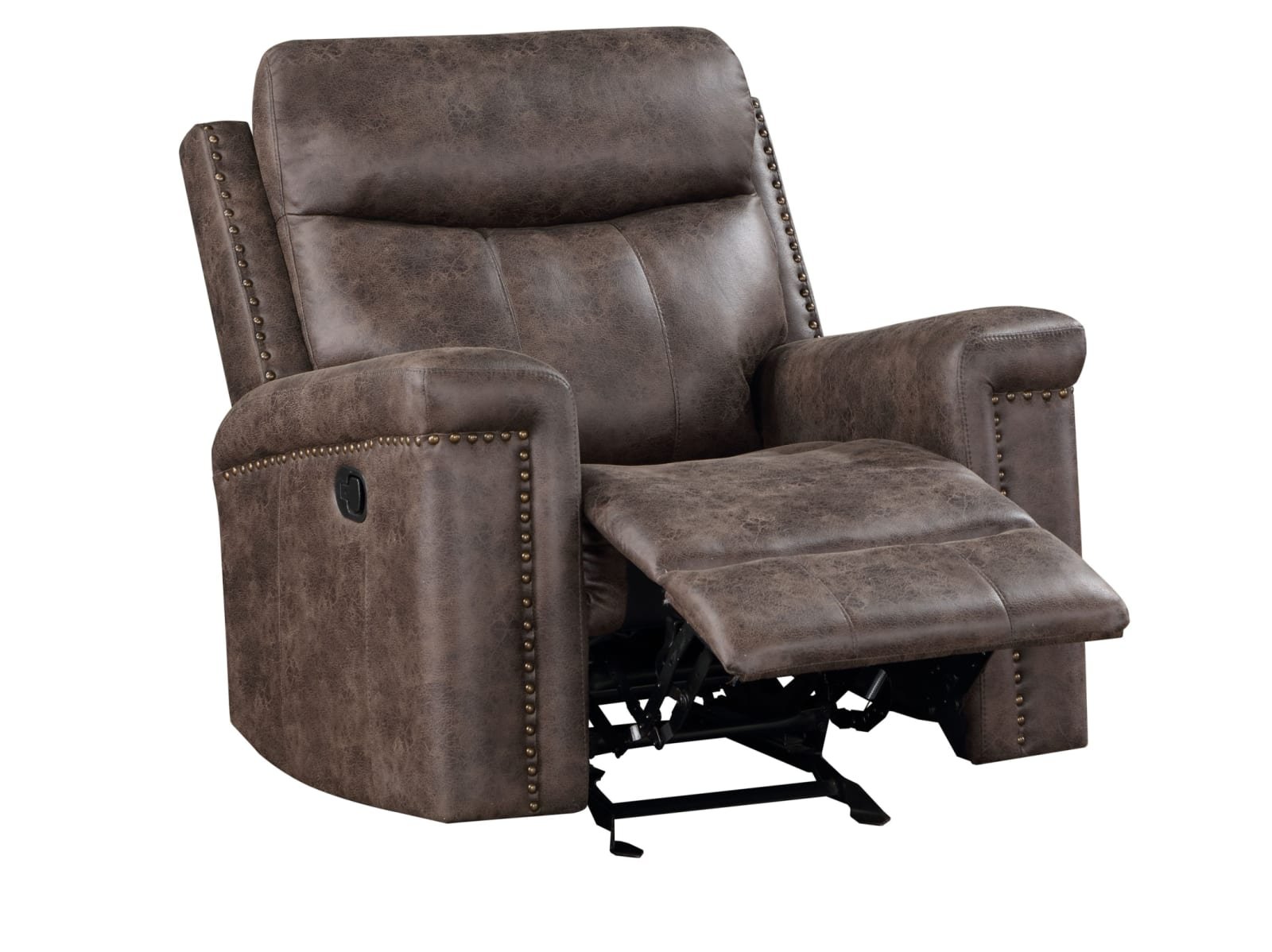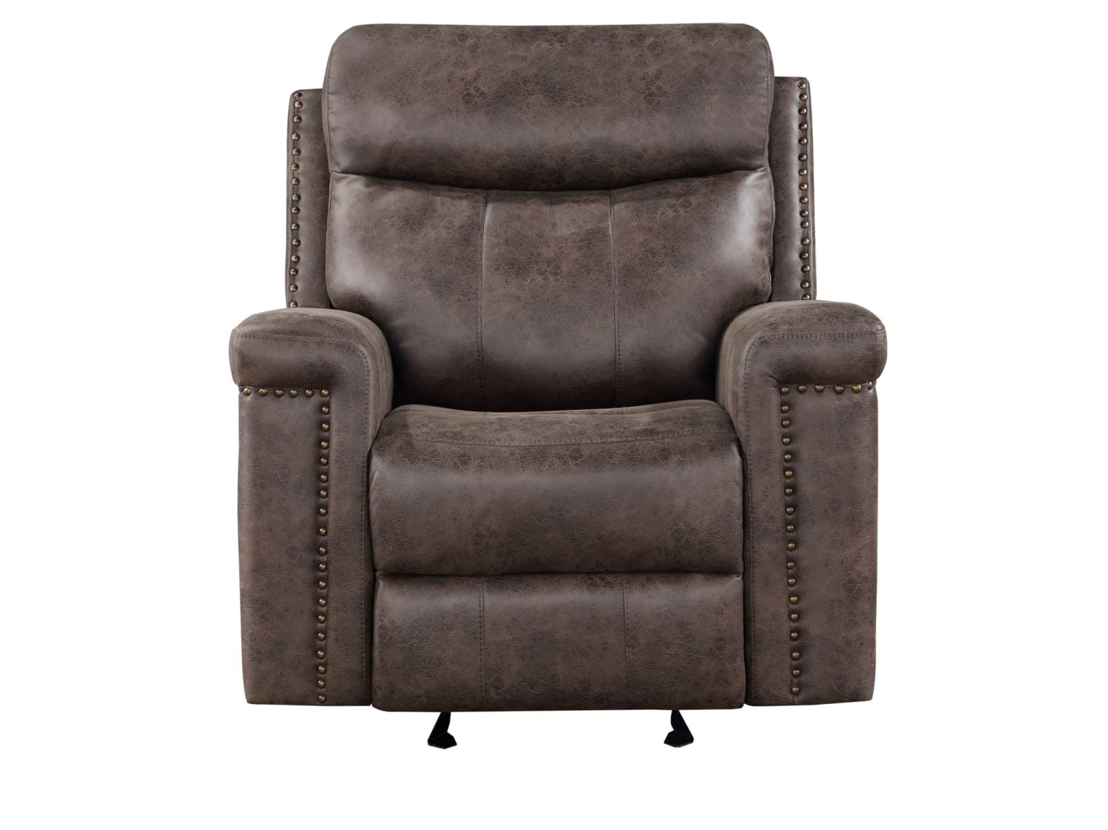 The Quintz Recliner is available in classic and power reclining options. Nailhead trim below the armrests and a mocha brown faux leather upholstery.