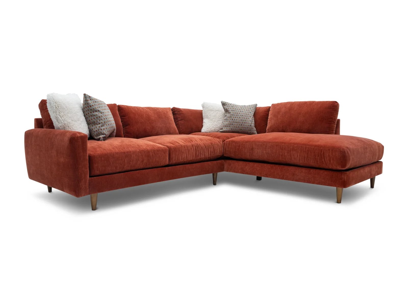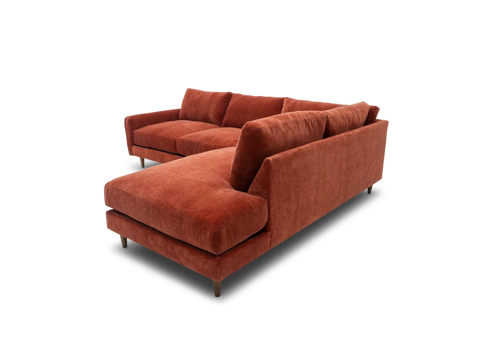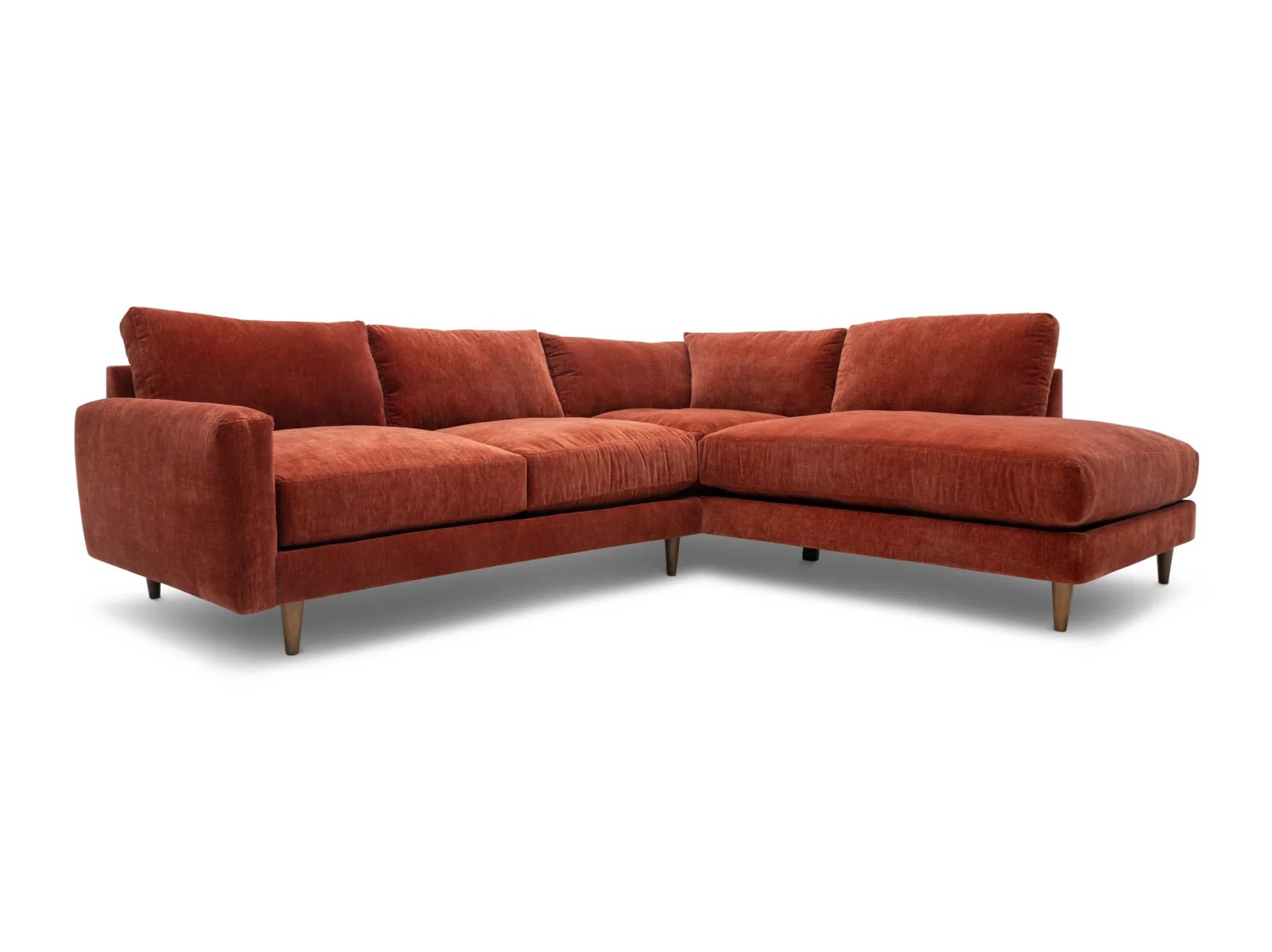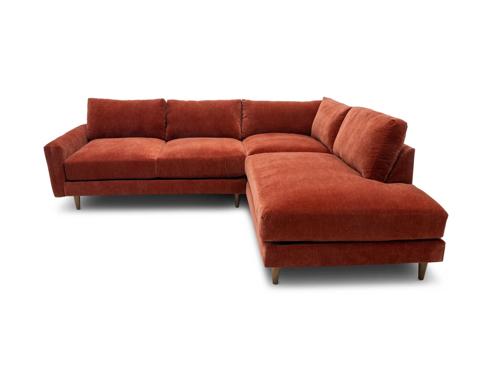& Free ShippingThe Raine 2 Pc. Sectional is a low-profile, contemporary sectional consisting of a deep-seated sofa and an armless chaise, constructed with a hardwood frame for guaranteed durability. This stylish seat is upholstered in a soft performance fabric in a vibrant Paprika red shade, plus it rests atop tapered wooden feet for a chic finish. The Raine also boasts polished comfort with crisp knife-edge back cushions, ultra-plush seat cushions, and cozy feather-blend throw pillows for effortless lounging or entertaining. Freshen up your living space with the Raine 2 Pc. Sectional today!