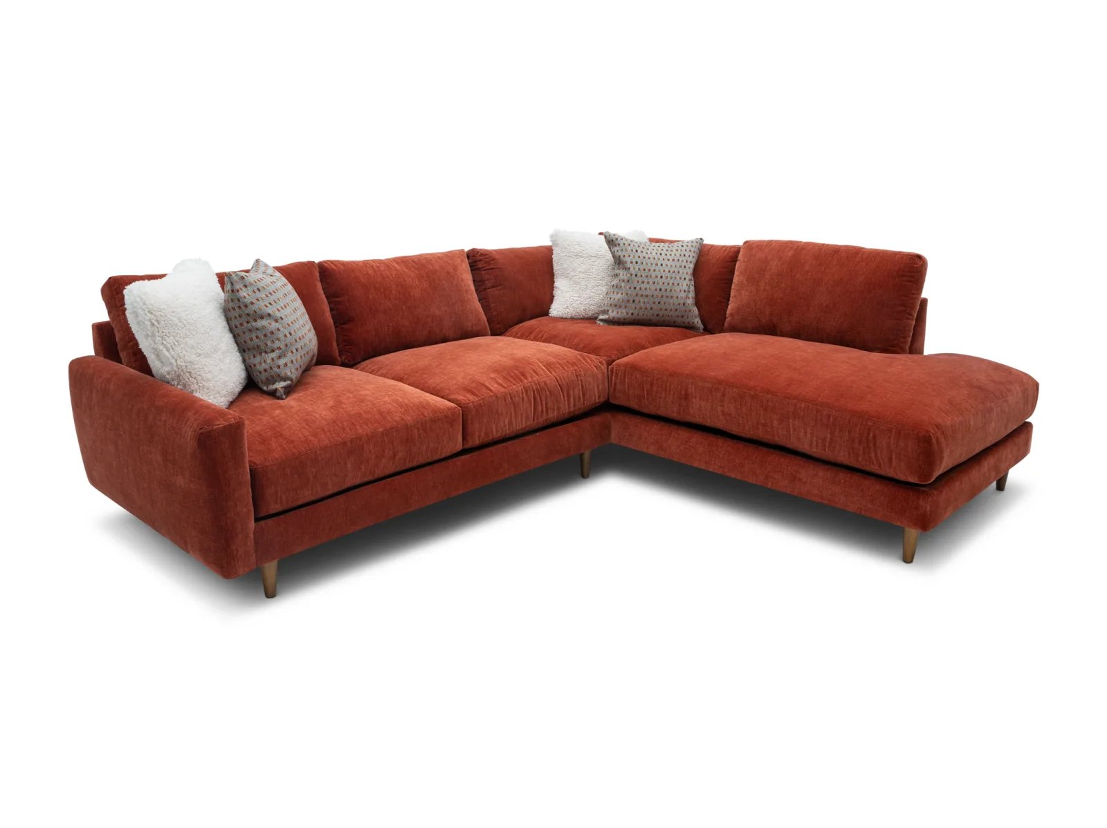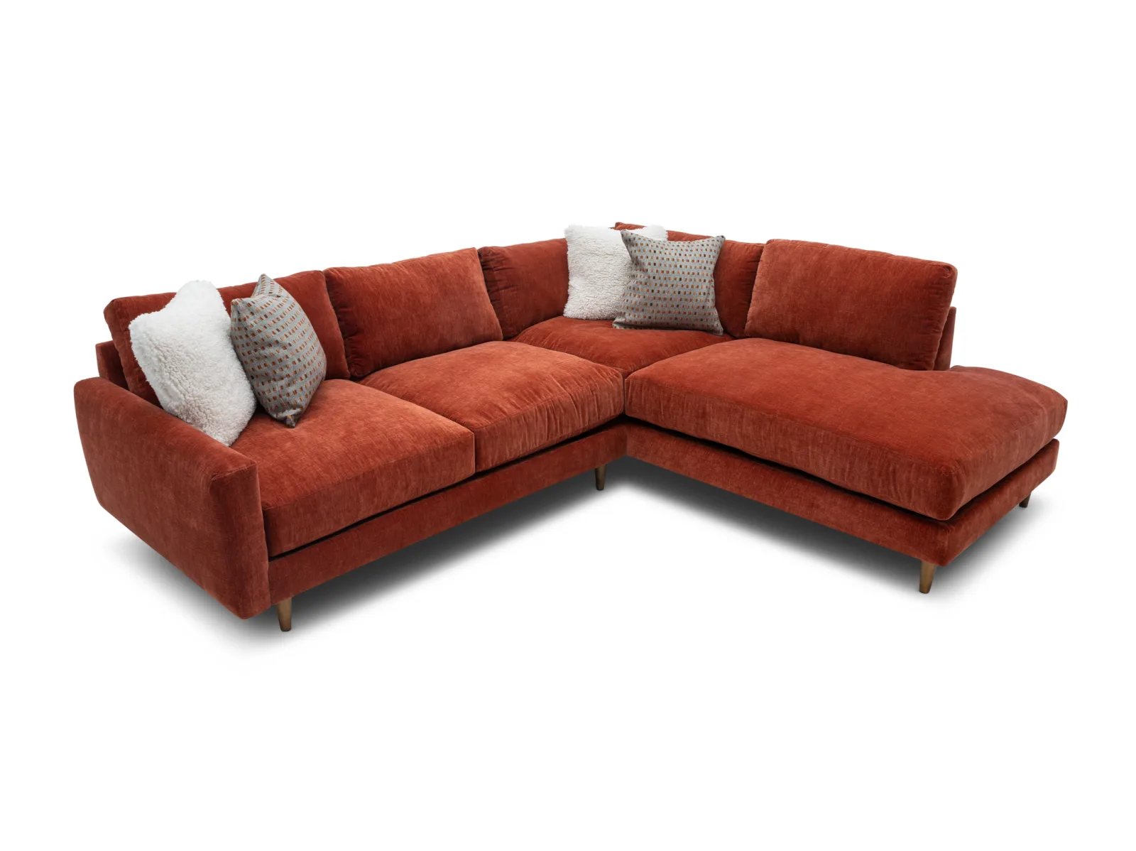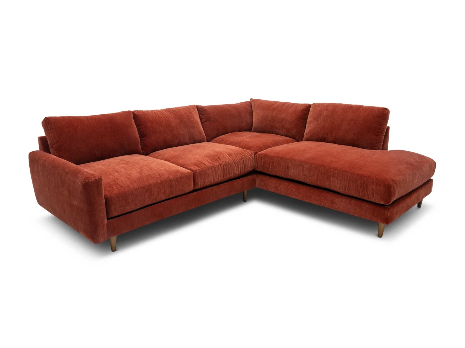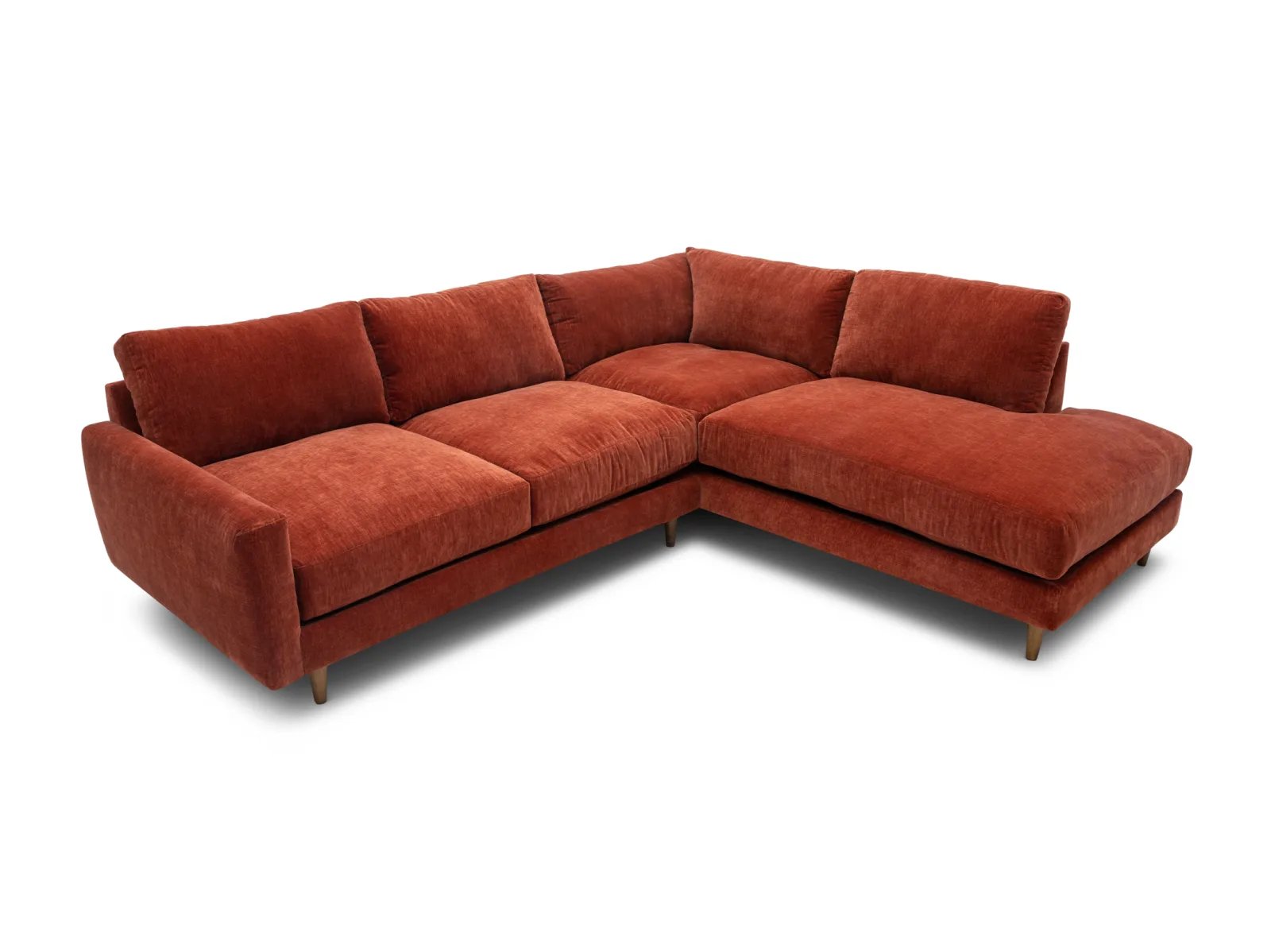 & Free ShippingThe Raine 2 Pc. Sectional is a low-profile, contemporary sectional consisting of a deep-seated sofa and an armless chaise, constructed with a hardwood frame for guaranteed durability. This stylish seat is upholstered in a soft performance fabric in a vibrant Paprika red shade, plus it rests atop tapered wooden feet for a chic finish. The Raine also boasts polished comfort with crisp knife-edge back cushions, ultra-plush seat cushions, and cozy feather-blend throw pillows for effortless lounging or entertaining. Freshen up your living space with the Raine 2 Pc. Sectional today!