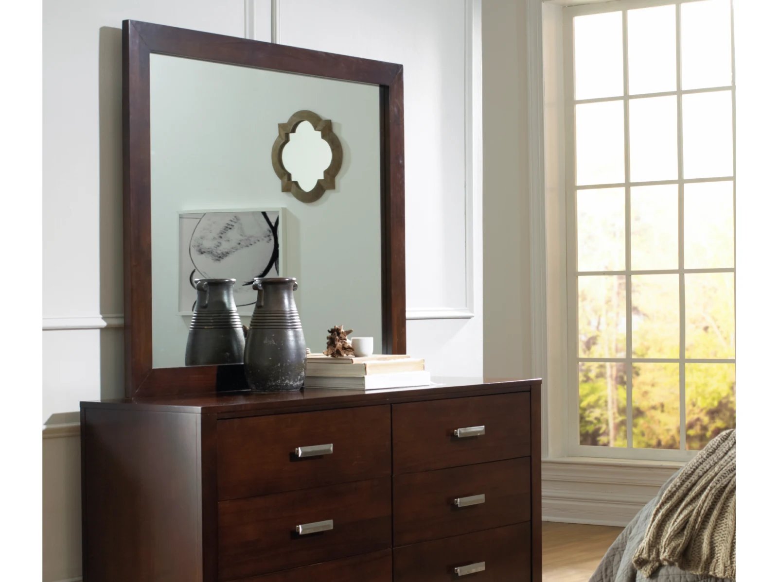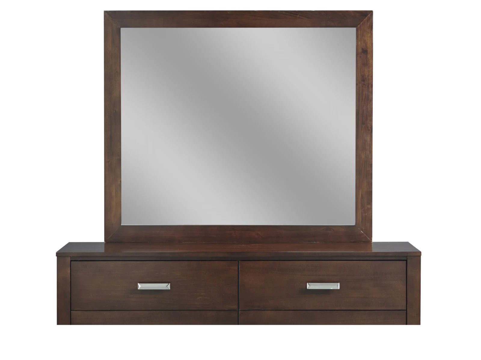 & Free ShippingThe Ravina collection offers a modern take on Modus’ classic Ravina bed frame with large block posts, smooth side panels, an oversize mirror, and our signature laser-cut headboard pattern. With the new look comes a new hand-applied chocolate brown finish that showcases the collection’s distinctive Basswood veneer grain pattern. Finish tones range from a deep chocolate to a rich golden brown with burgundy lumber highlights. Casegoods are trimmed with oversize satin nickel pulls in an elongated pyramid shape designed to reflect light from any angle. The collection is engineered for everyday use with heavy duty full extension drawer glides, sanded and stained solid wood drawer boxes, and felt-lined dresser and chest top drawers. The clutter-busting storage bed features 4 under-bed drawers mounted away from the headboard, allowing them to move freely next to the matching Ravina nightstand.