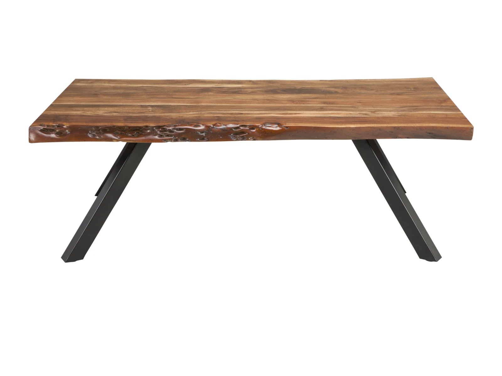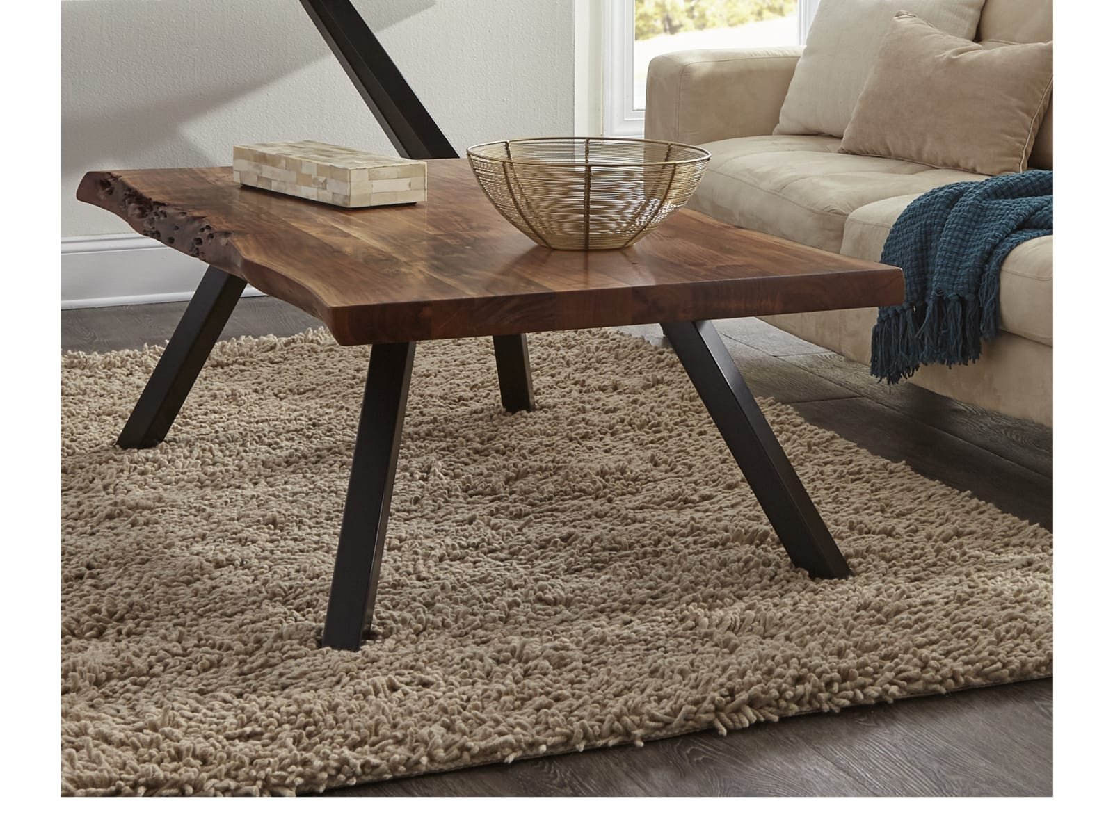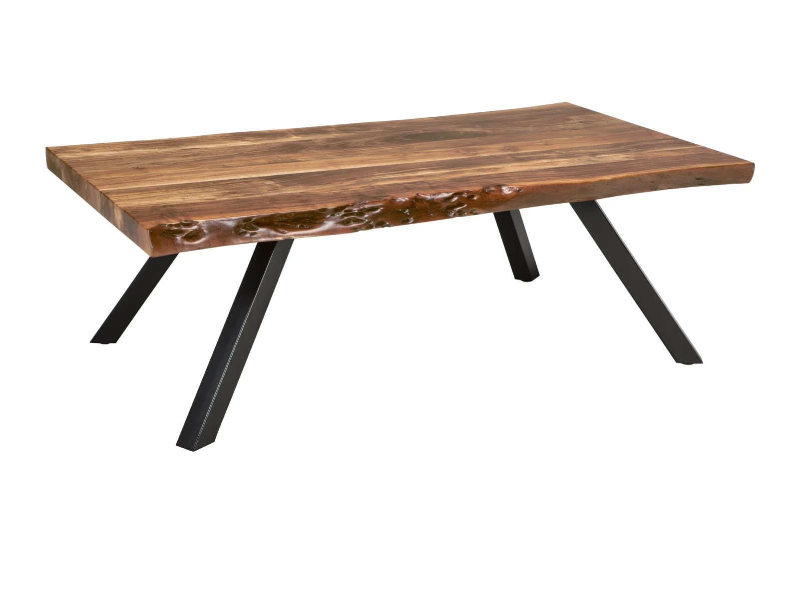 & Free ShippingMade from 2-inch thick planks of solid Acacia wood and powder-coated iron, the Real Lodge collection table top is finished and sealed with a clear semi-gloss NC lacquer to preserve its genuine tree edges and unique wood grain. The nature of the wood and live edges ensures each table is one-of-a-kind, with random edge profiles, knots, cracks and varied grain patterns shining through sundry hues of amber and golden brown.