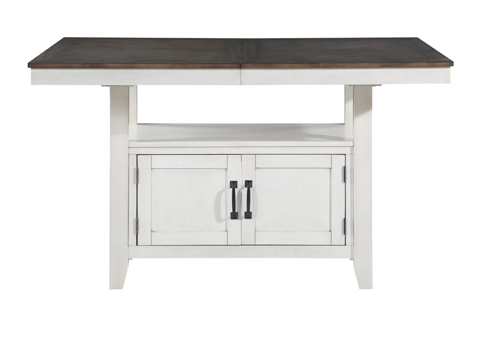 The Richardson counter height dining has very transitional style that looks great with any décor. The table has a large, removable leaf with shelf and storage on base. Ladder back chairs and bench have a durable, cleanable fabric. The matching functional server has pewter finish hardware, glass fronted storage, removable wine rack and draw storage.