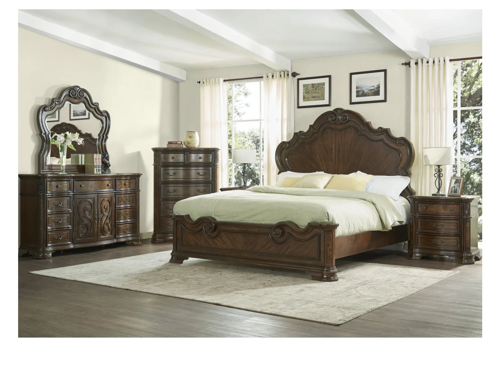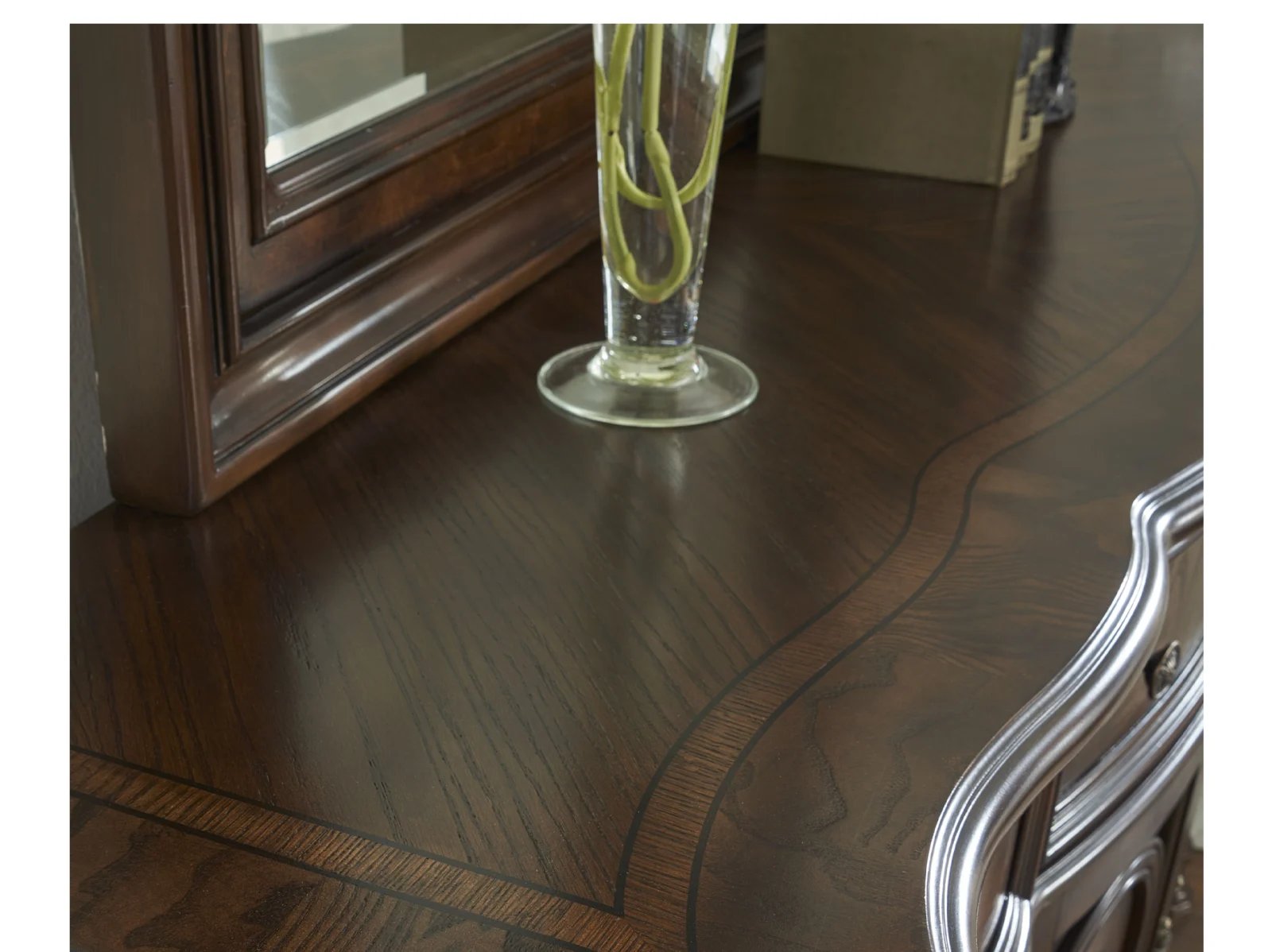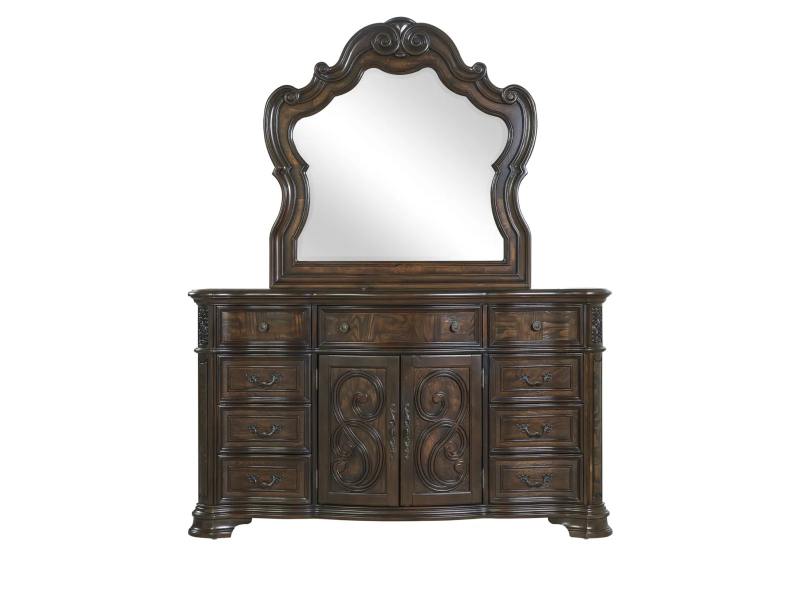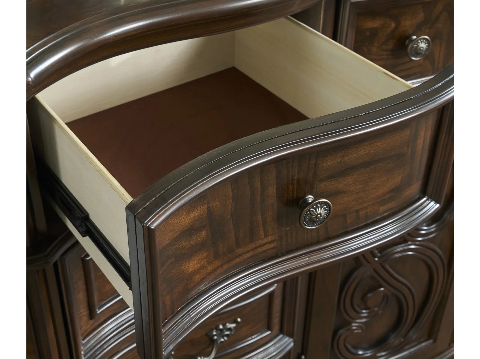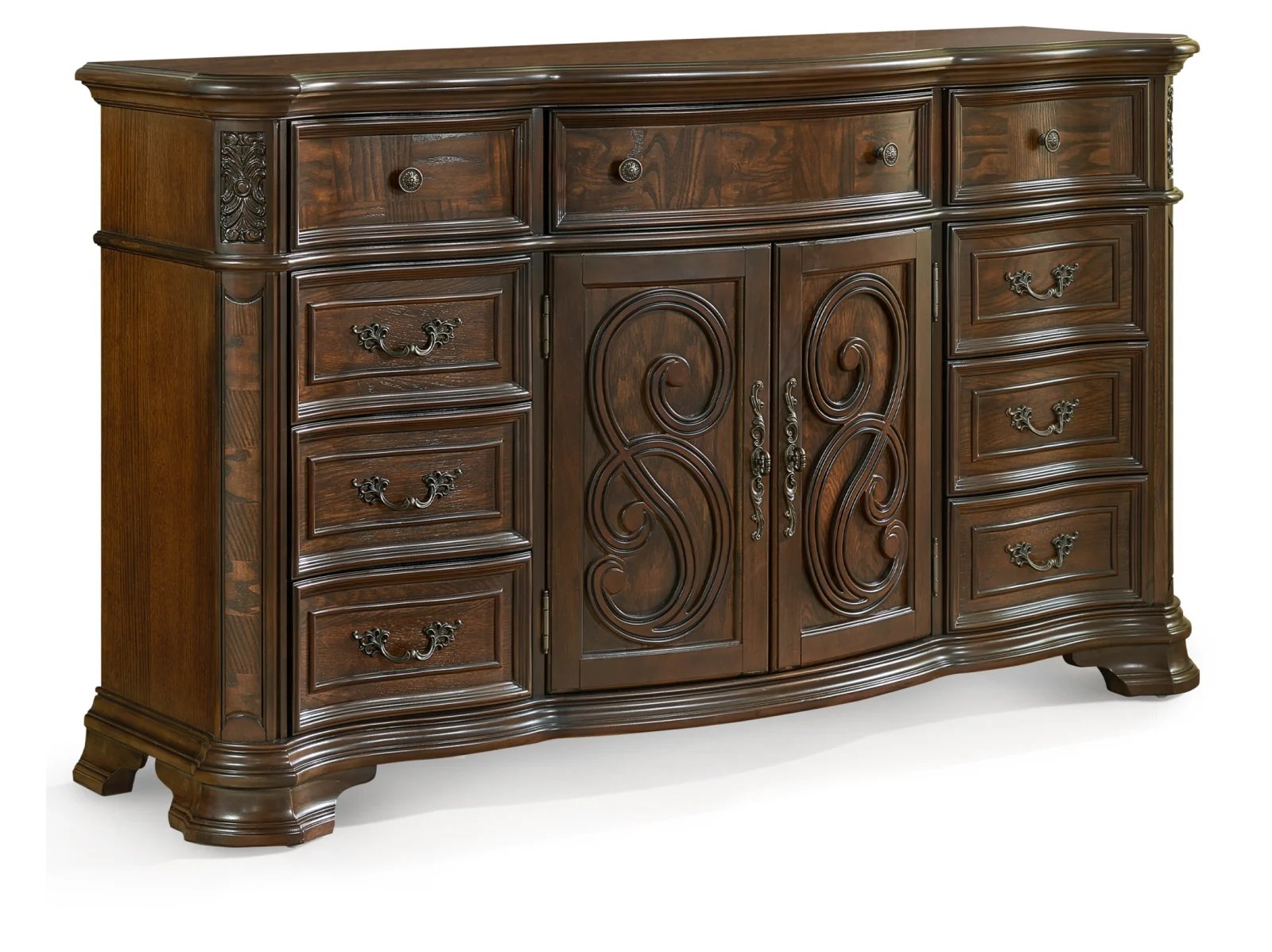 Add sophistication and ample storage to your bedroom with the Rodanthe Dresser. The Rodanthe is crafted from hardwood with veneers highlighted by olive ash burl accents and a deep brown cherry finish, making for a high-quality bedroom storage with resplendent wood grain. This nine-drawer masterpiece features a central cabinet space, intricate moldings, and a gracefully curved silhouette that echoes traditional and rococo styles.  The Rodanthe Dresser’s generous storage capacity ensures all your essentials are organized while elevating your bedroom’s aesthetic.