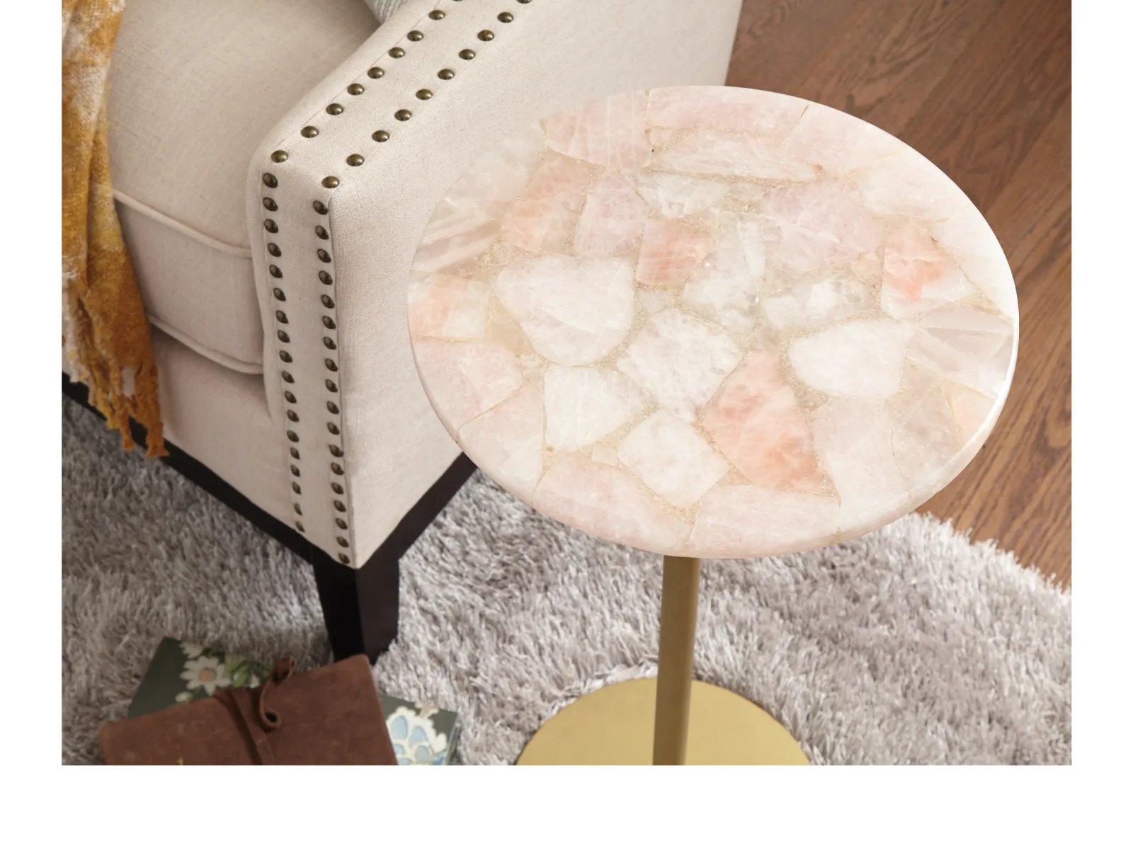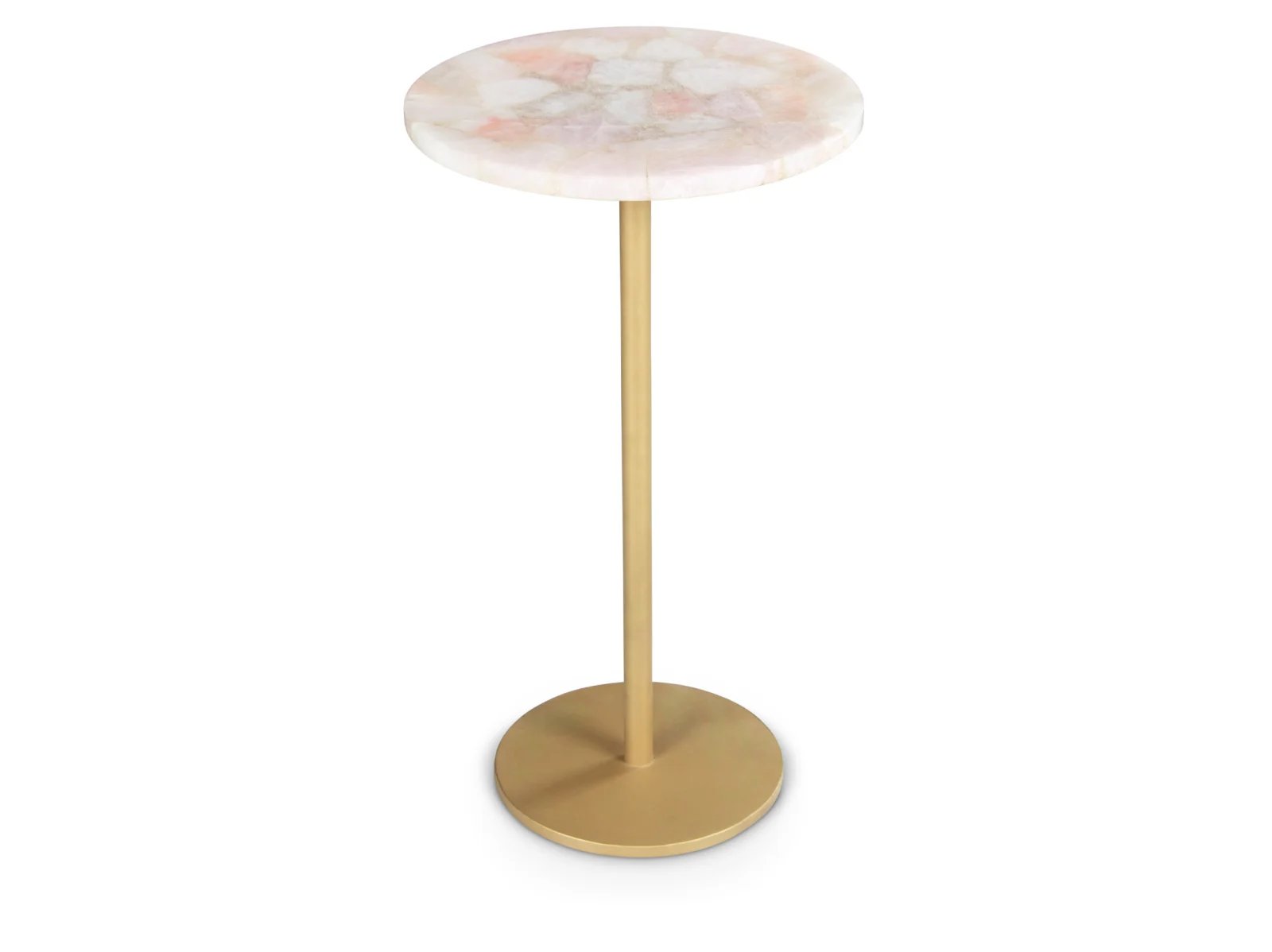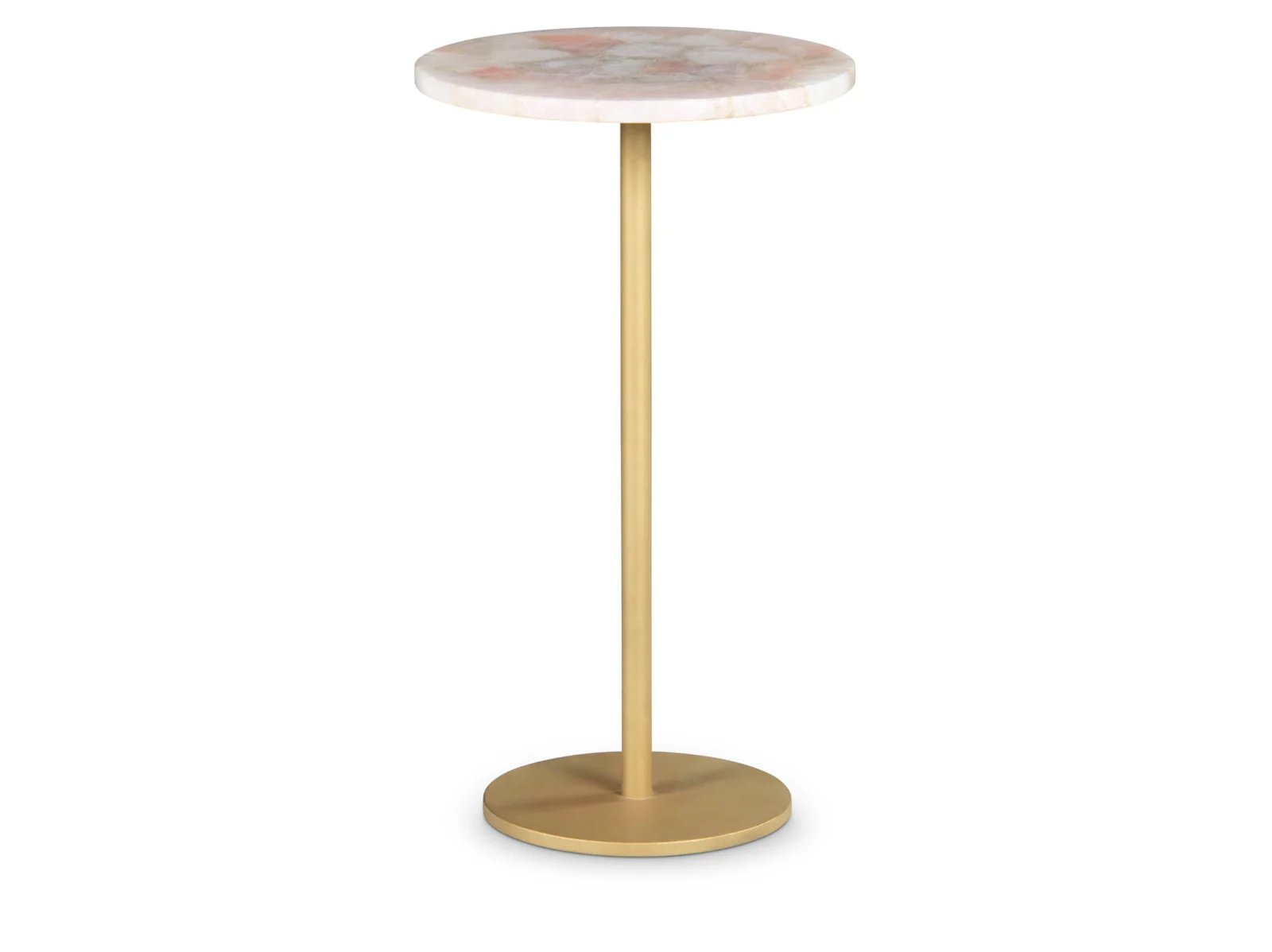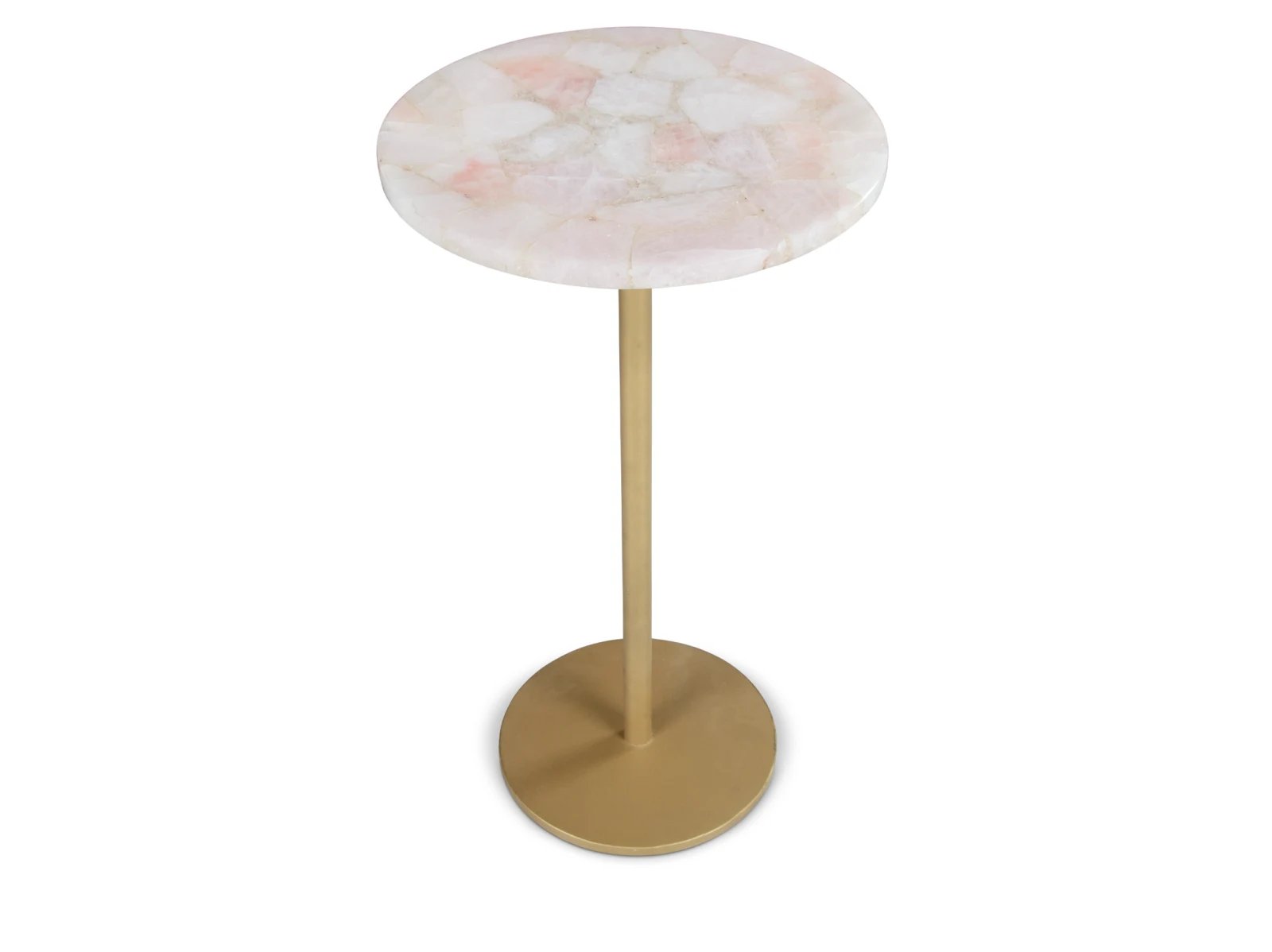 & Free ShippingThe calming and reassuring properties of Rose Quartz are the highlights of the Rosetta Chairside End Accent Table. Known as the stone of universal love, Rose Quartz is a beautiful and durable stone that acts as the surface of this charmingly romantic side table. The round shape and mixed media powder-coated gold iron base are sure to stand out in any setting and the piece serves as the perfect End Table to an upholstered set or as a Side Table for a favorite reading chair. The transitional style allows it to fit anywhere your heart takes it.