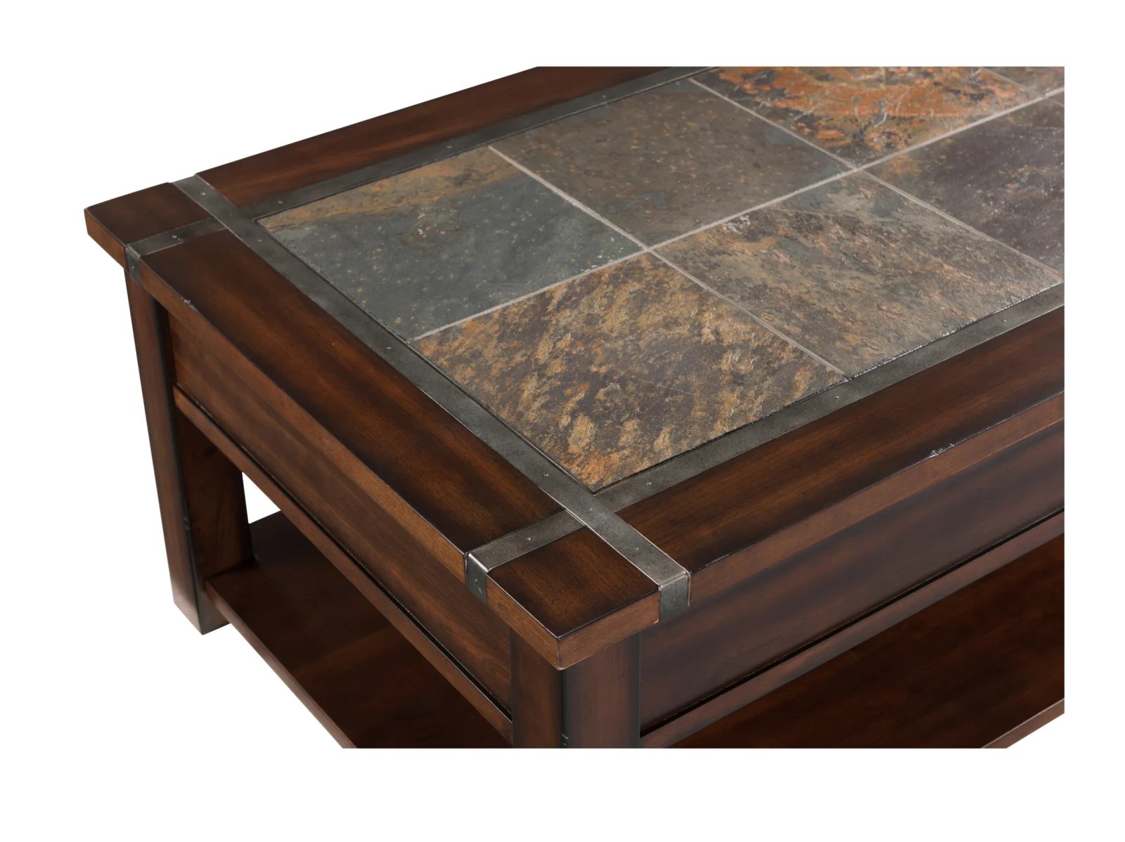 The vibrant slate inlay of the Rowland Occasional Table Collection framed in wood and accented with pewter strapping and hardware is the perfect accent to any transitional or rustic decor. The naturally occurring variation in the colors of the stone contrasts with the high-lighted effect of the stained cherry veneer and creates a dramatic effect. The sofa table features two drawers and the end table is available in two sizes, one with an additional draw for storage, but the real secret is the lift-top of the cocktail table adding function to natural beauty!