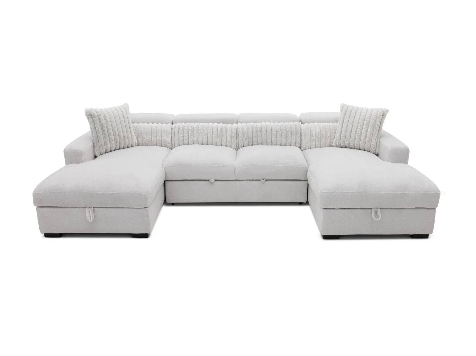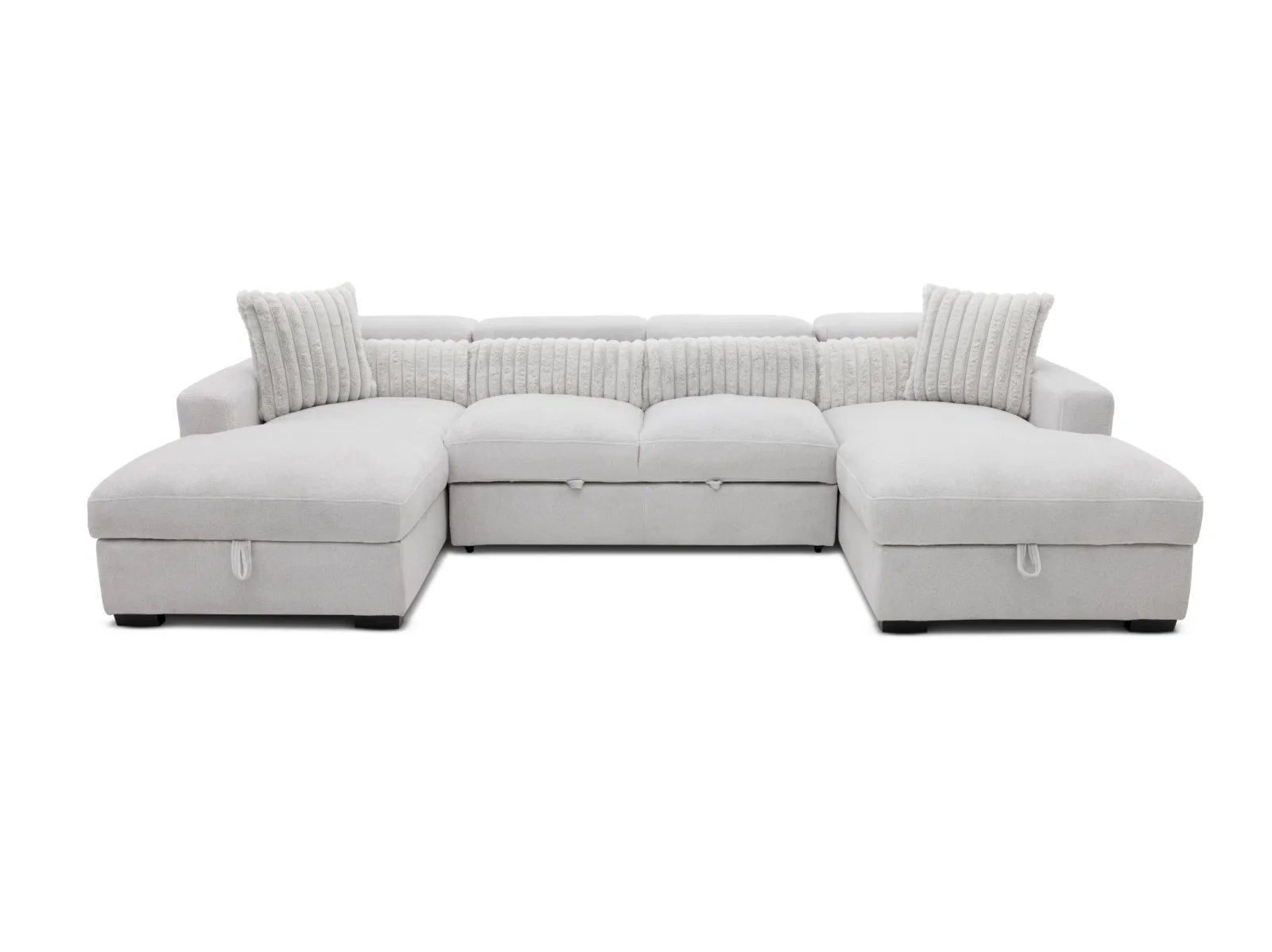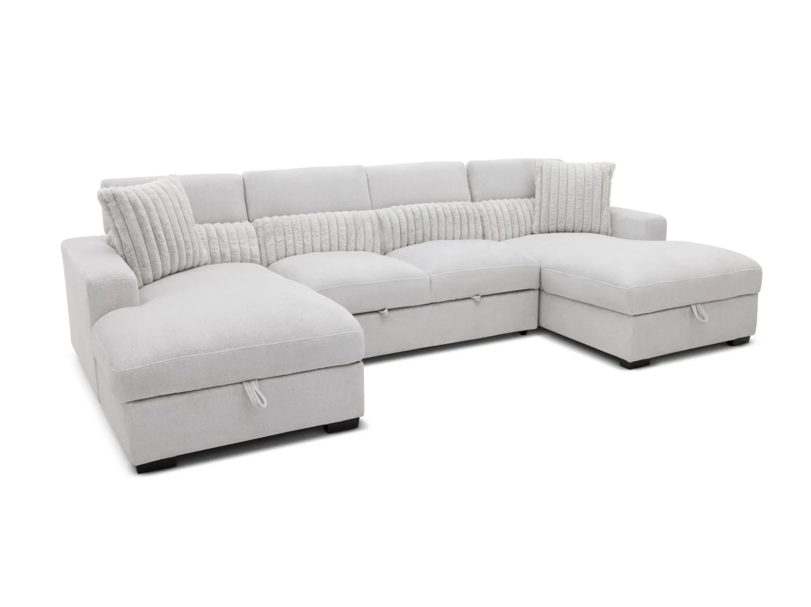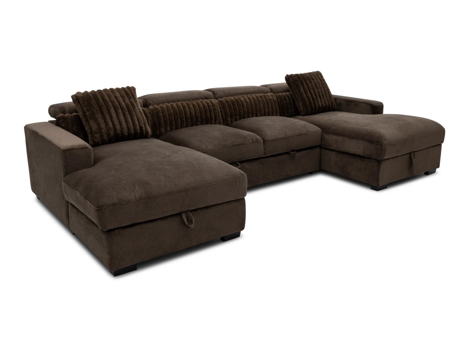 Modern functionality and laid-back contemporary touches come together to bring you the Roxy 3 Pc. Double Chaise Sectional. A durable engineered wood frame supports this sectional’s sleek, low profile – while also leaving room for two storage chaises and pullout sleeper bed. Refreshing touches like track arms and wood block feet give the Roxy a modern look, which balances out the unique, boho-inspired corduroy fabric on the lumbar support cushions. Upholstered in performance fabric, the Roxy comes available in your choice of brown or light grey colors. Accommodate for lounging, sleeping, and hosting guests with the Roxy 3 Pc. Double Chaise Sectional today!