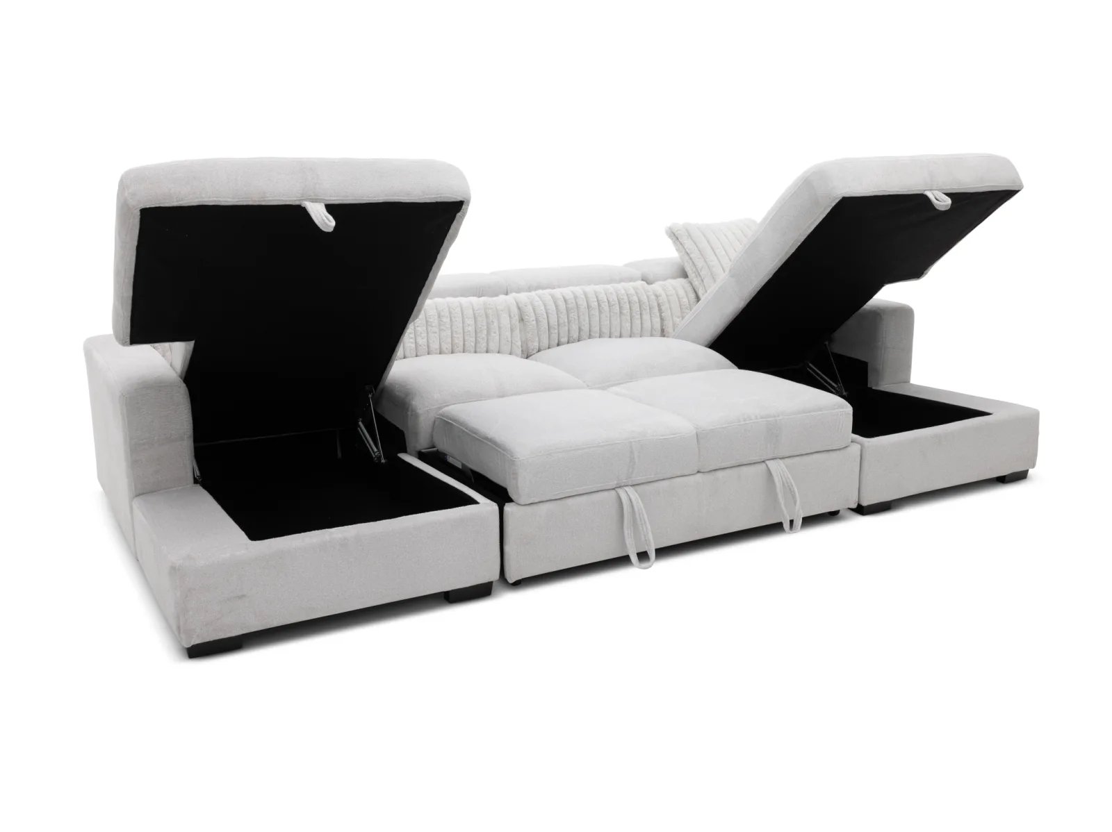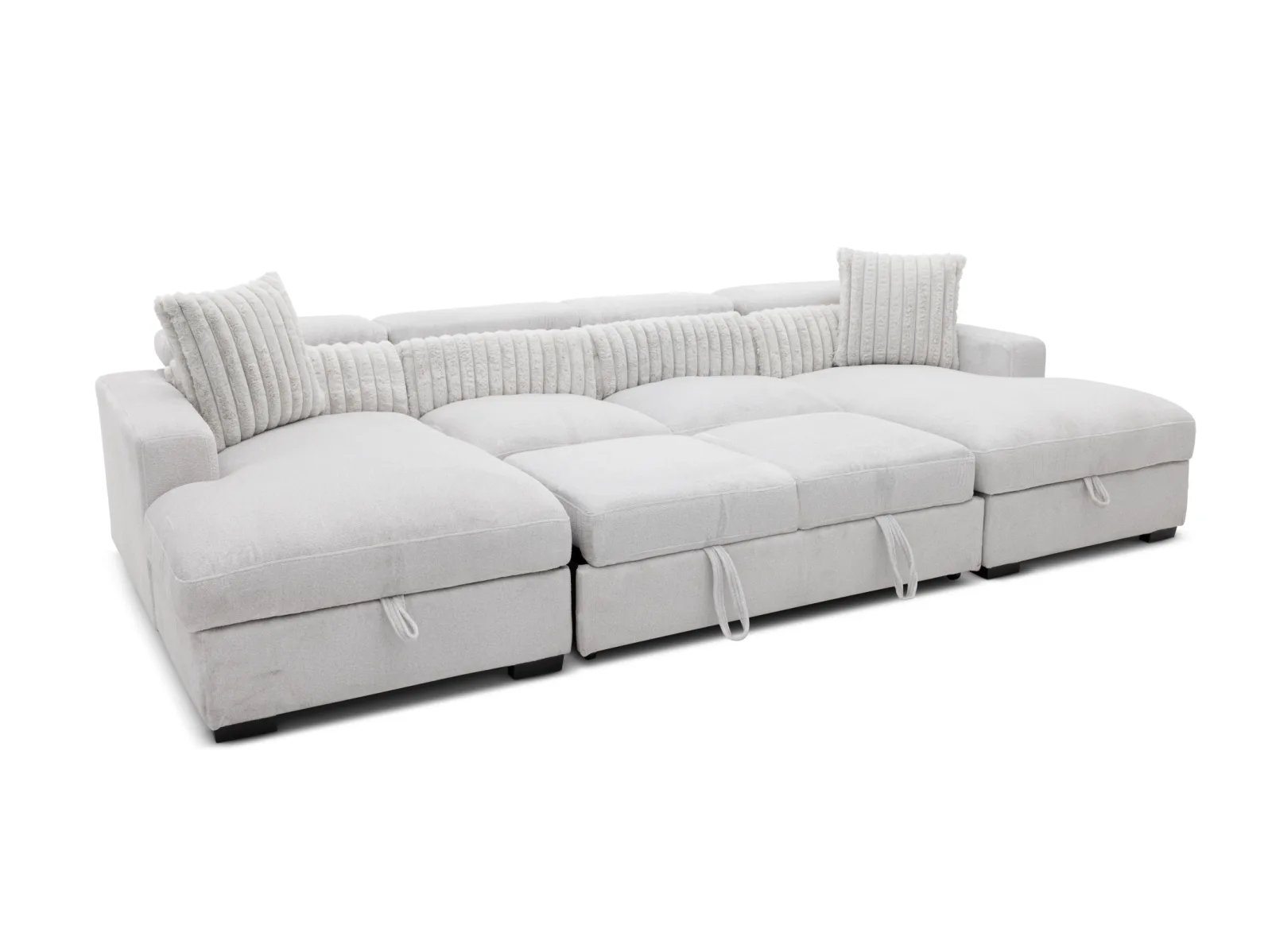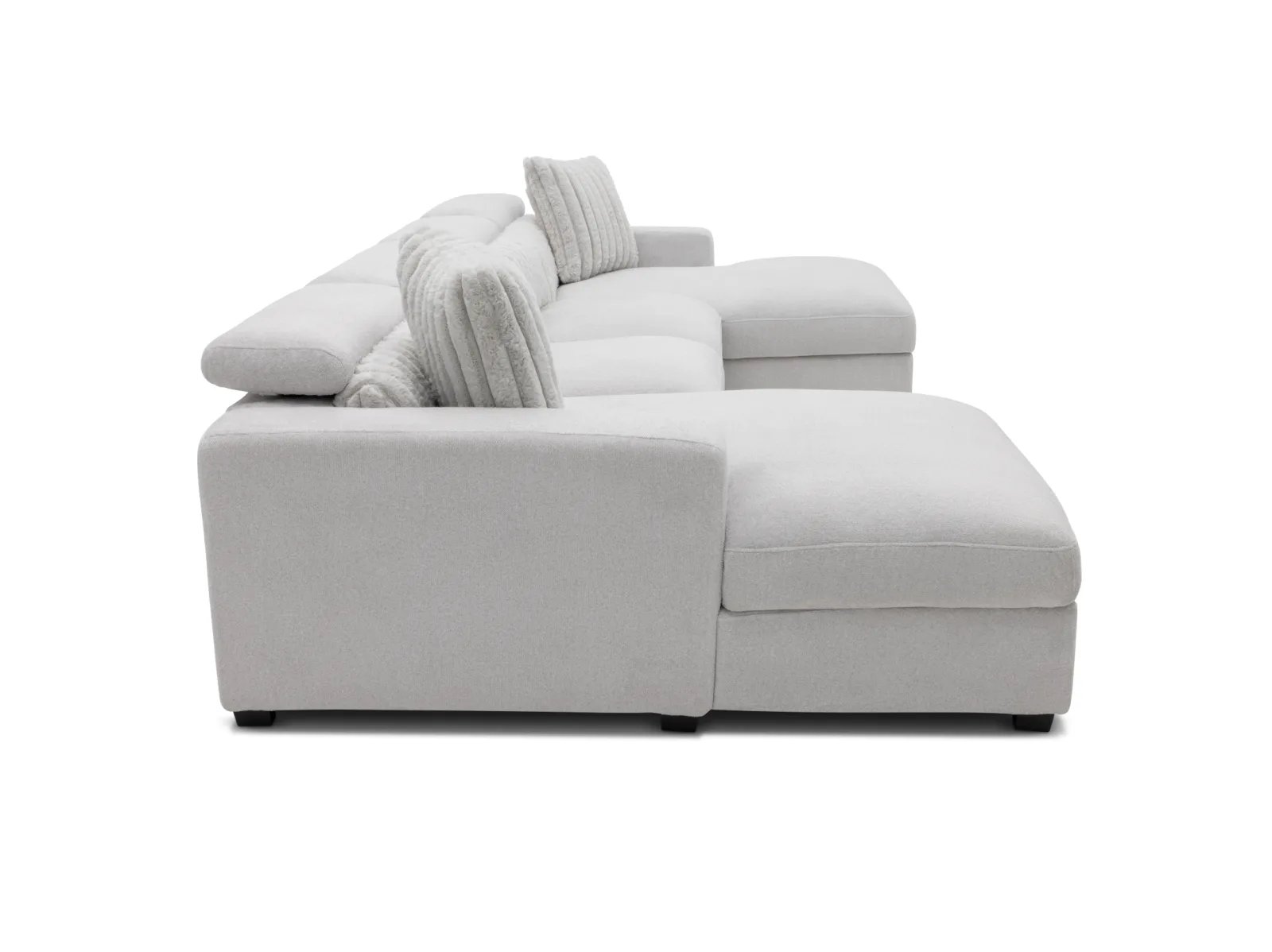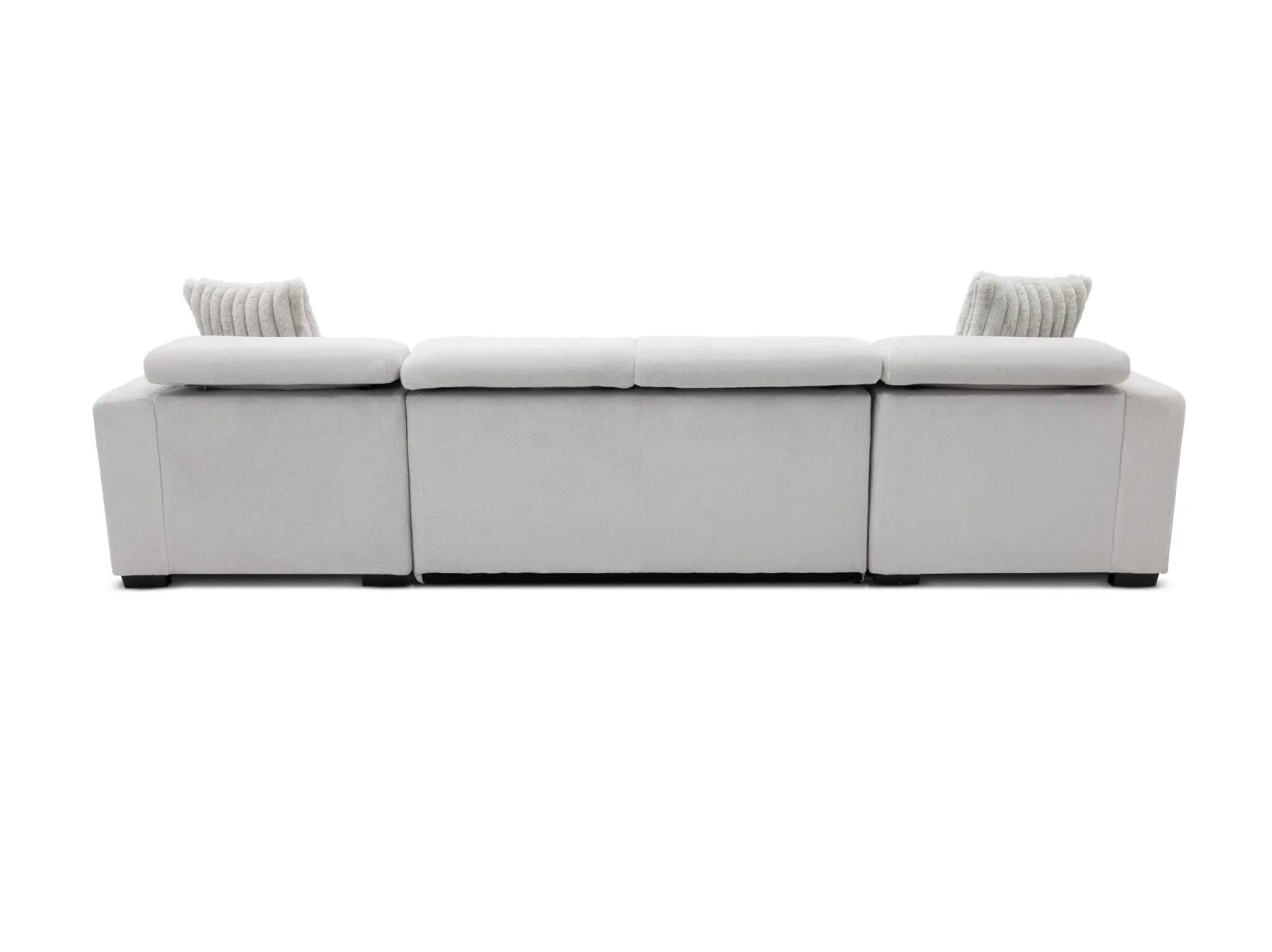 Modern functionality and laid-back contemporary touches come together to bring you the Roxy 3 Pc. Double Chaise Sectional. A durable engineered wood frame supports this sectional’s sleek, low profile – while also leaving room for two storage chaises and pullout sleeper bed. Refreshing touches like track arms and wood block feet give the Roxy a modern look, which balances out the unique, boho-inspired corduroy fabric on the lumbar support cushions. Upholstered in performance fabric, the Roxy comes available in your choice of brown or light grey colors. Accommodate for lounging, sleeping, and hosting guests with the Roxy 3 Pc. Double Chaise Sectional today!